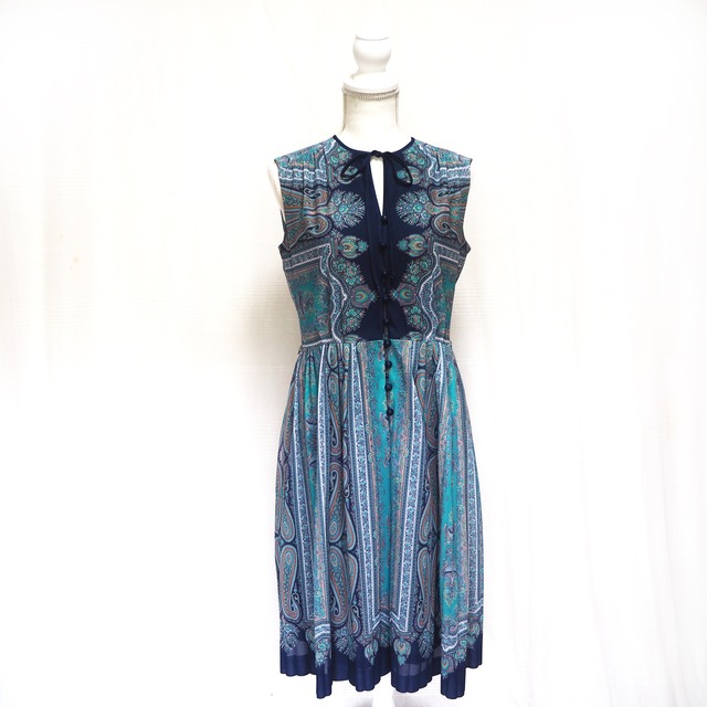 鮮やかなブルーグリーンの差し色が目を惹く、ブルーのペイズリー柄のワンピースです。 センターが開くようになっていて、ボタンとリボンでとめるスタイル。 ギャザーを多くとったスカートや、ボタンループなど、細部まで手の込んだつくりです。 透け感のある軽やかな生地で、上半身、スカートともにしっかりめの裏地がついています。 タグには西ドイツ製とあります。 4、5枚目画像が実際に近いお色味になります。 [ BRAND ] Go-KLEID [ SIZE ] 肩幅 35cm 身幅 41cm 着丈 101cm 裾幅 69cm ウエスト 39cm ※平置き採寸です。若干のずれが生じる場合がございますので予めご了承下さい。 [ MATERIAL] ポリエステル100% [ CONDITION ] A --------------------------- S : ほぼ新品同様またはタグあり未使用 A : 使用感が少なく状態が良い B : 使用感はあるが、傷や汚れが少ない C : 使用感の他、傷や汚れが見られる (画像をご確認下さい) --------------------------- 未使用のものを含め、ユーズド・セカンドハンドであることをご理解の上、ご購入下さい。ノークレーム・ノーリターンでお願いしております。 --------------------------- 商品について個別のお問い合わせはCONTACTページからご連絡ください。 ---------------------------