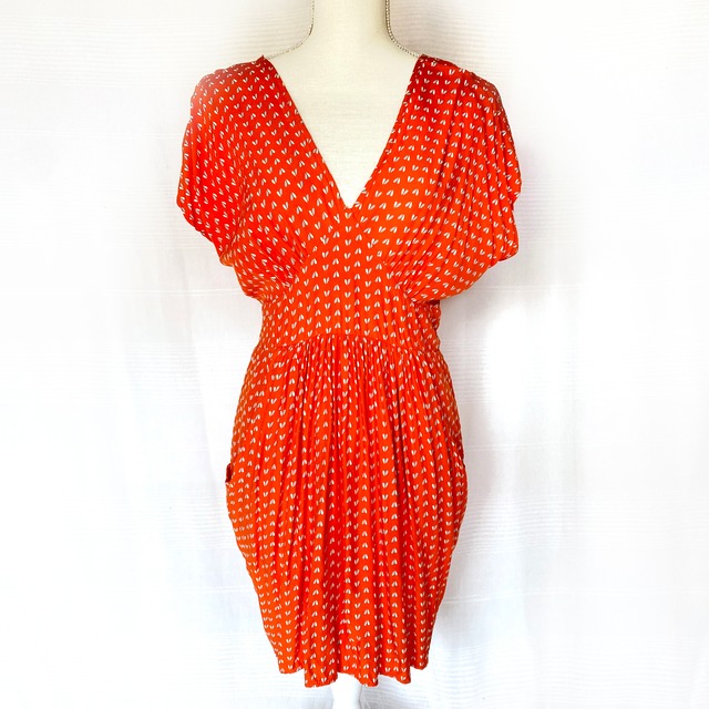 オレンジにブルー、レッドと白の鳥がプリントされたプリーツキャミソール。 シアー素材のミニ丈なので、何をあわせてどう着るか、頭を悩ませるのが楽しい一枚。 ネイビーのジャケットなどをあわせて意外なかちっと感を出しても楽しいかもしれません。 裏地はついていません。 4・5枚目画像が実際に近いお色味になります。 [ SIZE ] 表記サイズ UK12 / XL 身幅 49cm 着丈 91cm 裾幅 73cm ※平置き採寸です。若干のずれが生じる場合がございますので予めご了承下さい。 [ MATERIAL] ポリエステル100% [ CONDITION ] A --------------------------- S : ほぼ新品同様またはタグあり未使用 A : 使用感が少なく状態が良い B : 使用感はあるが、傷や汚れが少ない C : 使用感の他、傷や汚れが見られる (画像をご確認下さい) --------------------------- 未使用のものを含め、ユーズド・セカンドハンドであることをご理解の上、ご購入下さい。ノークレーム・ノーリターンでお願いしております。 --------------------------- 商品について個別のお問い合わせはCONTACTページからご連絡ください。 ---------------------------