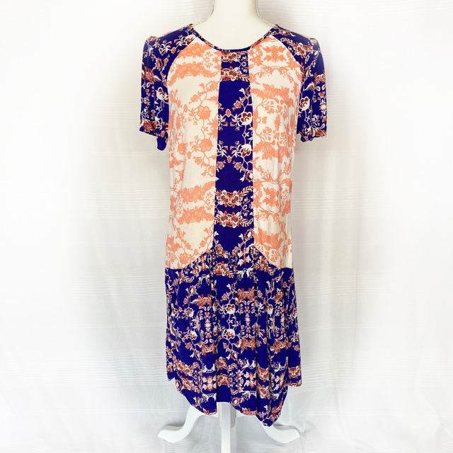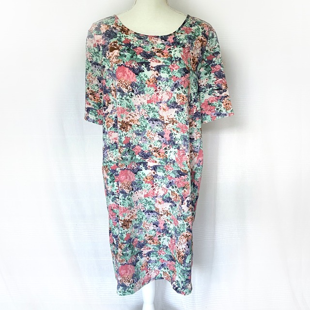 しゃりしゃりとした落ち感のある生地にヴィヴィッドなプリントの切り替えのワンピース。 低めの重心のフレアがかわいい一枚です。 しわにもなりづらく、リラックスして着ていただけそうな生地とシルエット。 透け感はほぼなく、裏地はついていません。 4・5枚目画像が実際に近いお色味になります。 [ BRAND ] Marks & Spencer [ SIZE ] 表記サイズ UK10 / EU38 肩幅 38cm 身幅 46cm 着丈 94cm 裾幅 68cm ※平置き採寸です。若干のずれが生じる場合がございますので予めご了承下さい。 [ MATERIAL] ビスコース100% [ CONDITION ] A --------------------------- S : ほぼ新品同様またはタグあり未使用 A : 使用感が少なく状態が良い B : 使用感はあるが、傷や汚れが少ない C : 使用感の他、傷や汚れが見られる (画像をご確認下さい) --------------------------- 未使用のものを含め、ユーズド・セカンドハンドであることをご理解の上、ご購入下さい。ノークレーム・ノーリターンでお願いしております。 --------------------------- 商品について個別のお問い合わせはCONTACTページからご連絡ください。 ---------------------------