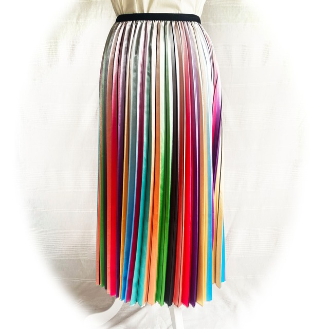 光沢のある生地にレインボーカラーをプリントしたスカート。 裾の始末は写真を参照ください(7,8枚目) 透け感はなく、裏地がついています。 光沢の加減によって見え隠れする薄い汚れがあります(10,11枚目参照) ウエストゴムは細いので、伸び感がややきつめに感じられるかもしれません。 9枚目画像が実際に近いお色味になります。 [ SIZE ] ウエスト 54cm-90cm 着丈 78cm 裾幅 98cm ※平置き採寸です。若干のずれが生じる場合がございますので予めご了承下さい。 [ MATERIAL] ポリエステル 100% [ CONDITION ] C --------------------------- S : ほぼ新品同様またはタグあり未使用 A : 使用感が少なく状態が良い B : 使用感はあるが、傷や汚れが少ない C : 使用感の他、傷や汚れが見られる (画像をご確認下さい) --------------------------- 未使用のものを含め、ユーズド・セカンドハンドであることをご理解の上、ご購入下さい。ノークレーム・ノーリターンでお願いしております。 --------------------------- 商品について個別のお問い合わせはCONTACTページからご連絡ください。 ---------------------------