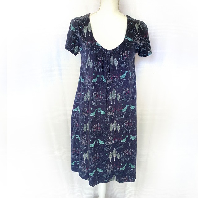 スタンプで押したような、鳥と森の柄のプリントがかわいいAラインのチュニックワンピース。 長めのTシャツのようにらくちんスタイルで着こなせそう。 生地の特性上やや使用感が感じられます。 透け感はほぼなく、裏地はついていません。 4・5枚目画像が実際に近いお色味になります。 [ BRAND ] Mistral [ SIZE ] 表記サイズ UK12 肩幅 40cm 身幅 42cm 着丈 88cm 裾幅 65cm ※平置き採寸です。若干のずれが生じる場合がございますので予めご了承下さい。 [ MATERIAL] コットン100% [ CONDITION ] B --------------------------- S : ほぼ新品同様またはタグあり未使用 A : 使用感が少なく状態が良い B : 使用感はあるが、傷や汚れが少ない C : 使用感の他、傷や汚れが見られる (画像をご確認下さい) --------------------------- 未使用のものを含め、ユーズド・セカンドハンドであることをご理解の上、ご購入下さい。ノークレーム・ノーリターンでお願いしております。 --------------------------- 商品について個別のお問い合わせはCONTACTページからご連絡ください。 ---------------------------