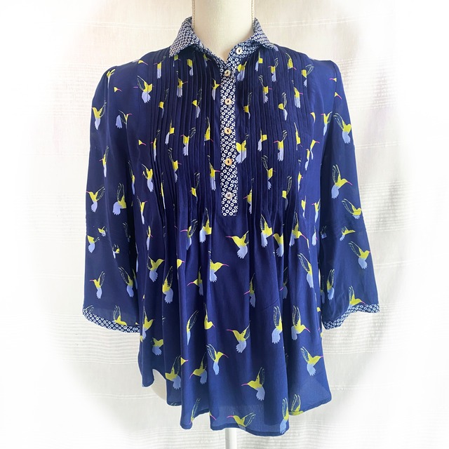 ネイビーにビビッドなイエローグリーンとブルー、くちばしがピンクの鳥のパターンのシルク素材のプルオーバー。 襟と袖元の切り替え柄や、胸元や袖のピンタックと、デザインも盛り込んだ一枚。 軽く薄い生地ですが、透け感はありません。 5、6枚目画像が実際に近いお色味になります。 [ BRAND ] mercy delta [ SIZE ] 表記サイズ XS 肩幅 40cm 身幅 48cm 着丈 61cm ※平置き採寸です。若干のずれが生じる場合がございますので予めご了承下さい。 [ MATERIAL] シルク100% [ CONDITION ] A --------------------------- S : ほぼ新品同様またはタグあり未使用 A : 使用感が少なく状態が良い B : 使用感はあるが、傷や汚れが少ない C : 使用感の他、傷や汚れが見られる (画像をご確認下さい) --------------------------- 未使用のものを含め、ユーズド・セカンドハンドであることをご理解の上、ご購入下さい。ノークレーム・ノーリターンでお願いしております。 --------------------------- 商品について個別のお問い合わせはCONTACTページからご連絡ください。 ---------------------------