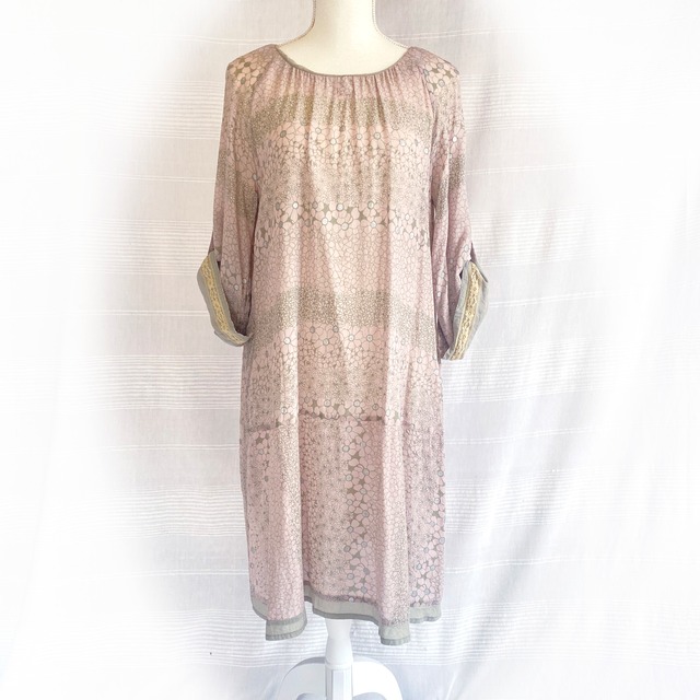 さりさりとした薄く軽いベージュの生地に、くすんだカーキでフラワーモチーフがプリントされた一枚。 ところどころ散らされたシルバーも不思議と涼し気な雰囲気。 生地全体に使用感と褪色した風合いがありますが、目立つ汚れなどはありません。 4・5枚目画像が実際に近いお色味になります。 [ BRAND ] FANAKA [ SIZE ] 肩幅 44cm 身幅 47cm 着丈 94cm 裾幅 77cm ※平置き採寸です。若干のずれが生じる場合がございますので予めご了承下さい。 [ MATERIAL] レーヨン65% コットン35% [ CONDITION ] B --------------------------- S : ほぼ新品同様またはタグあり未使用 A : 使用感が少なく状態が良い B : 使用感はあるが、傷や汚れが少ない C : 使用感の他、傷や汚れが見られる (画像をご確認下さい) --------------------------- 未使用のものを含め、ユーズド・セカンドハンドであることをご理解の上、ご購入下さい。ノークレーム・ノーリターンでお願いしております。 --------------------------- 商品について個別のお問い合わせはCONTACTページからご連絡ください。 ---------------------------