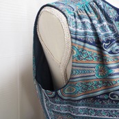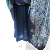 鮮やかなブルーグリーンの差し色が目を惹く、ブルーのペイズリー柄のワンピースです。