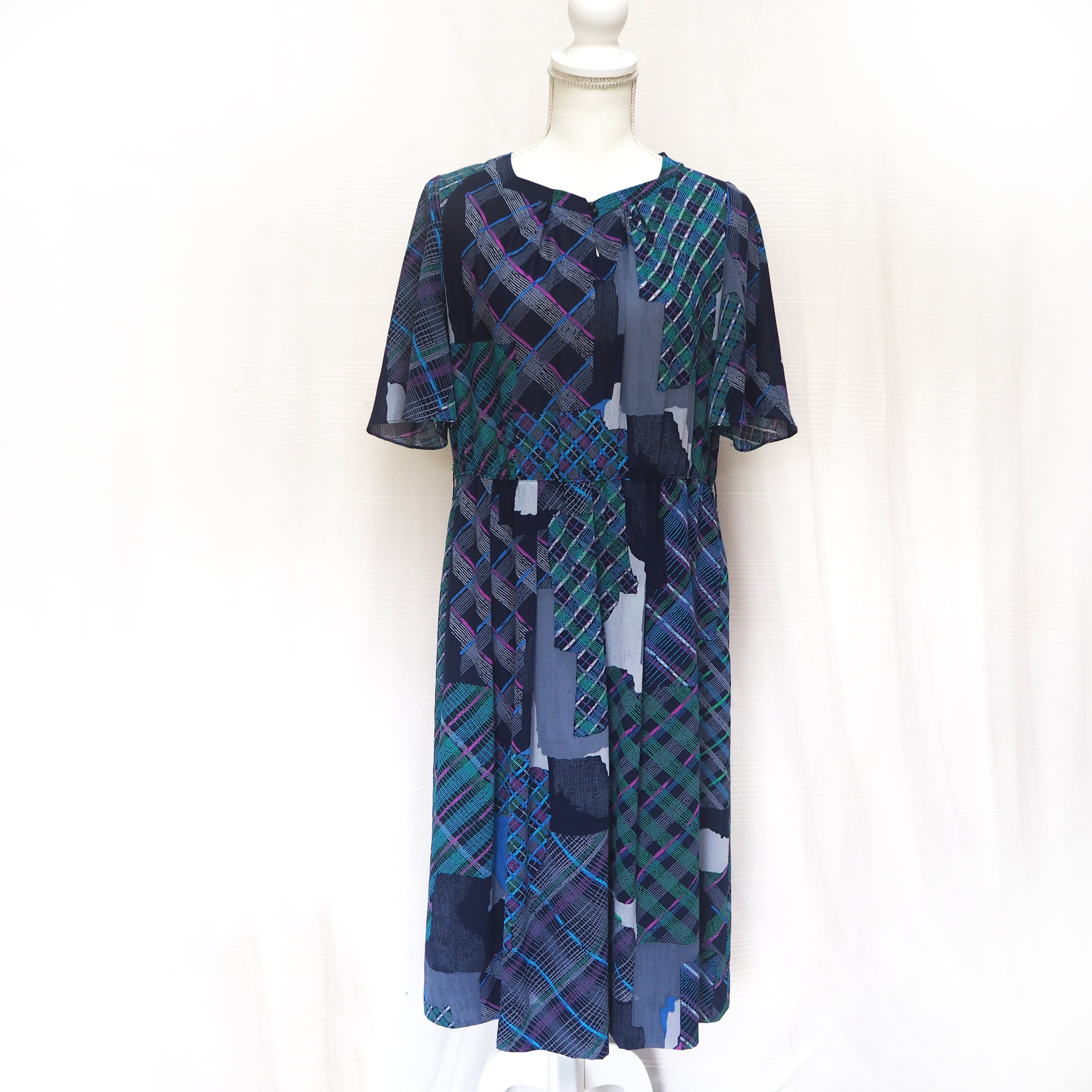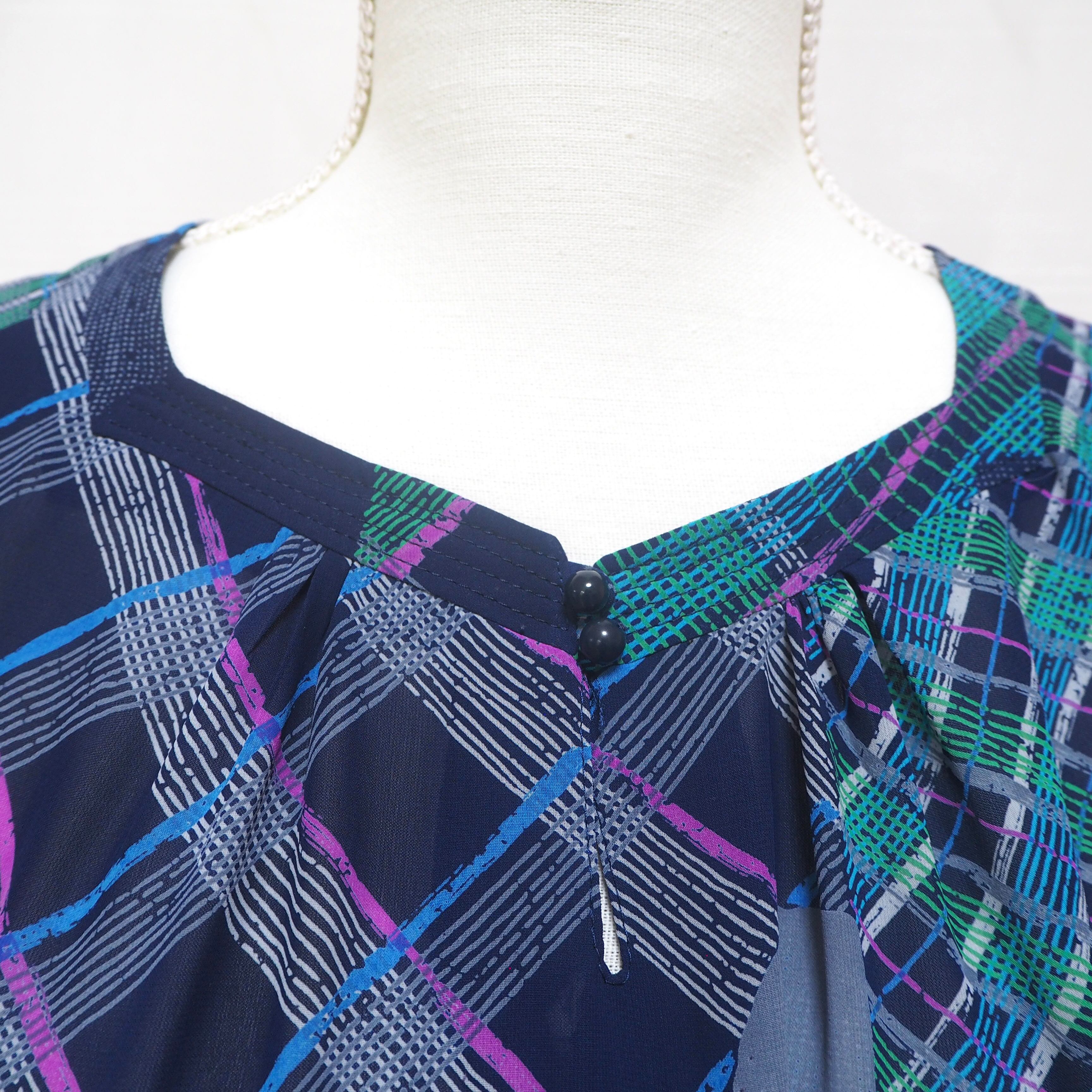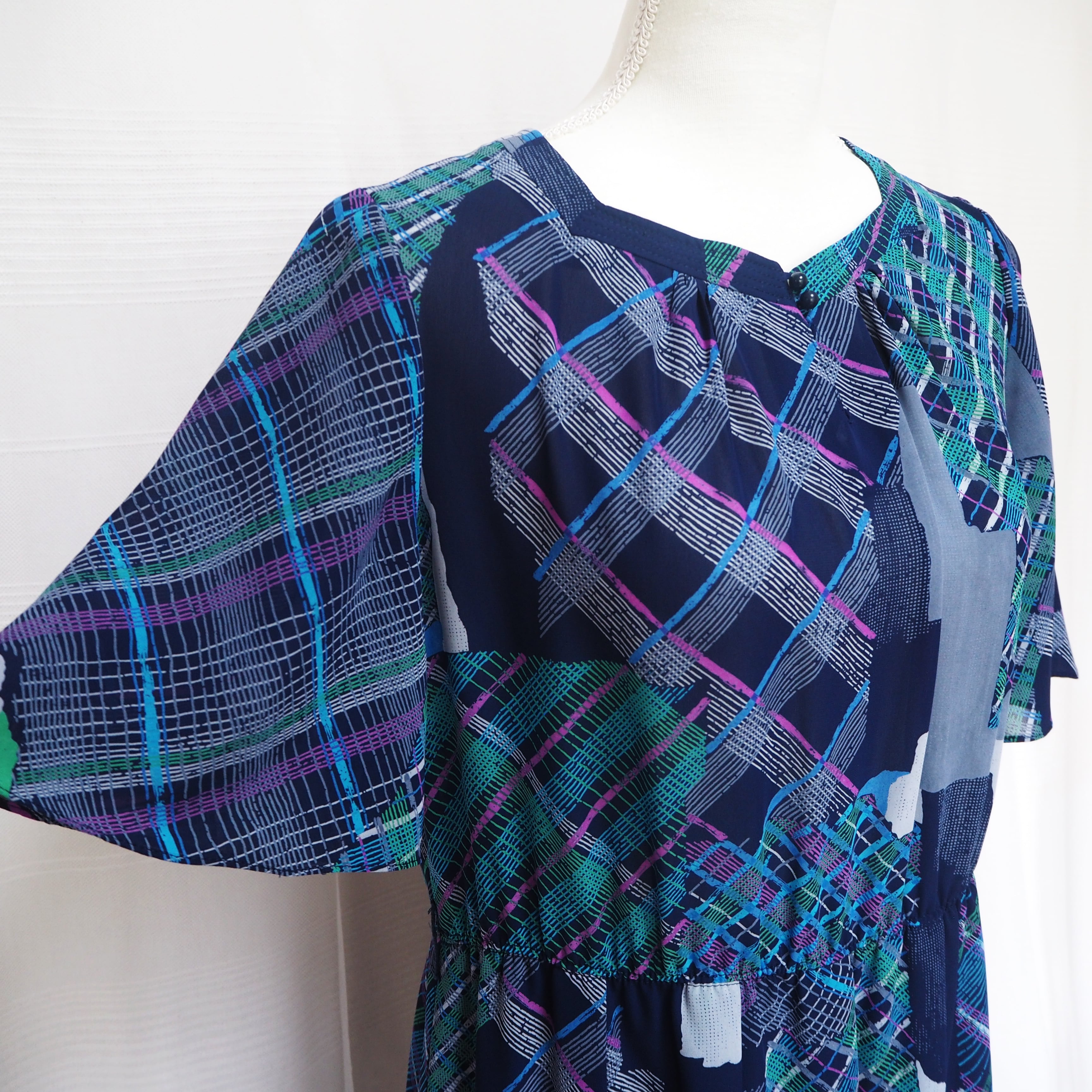 ネイビー、グリーン、パープルのランダムチェックのワンピース。
