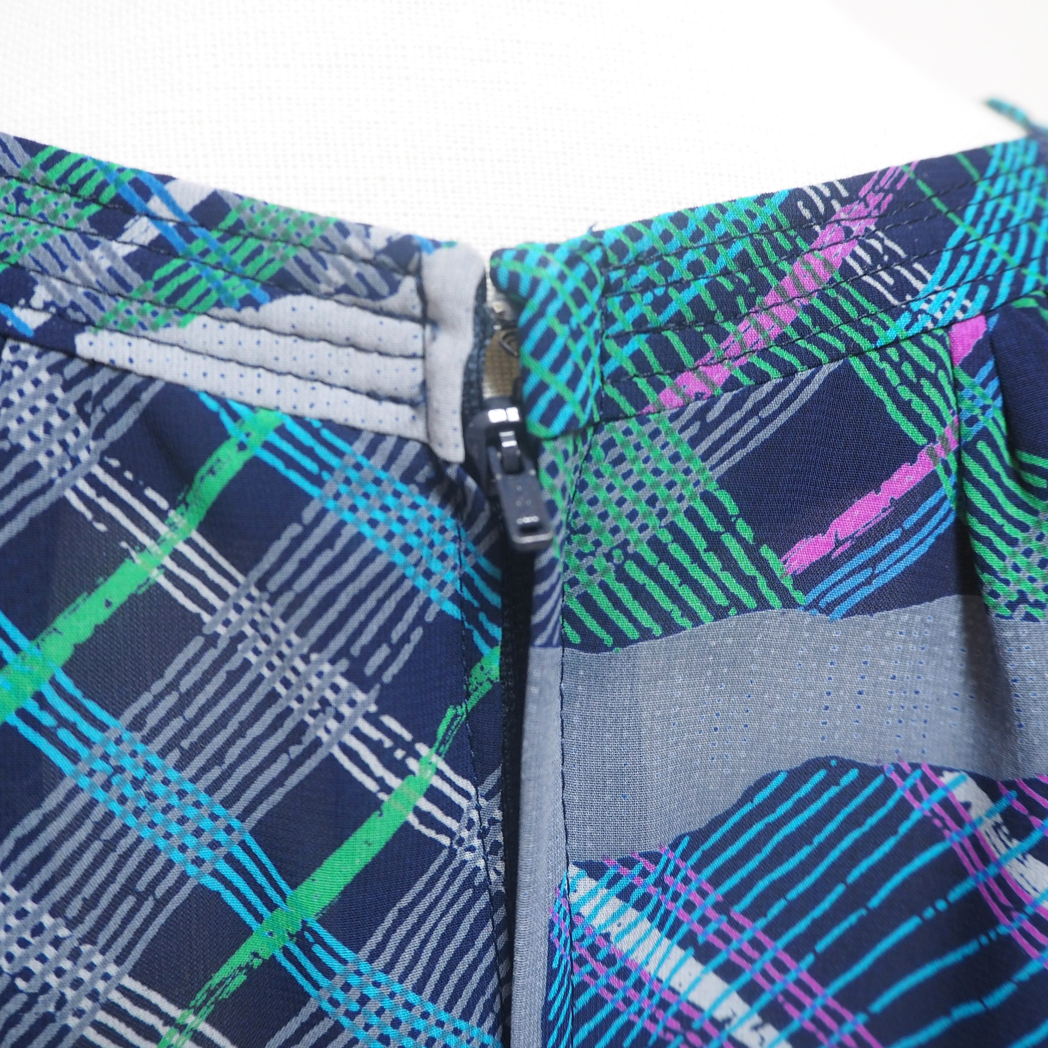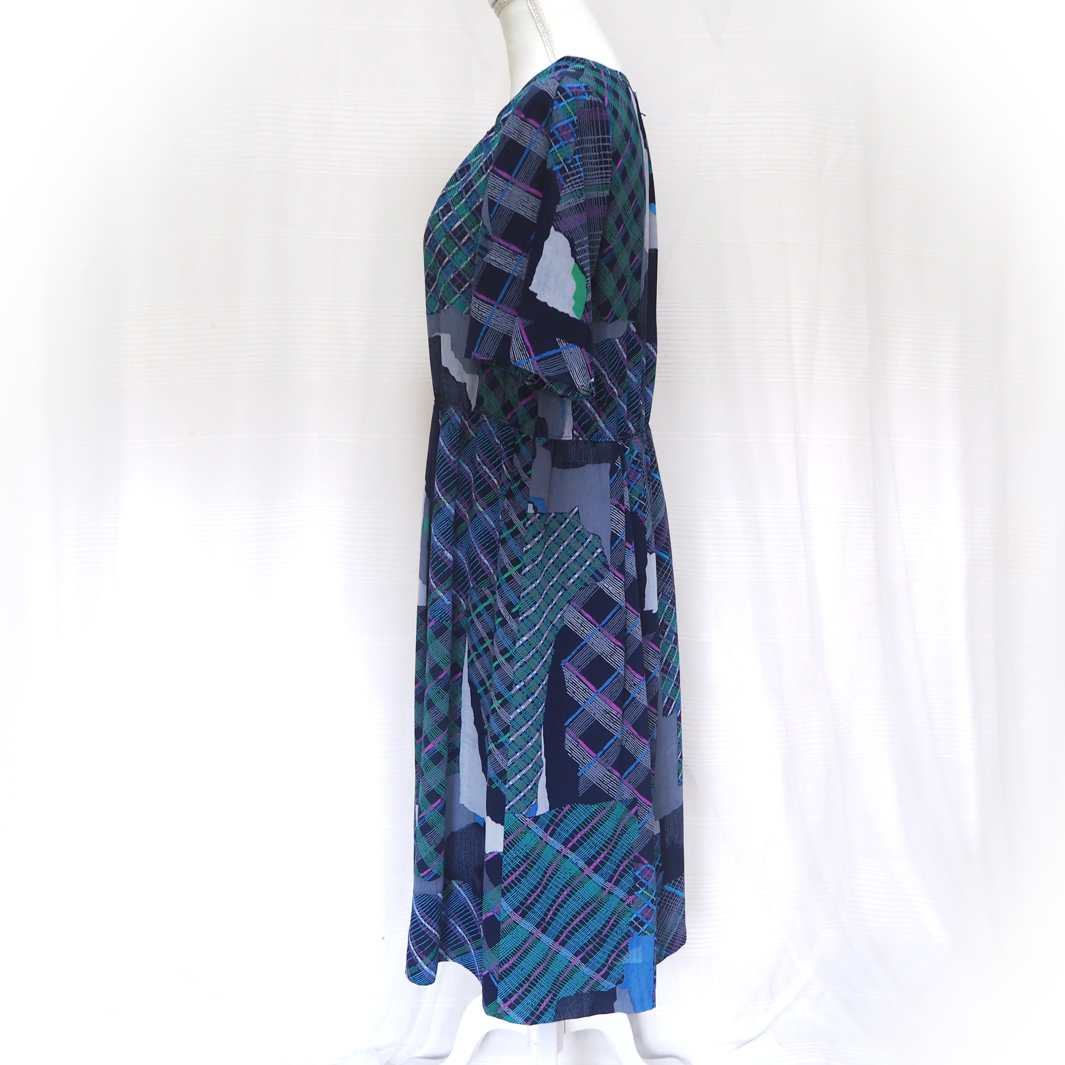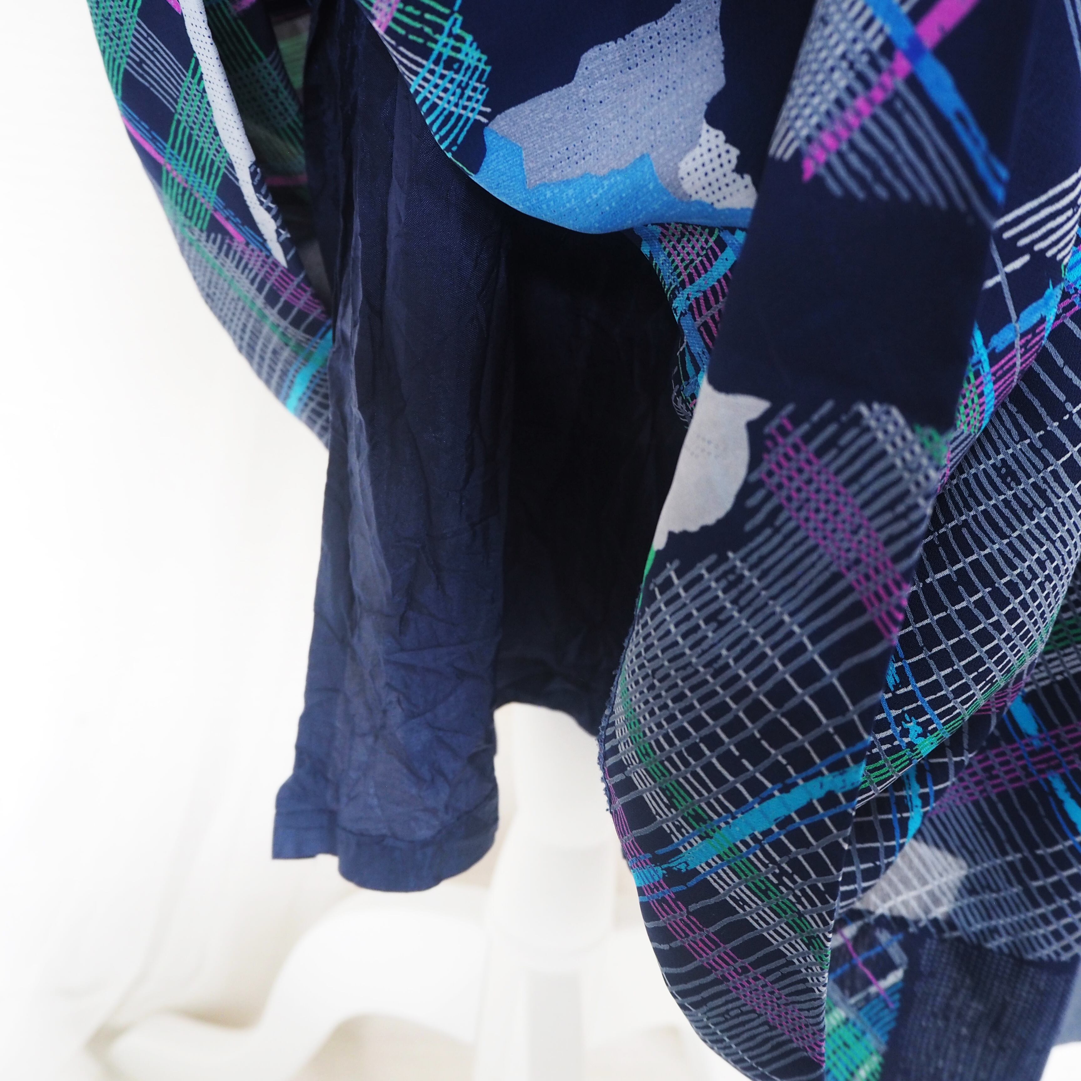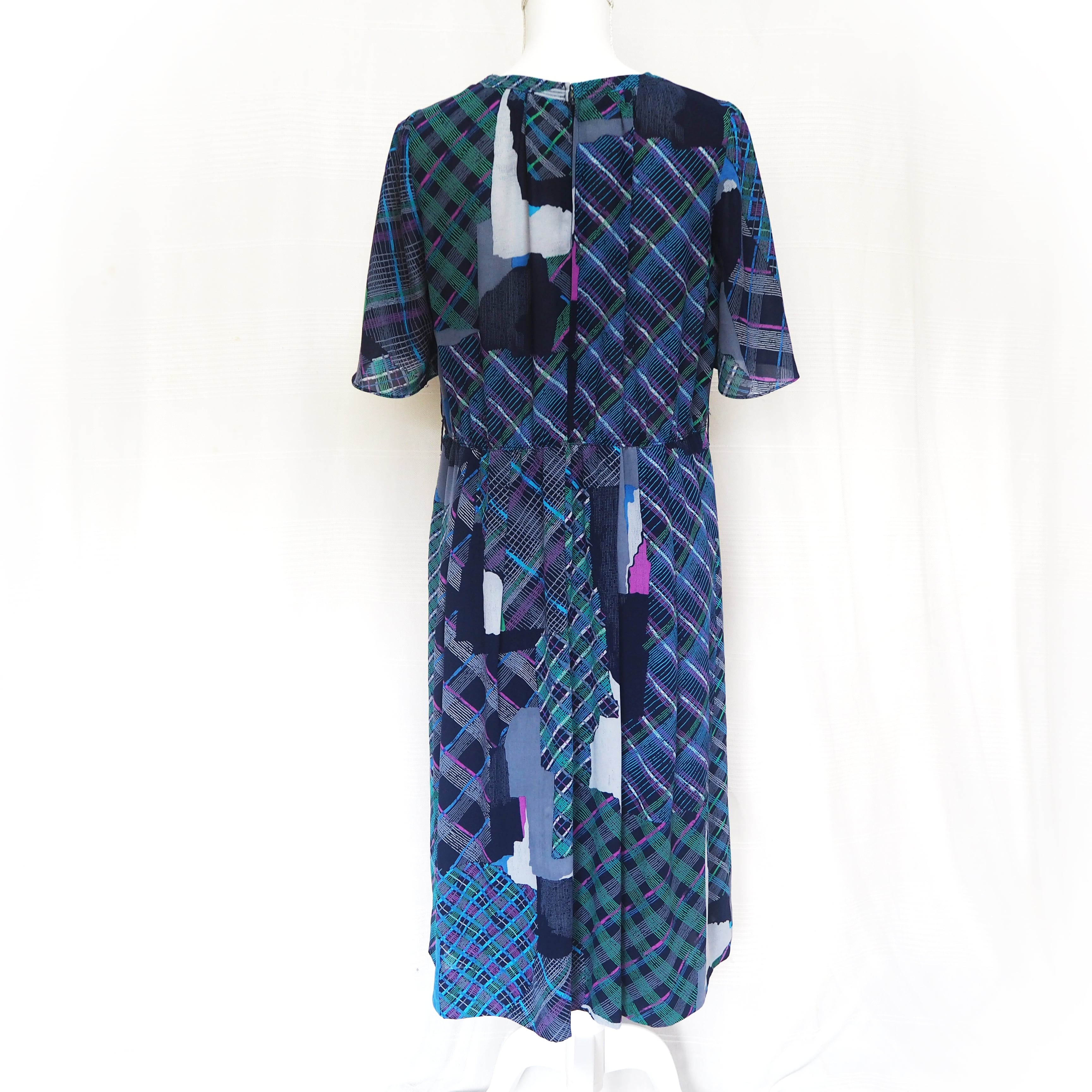 ネイビー、グリーン、パープルのランダムチェックのワンピース。