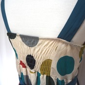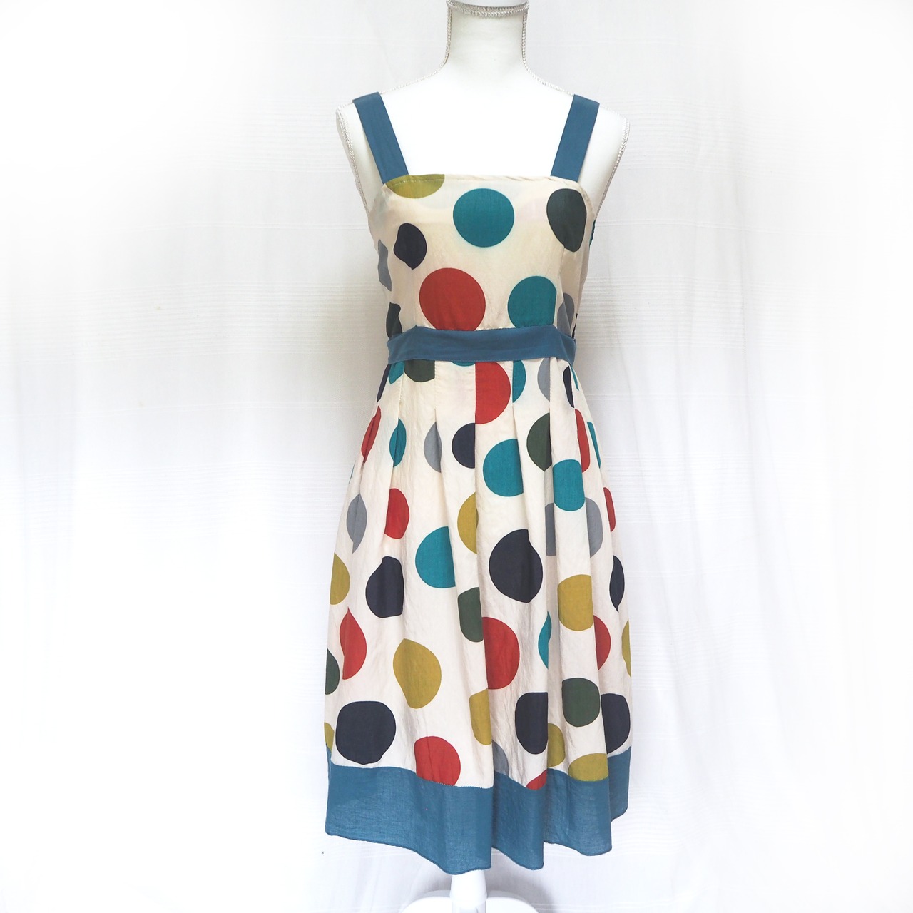 ヴィヴィッドなマルチカラーのドットが目を惹くストラップワンピース。