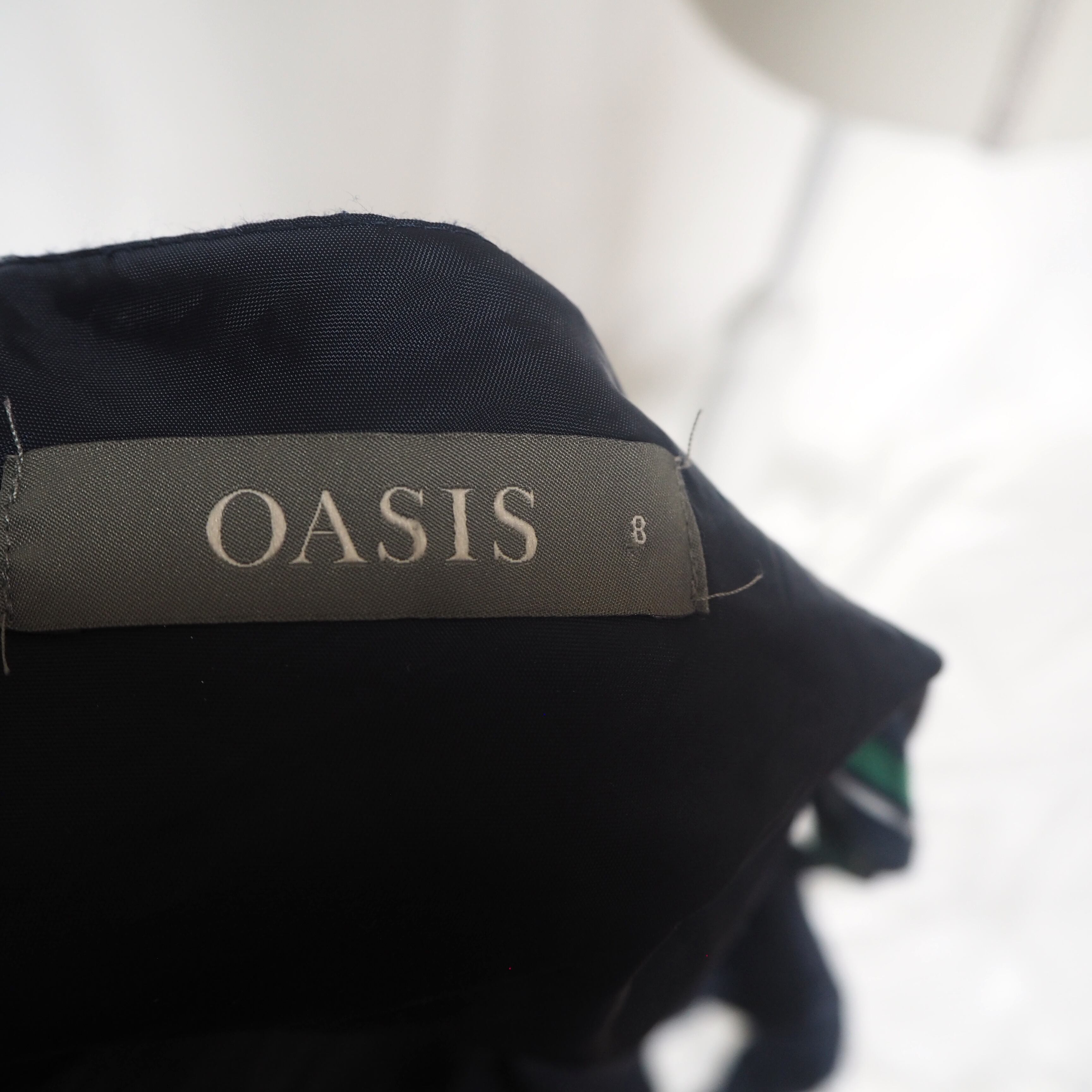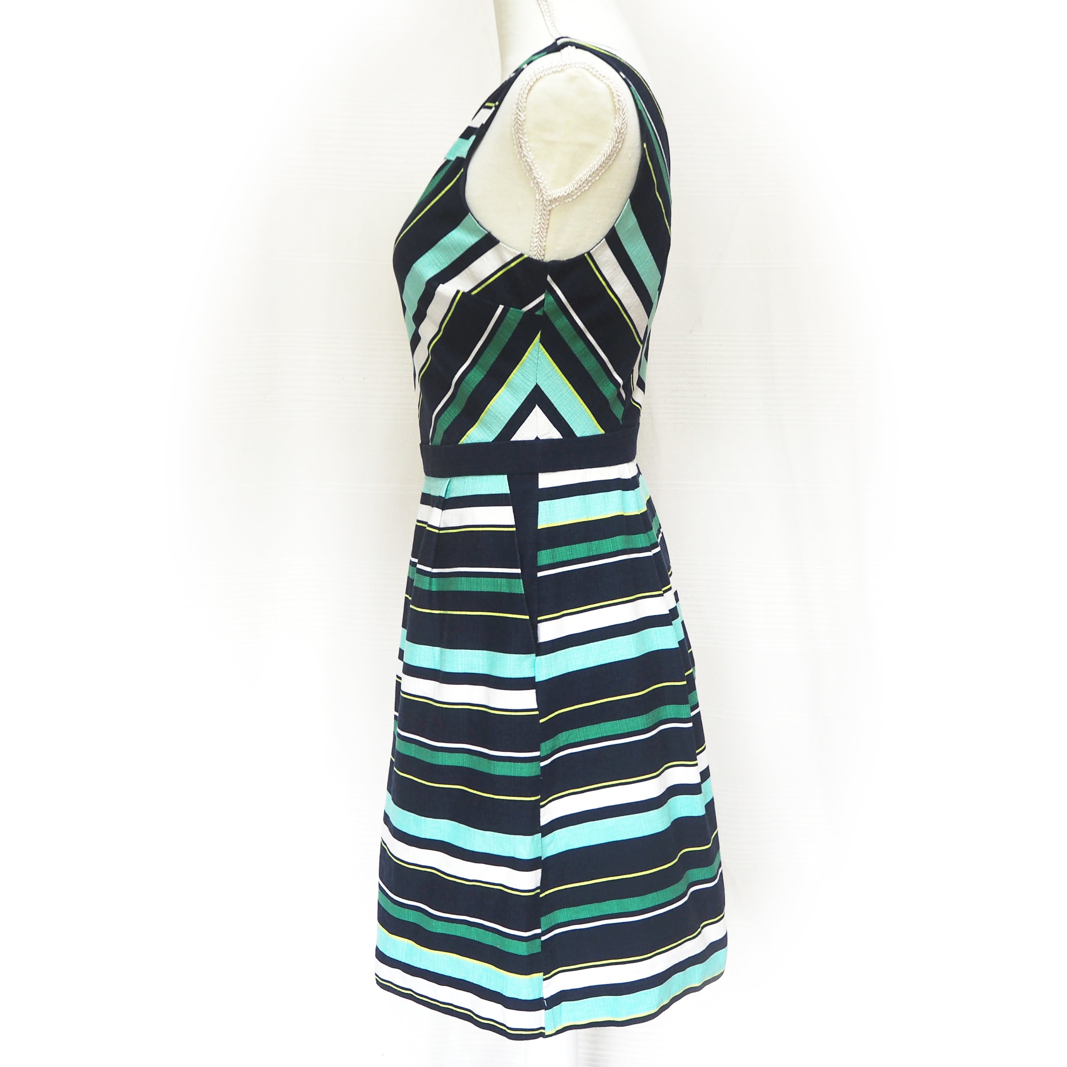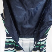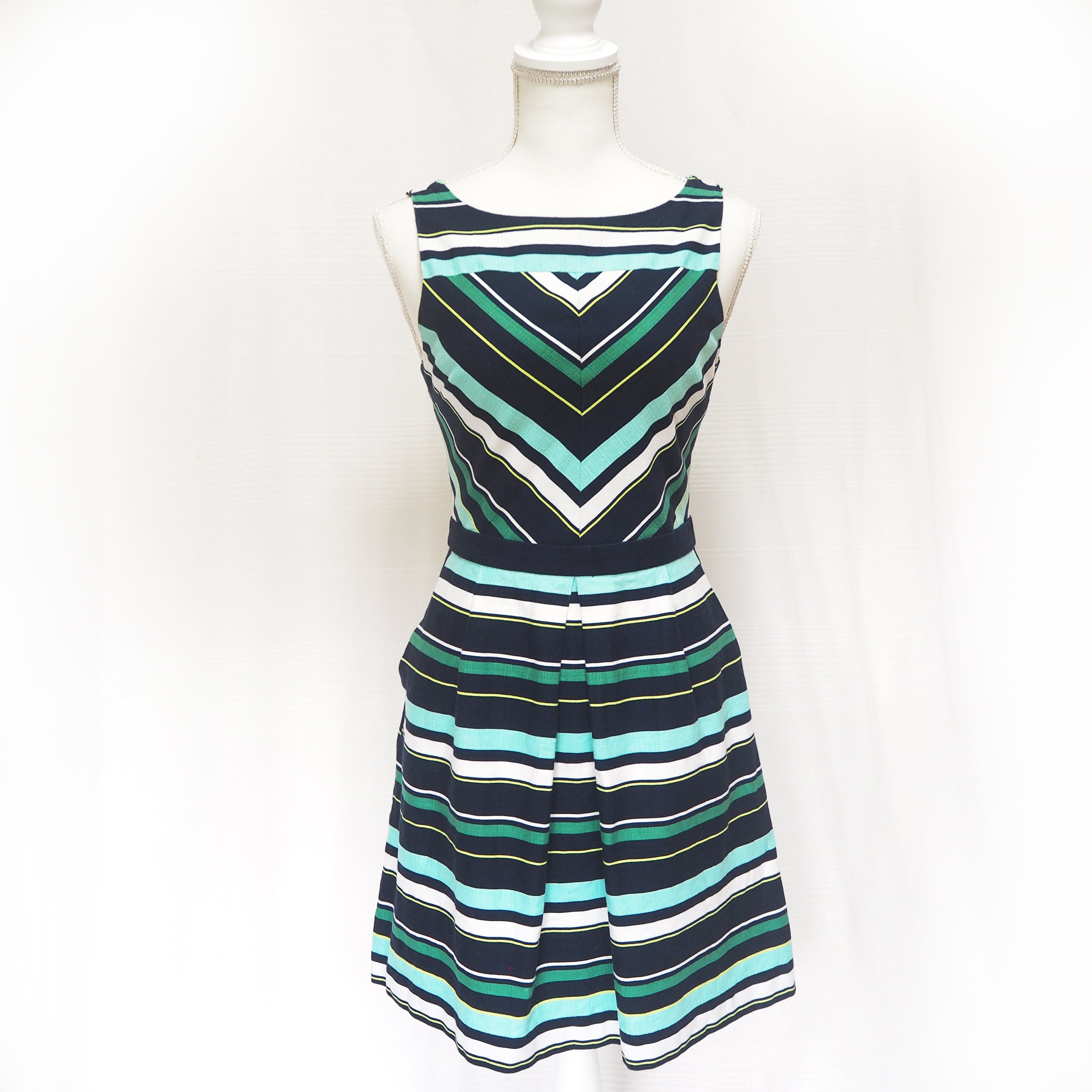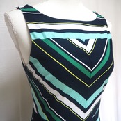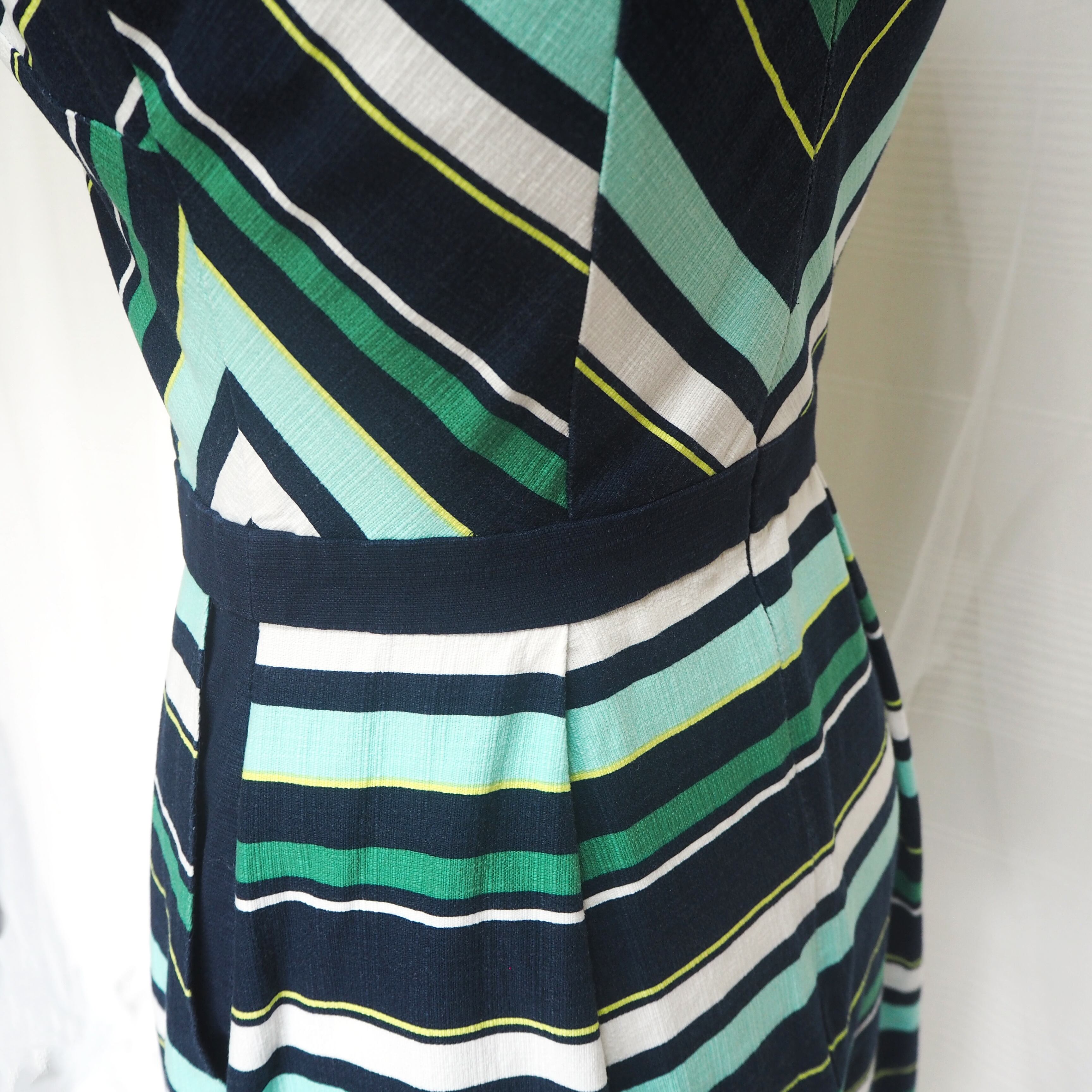 明るい水色とグリーン、ネイビー、ホワイトのシャープなストライプのワンピース。