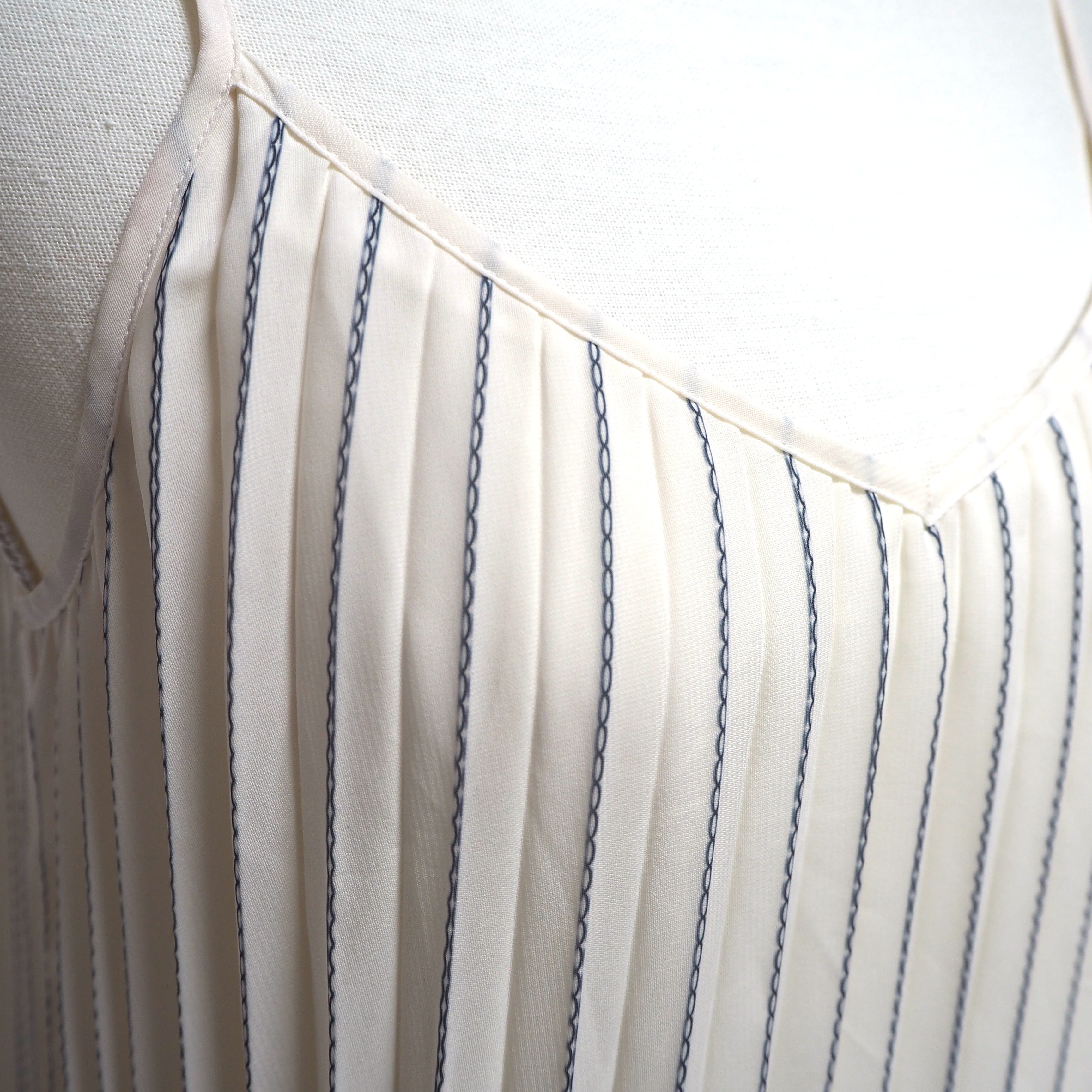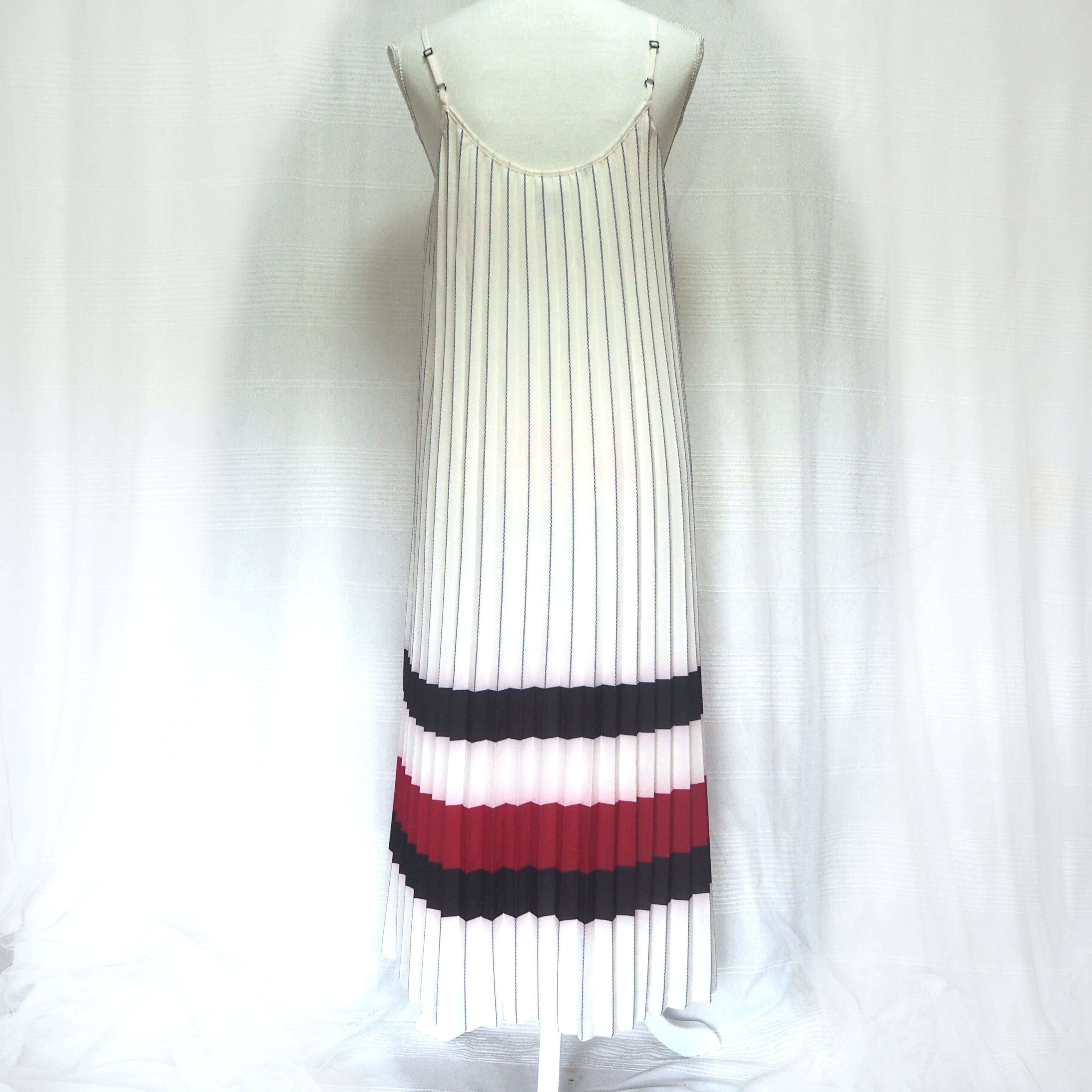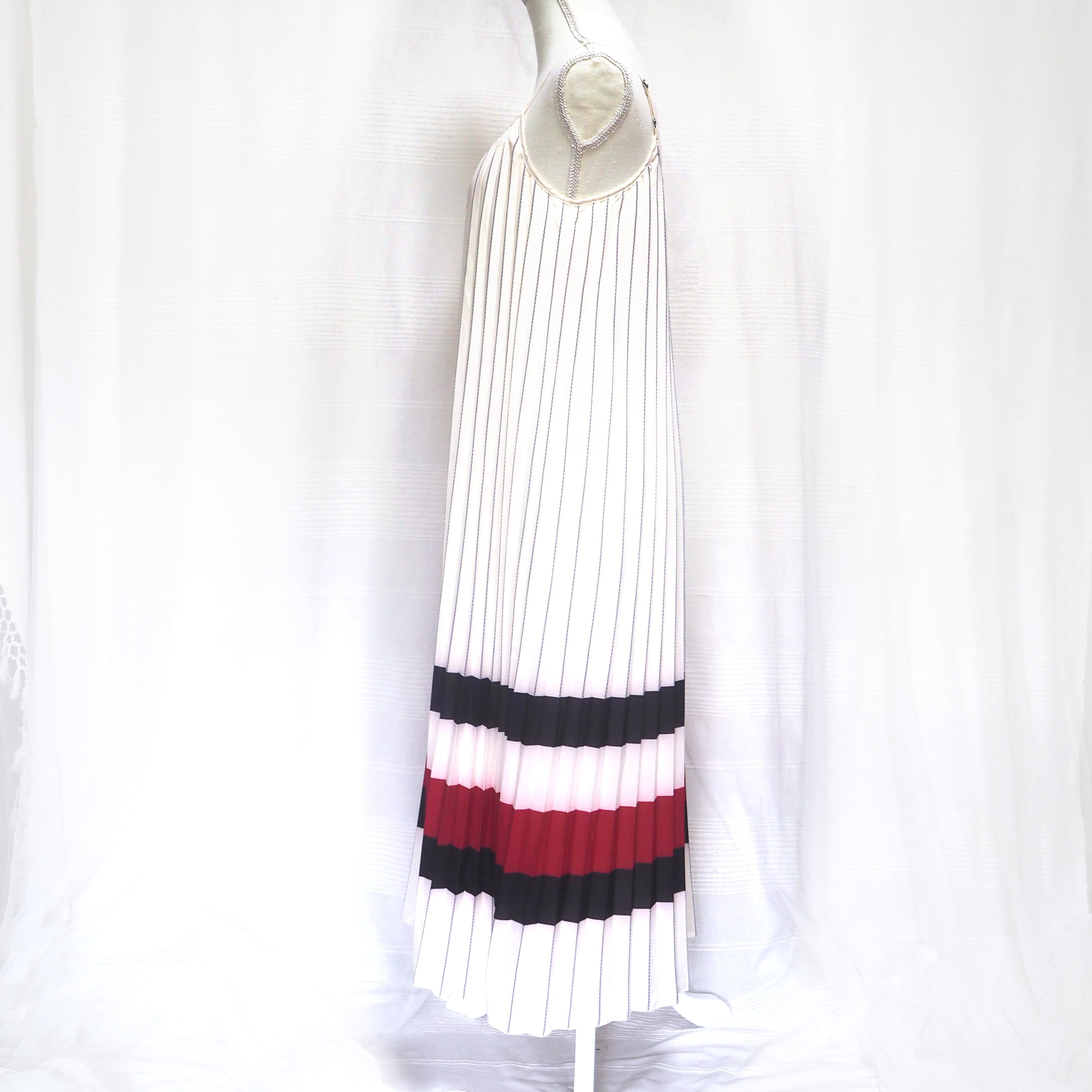 爽やかな白のプリーツに、ネイビーの縦模様、裾はトリコロールのはっきりした配色のロングワンピース。