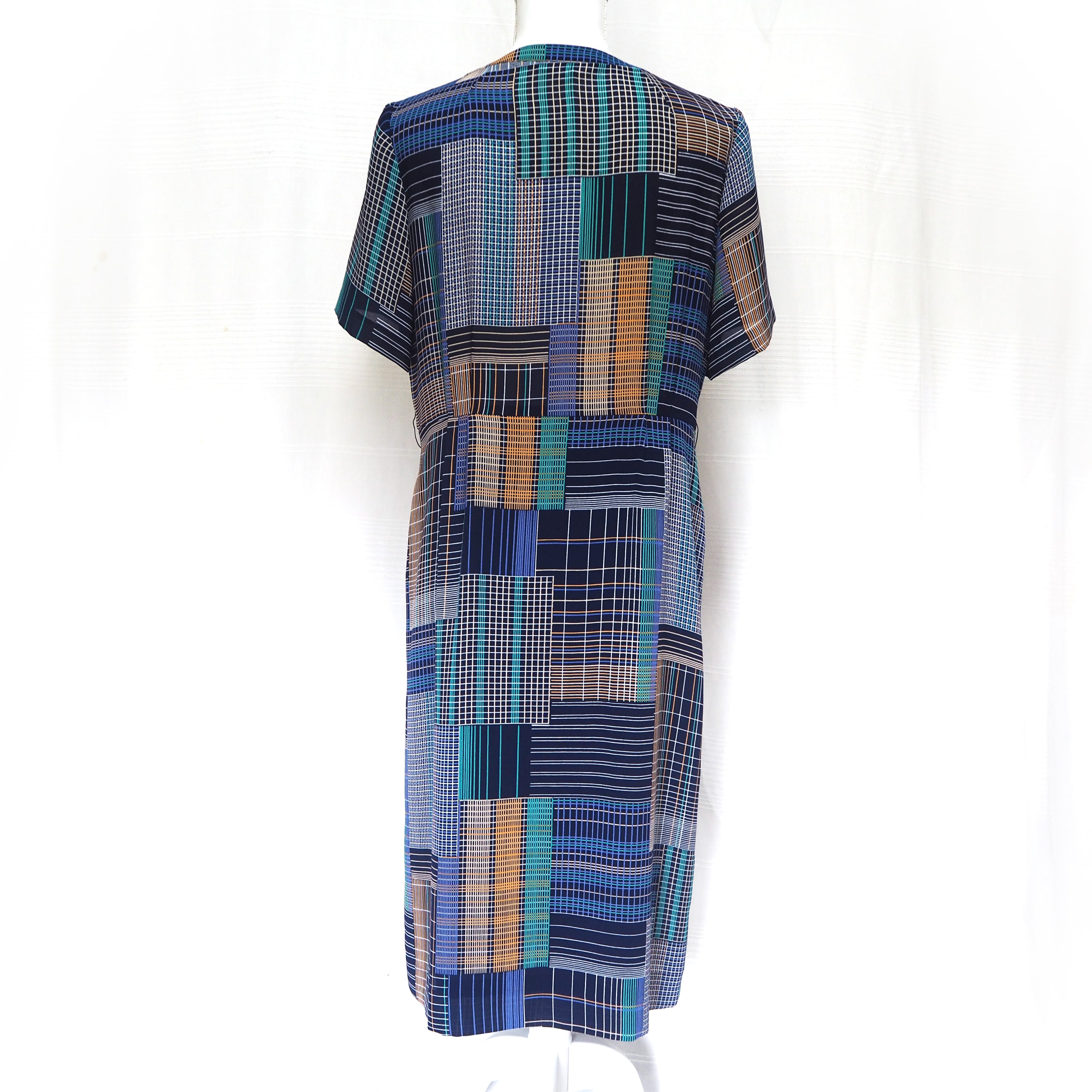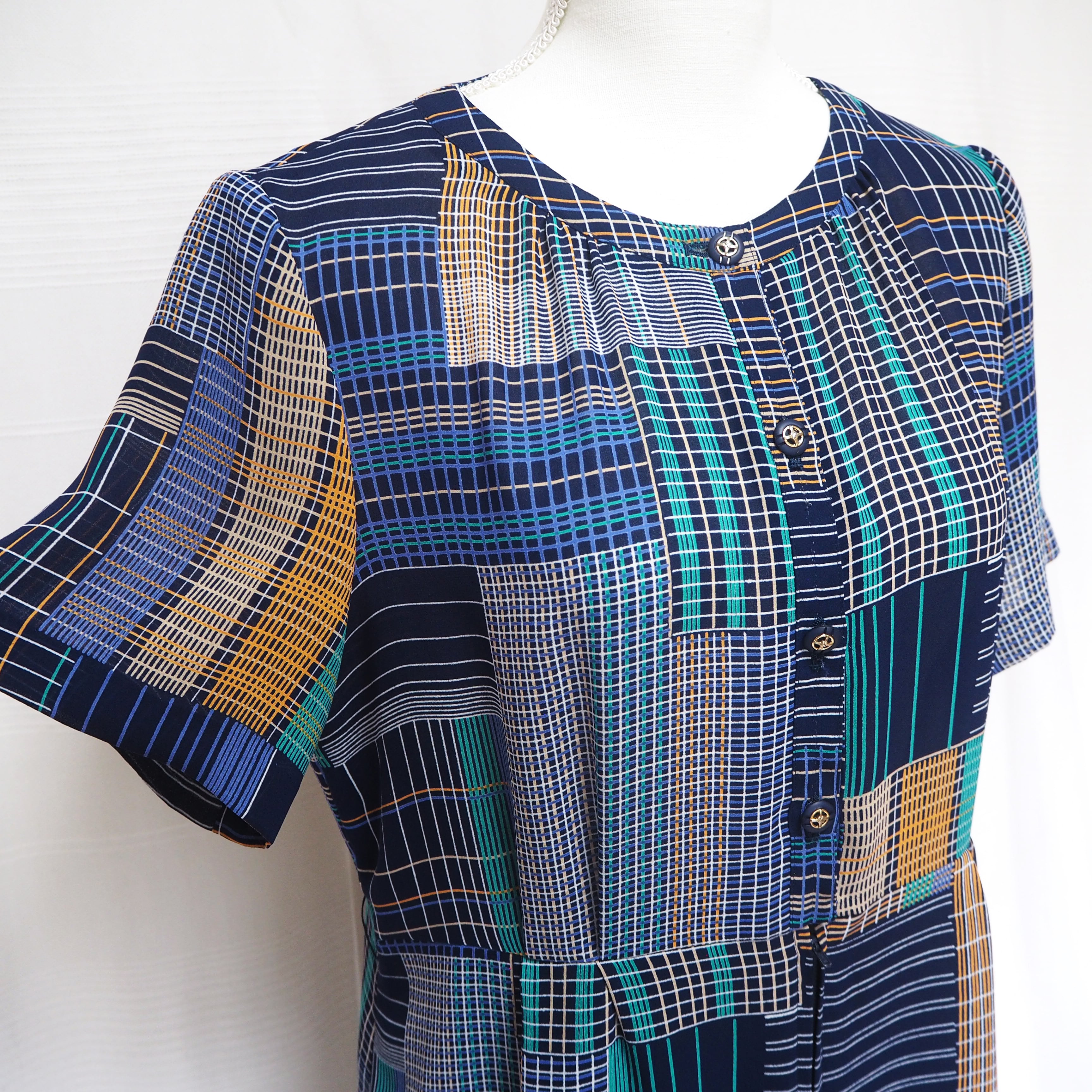 ネイビー、グリーン、イエローのランダムチェックのワンピース。
