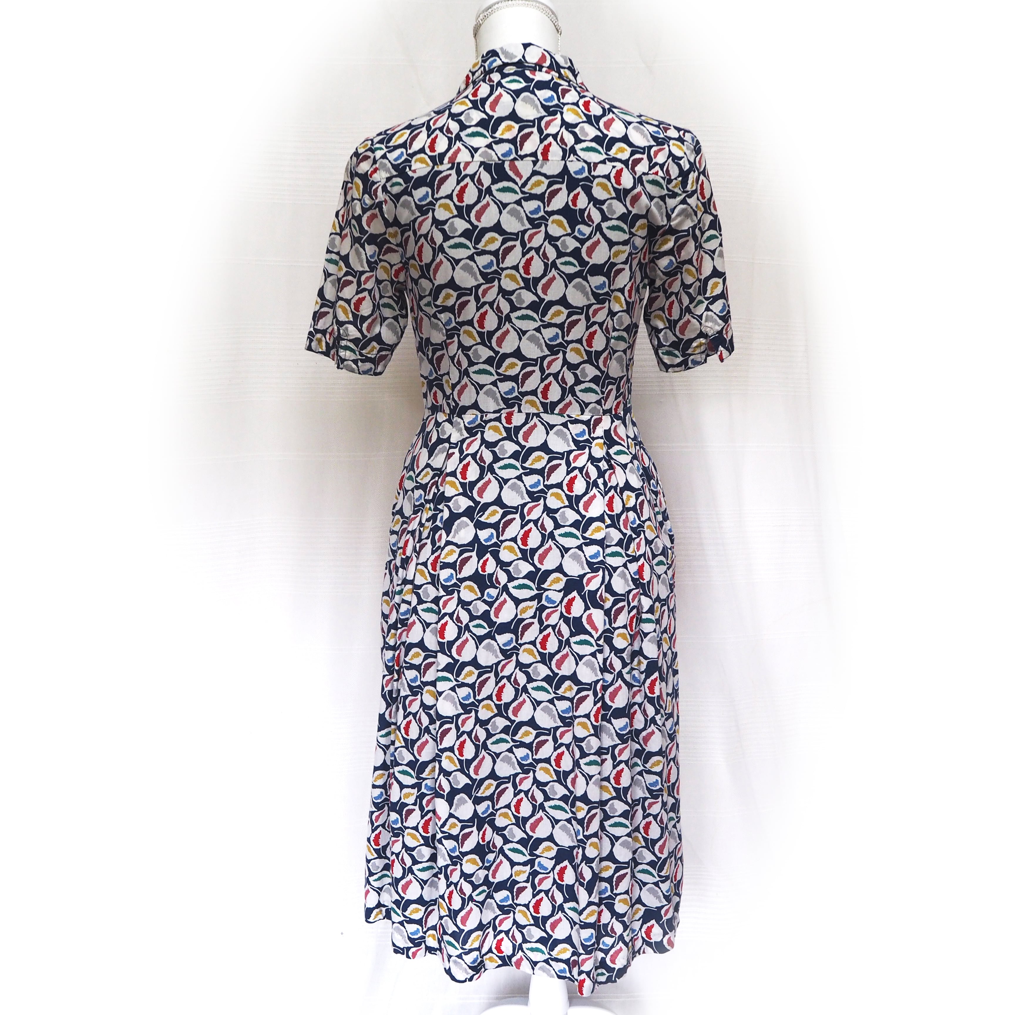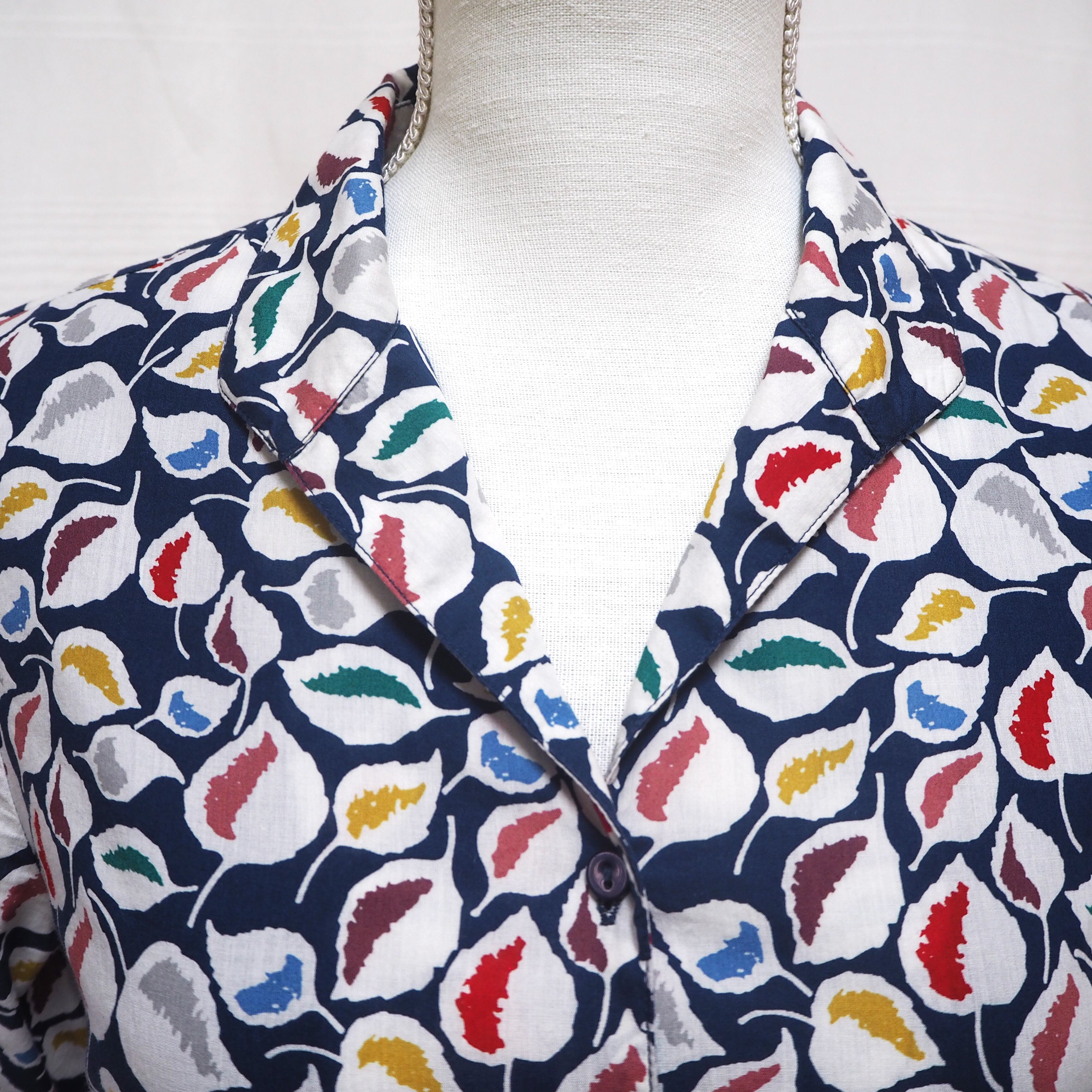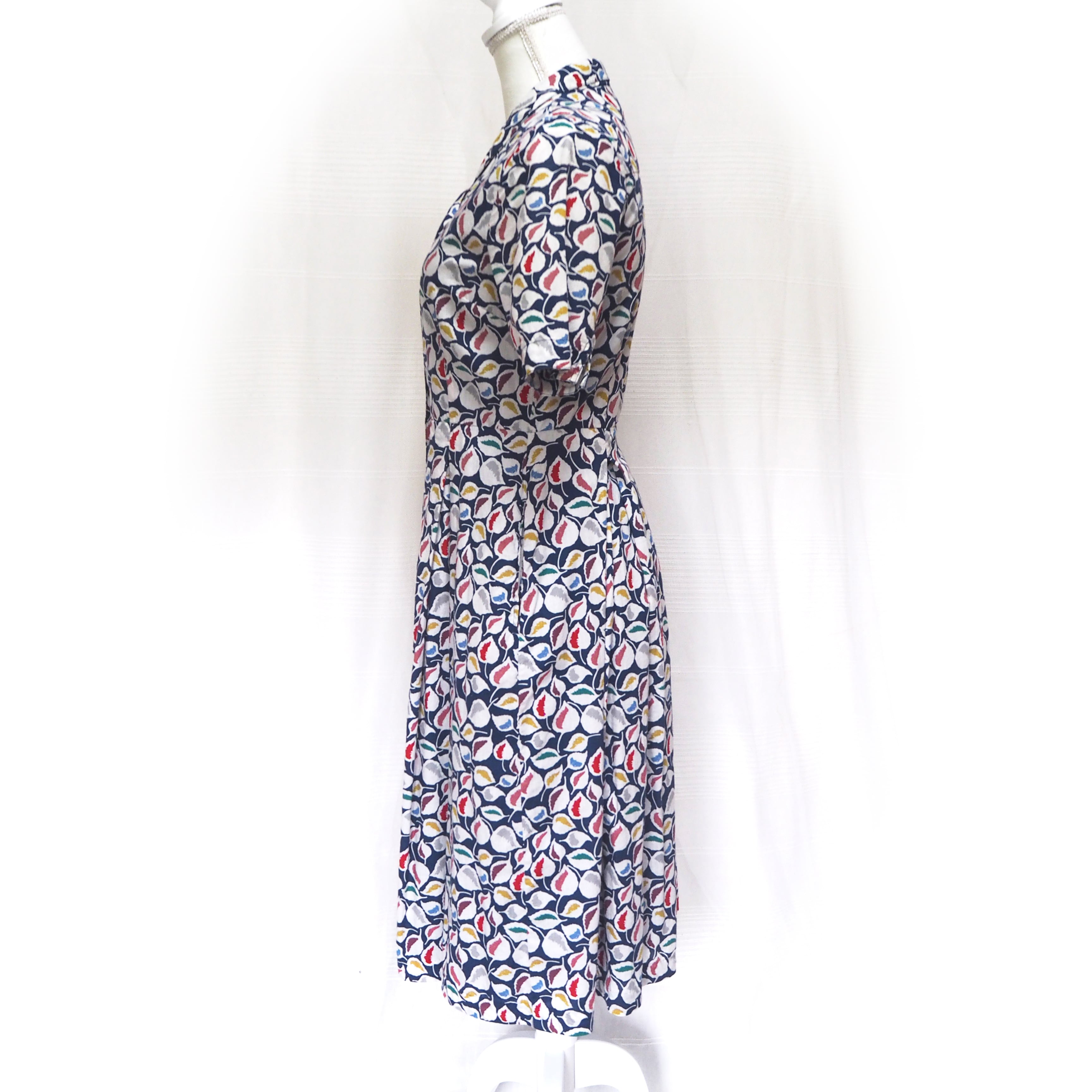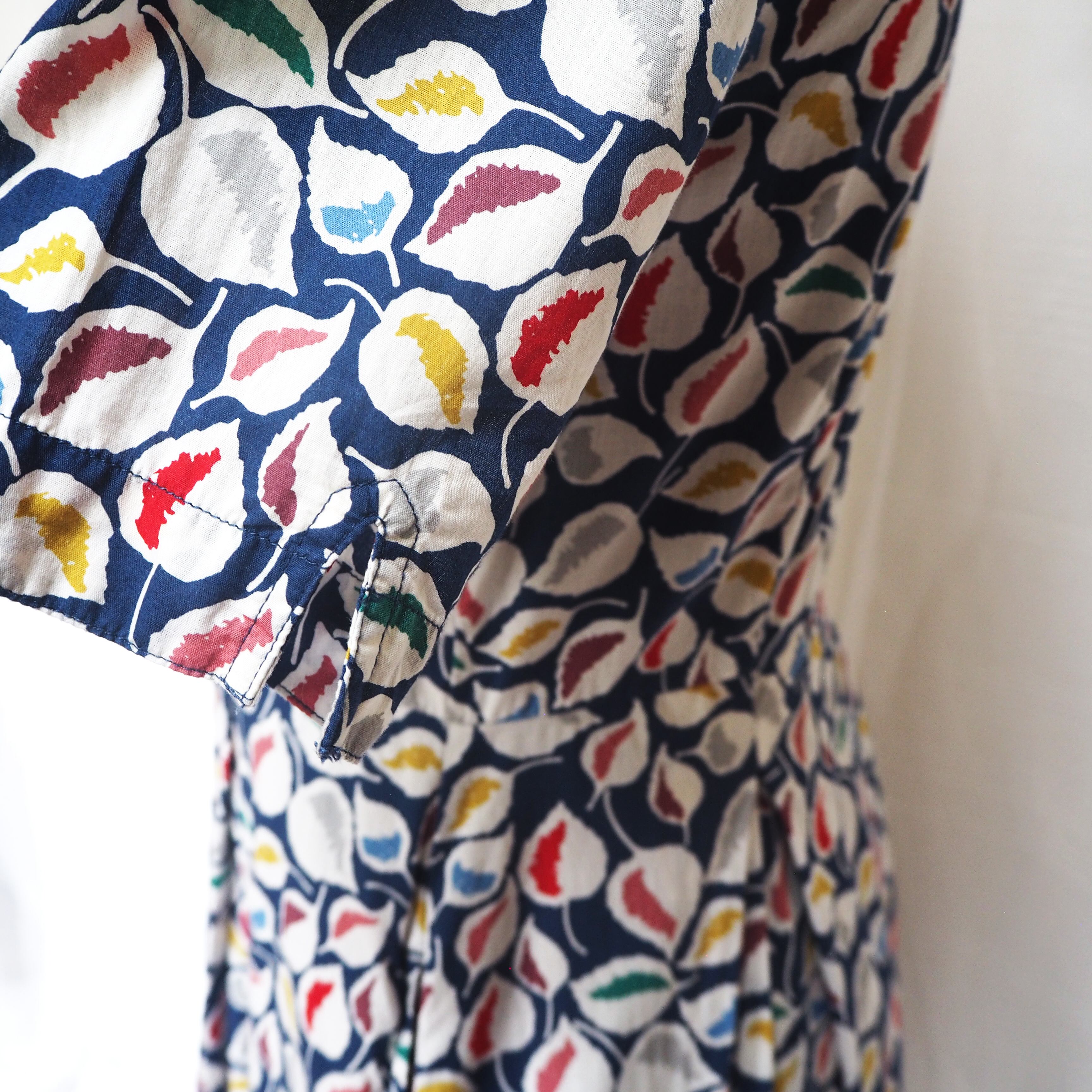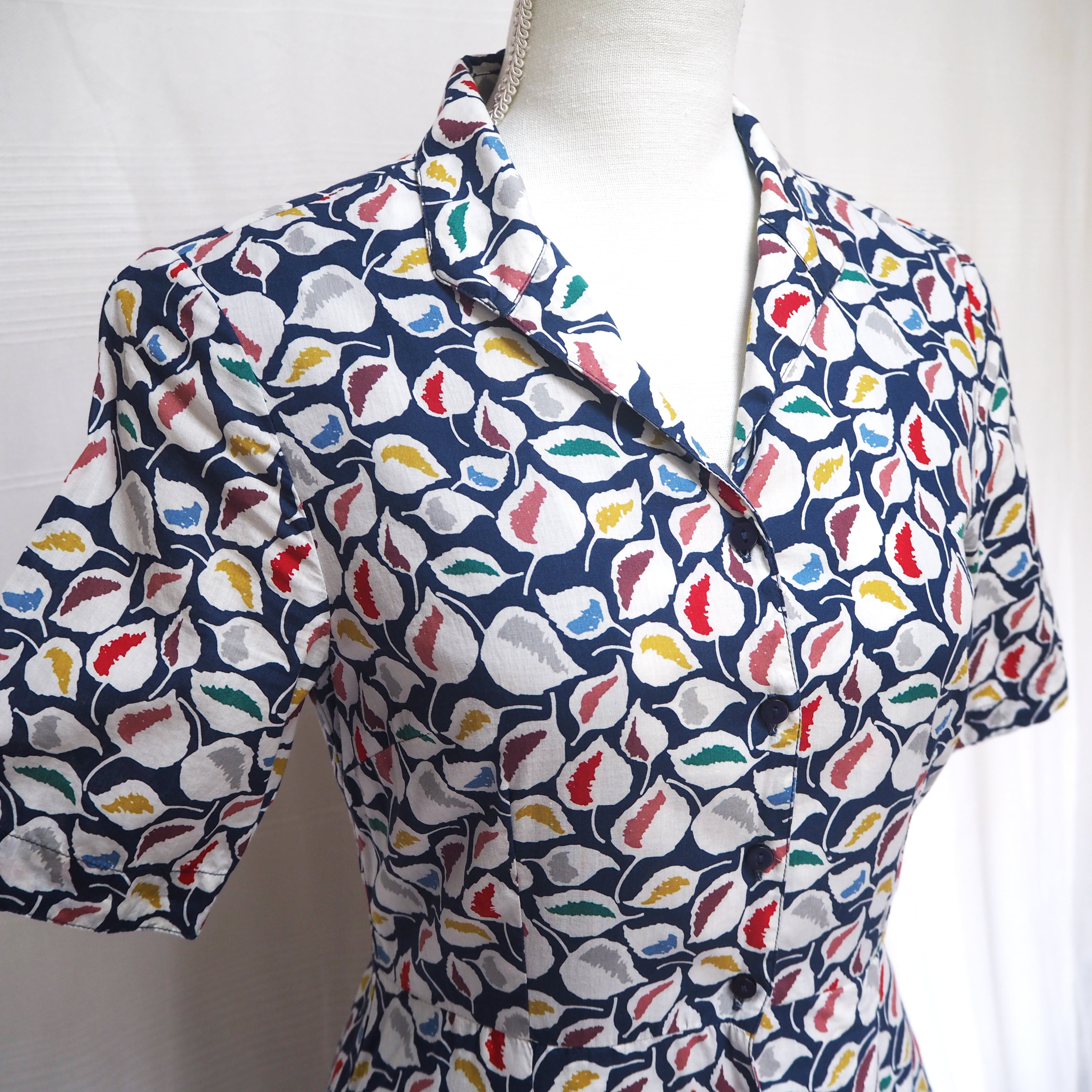 襟と、絞ったウエストからのフレアなシルエットのレトロ感と、ヴィヴィットなマルチカラーの対比が目をひくワンピース。これだけで主役になれる一枚です。
