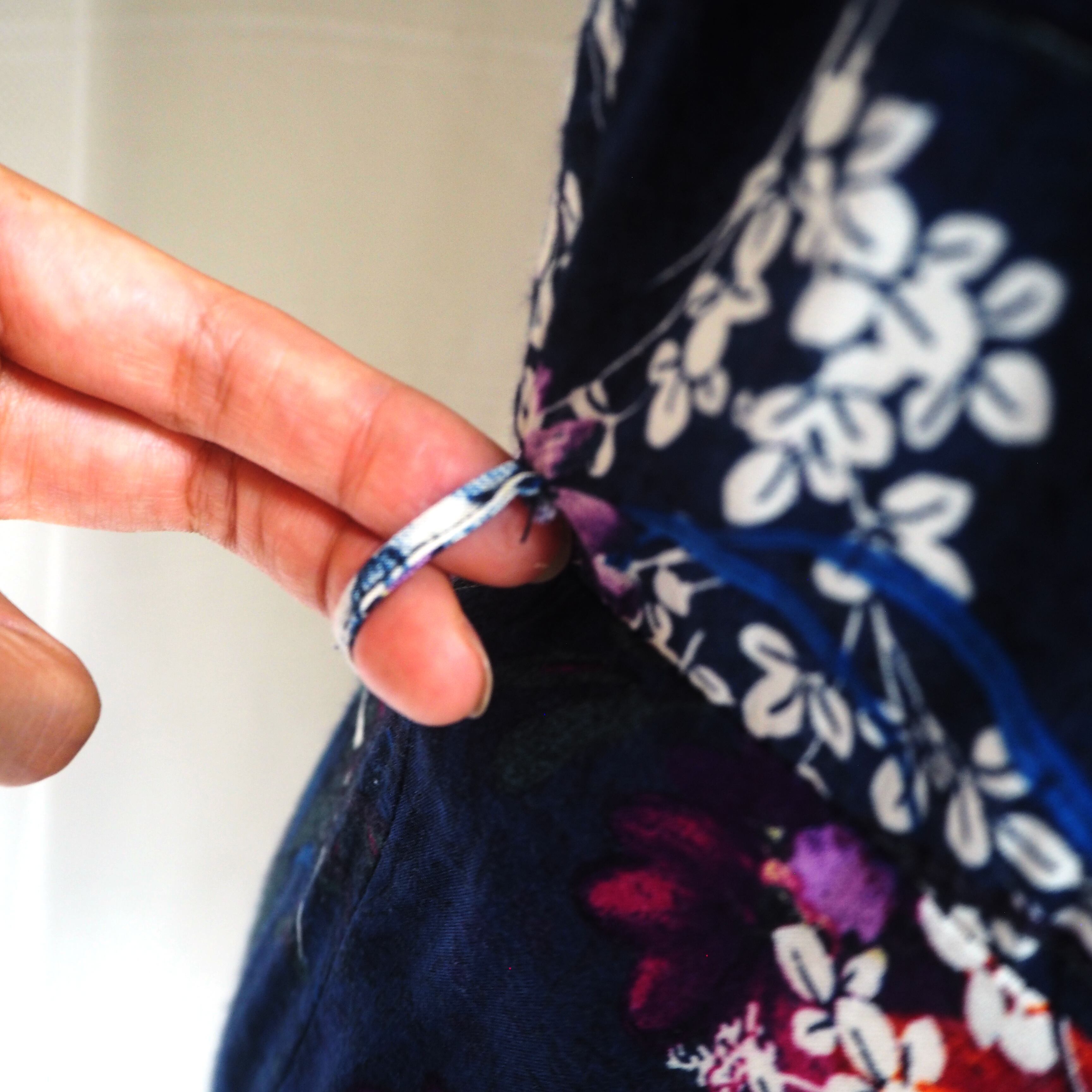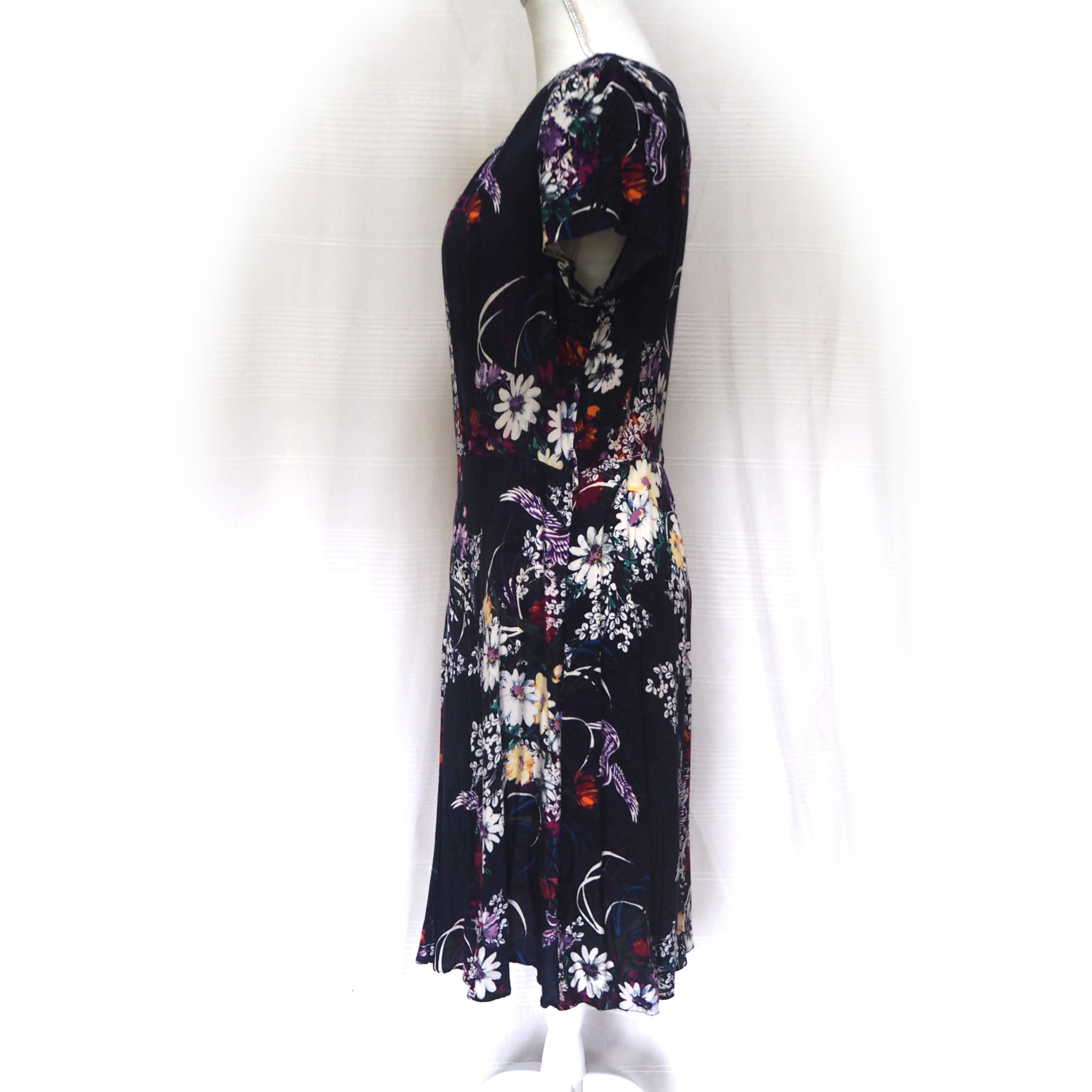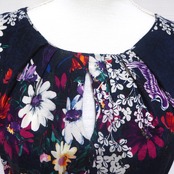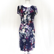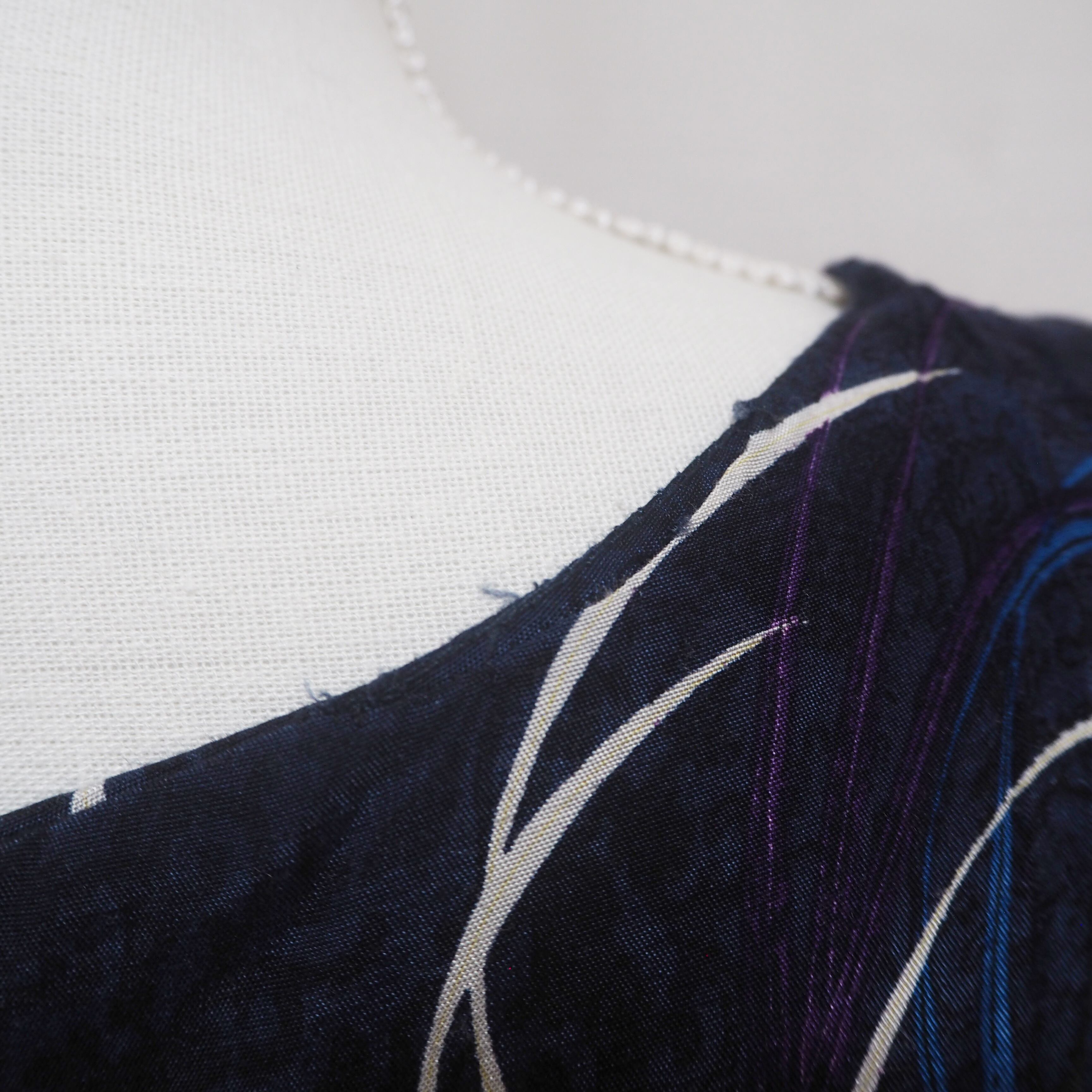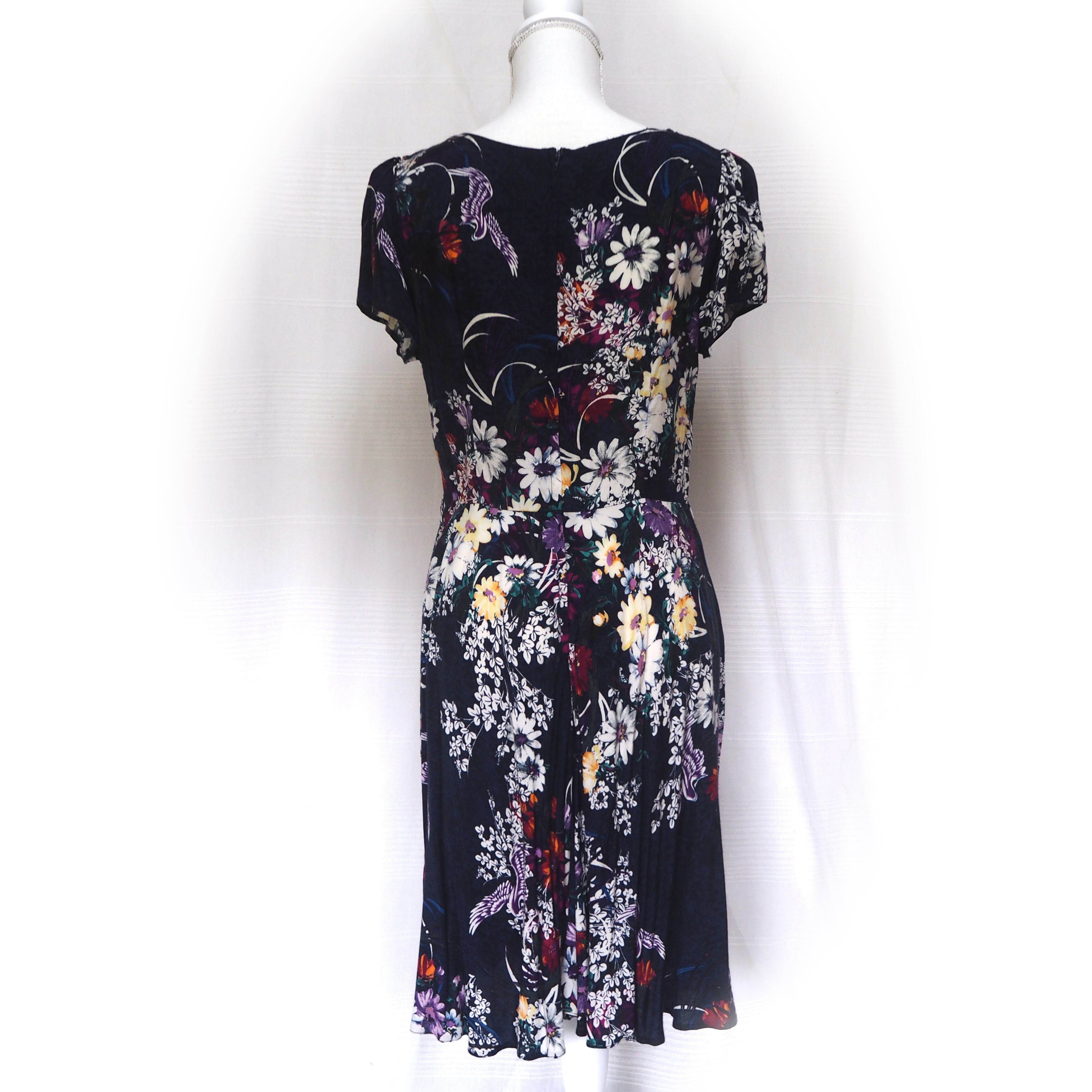 浴衣の柄にもありそうな、紺地に鳥とフラワープリントのレトロなシルエットのワンピース。