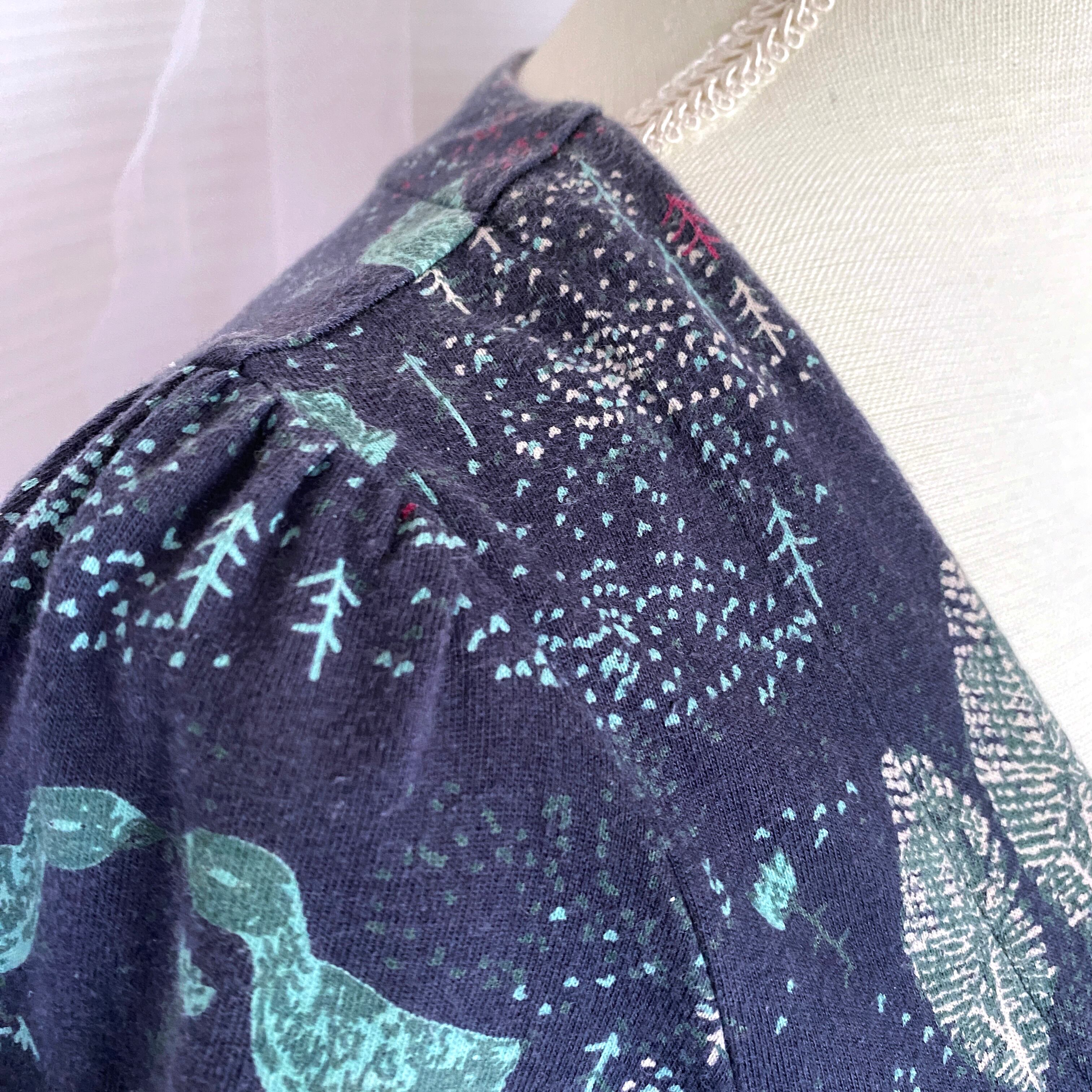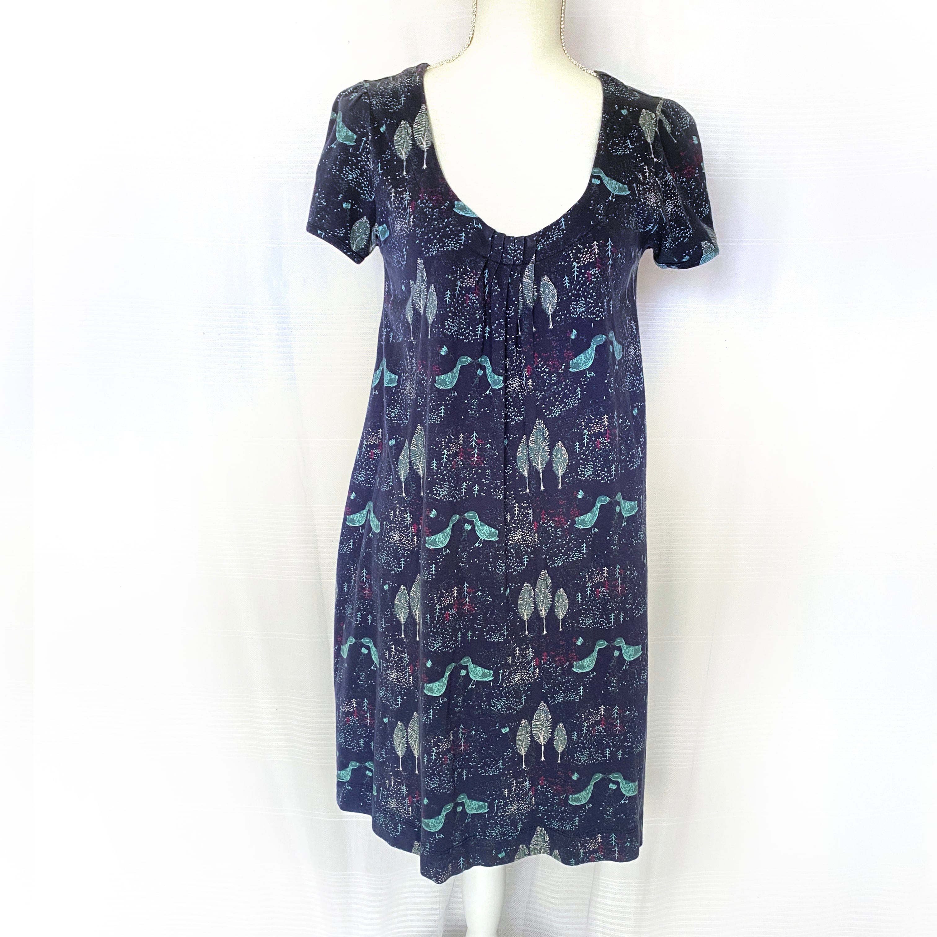 スタンプで押したような、鳥と森の柄のプリントがかわいいAラインのチュニックワンピース。