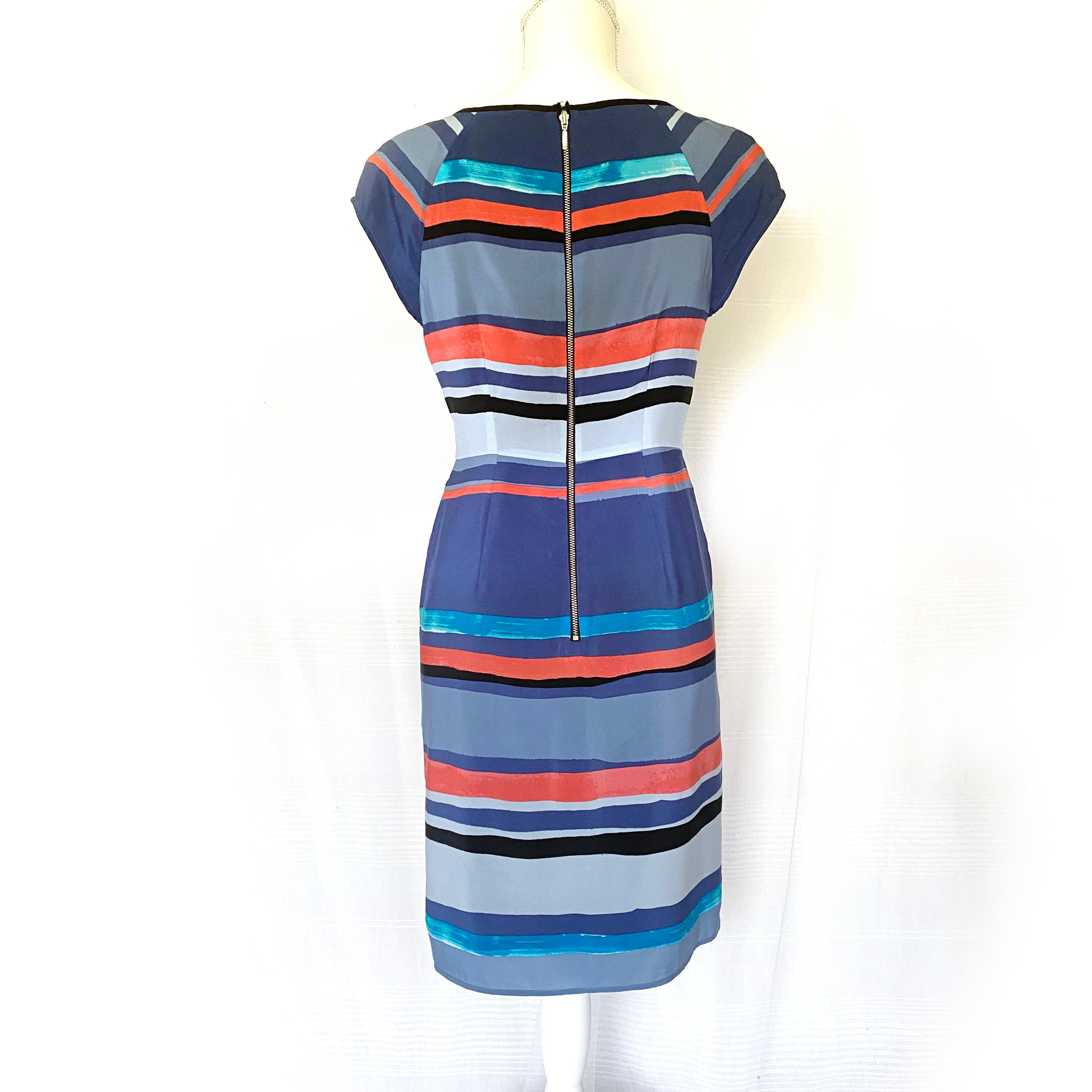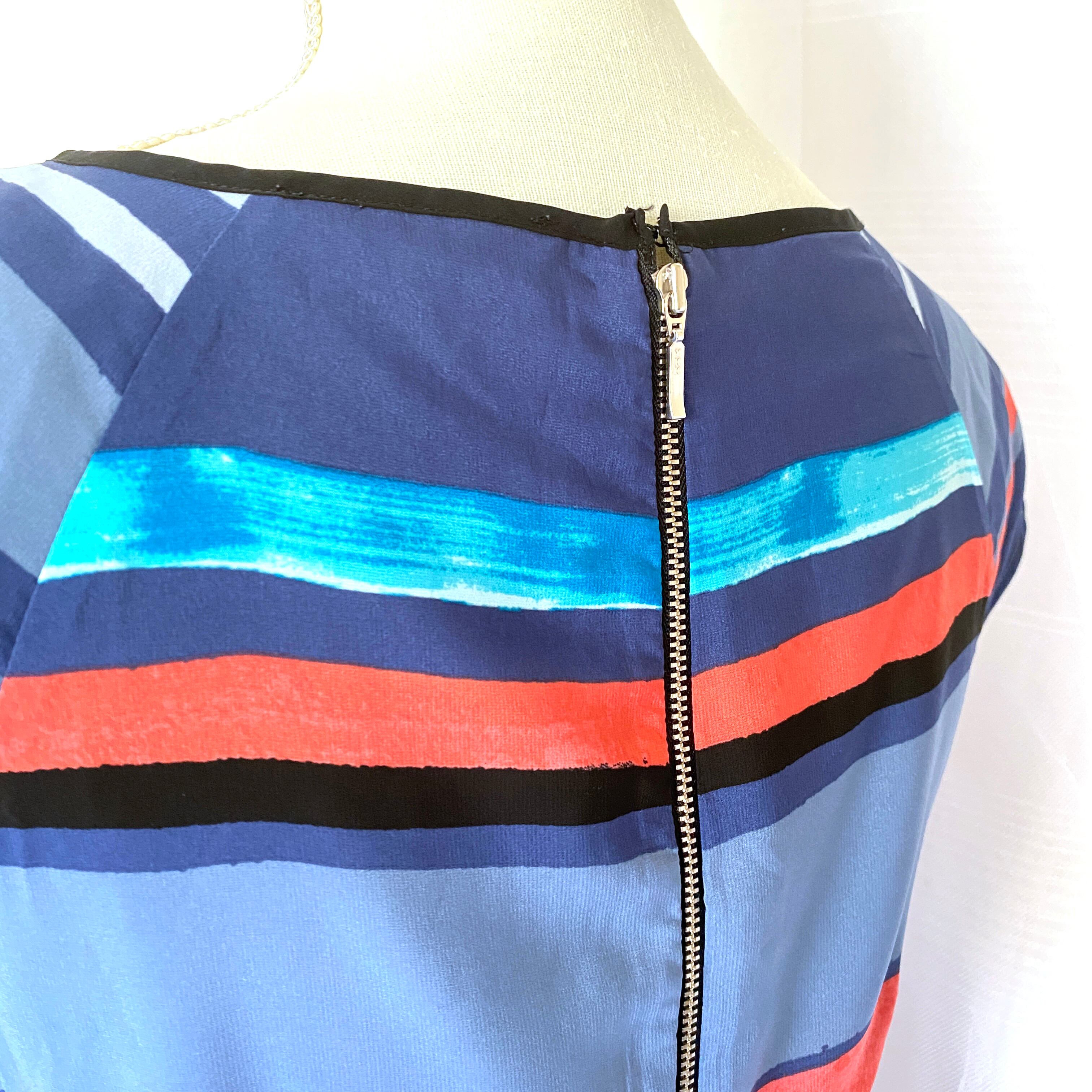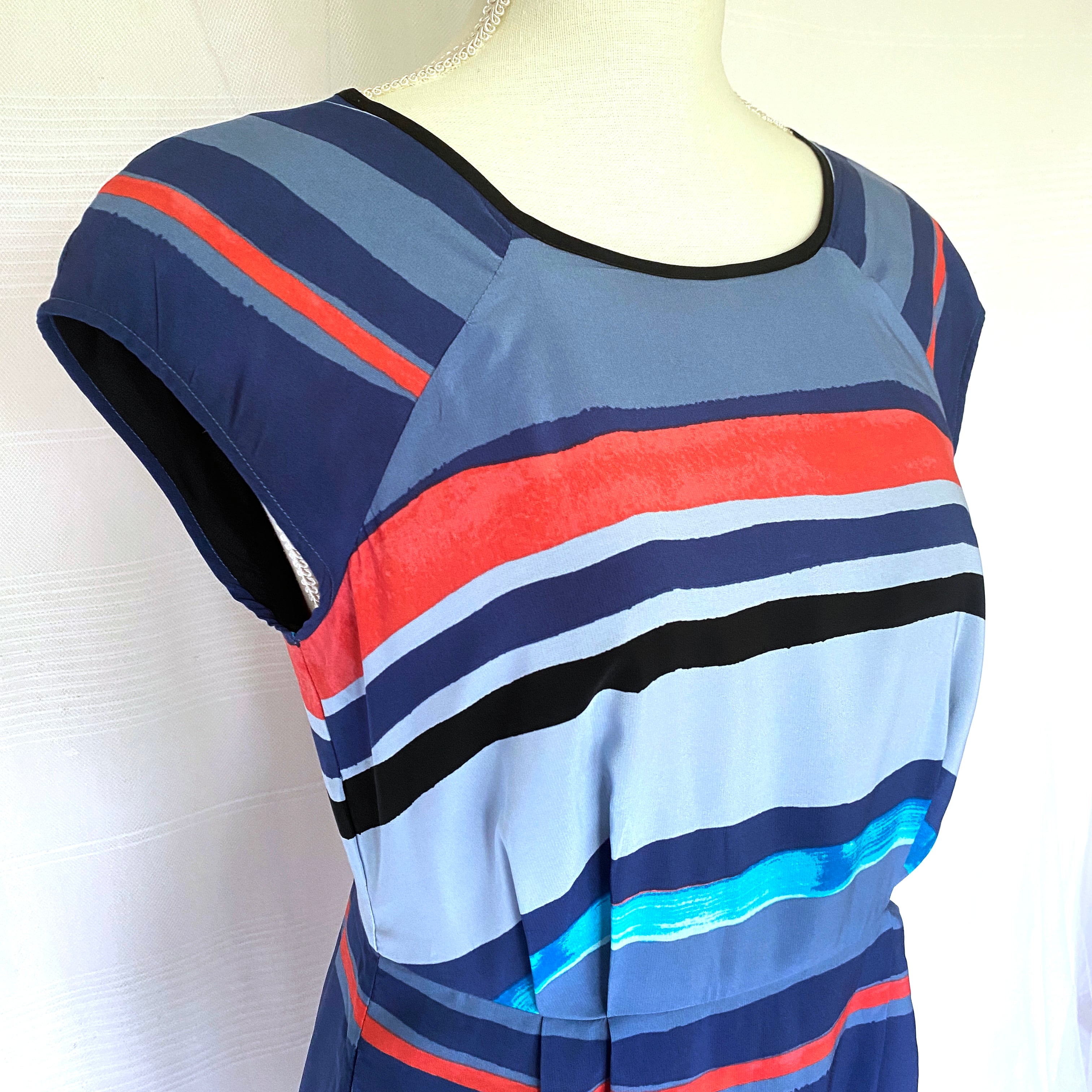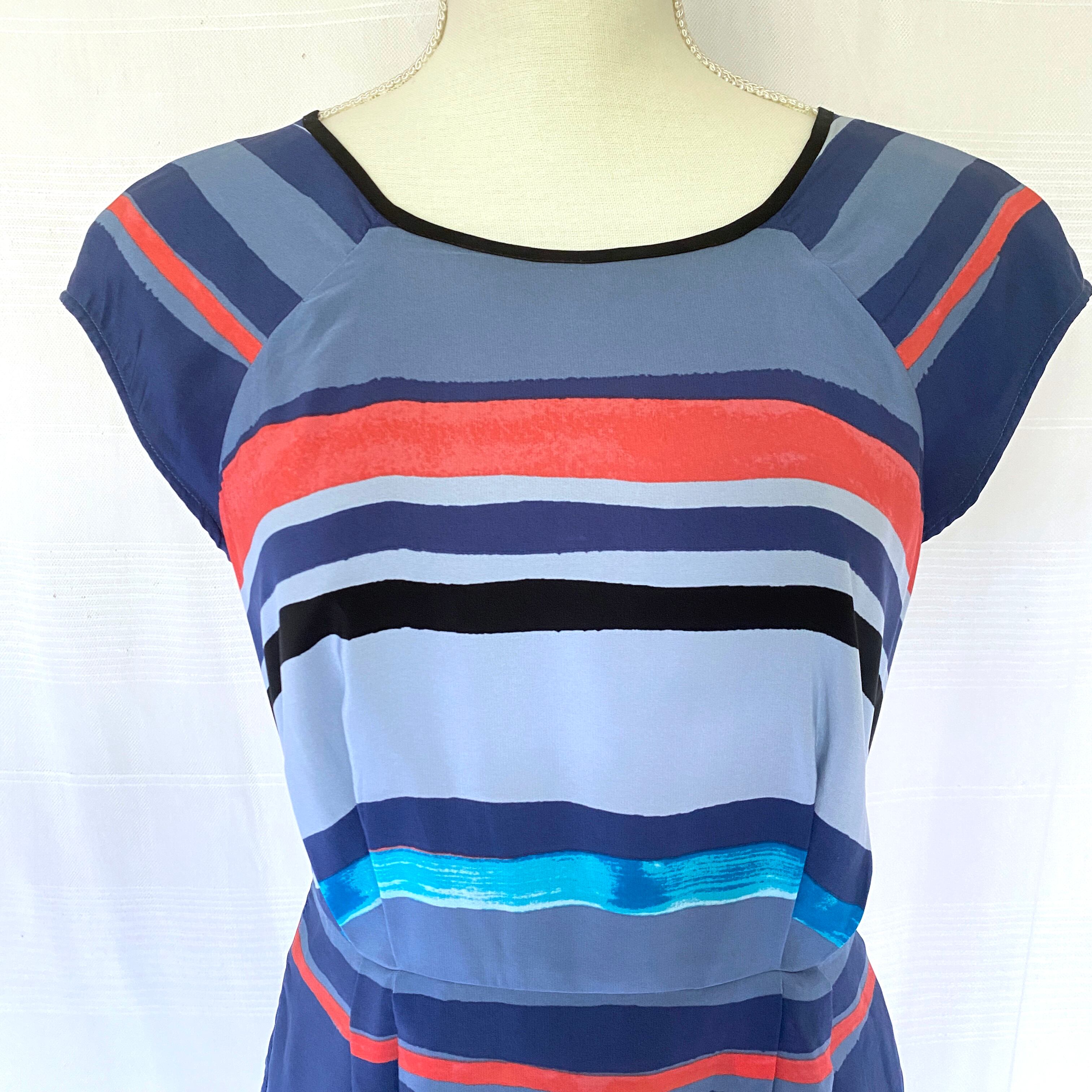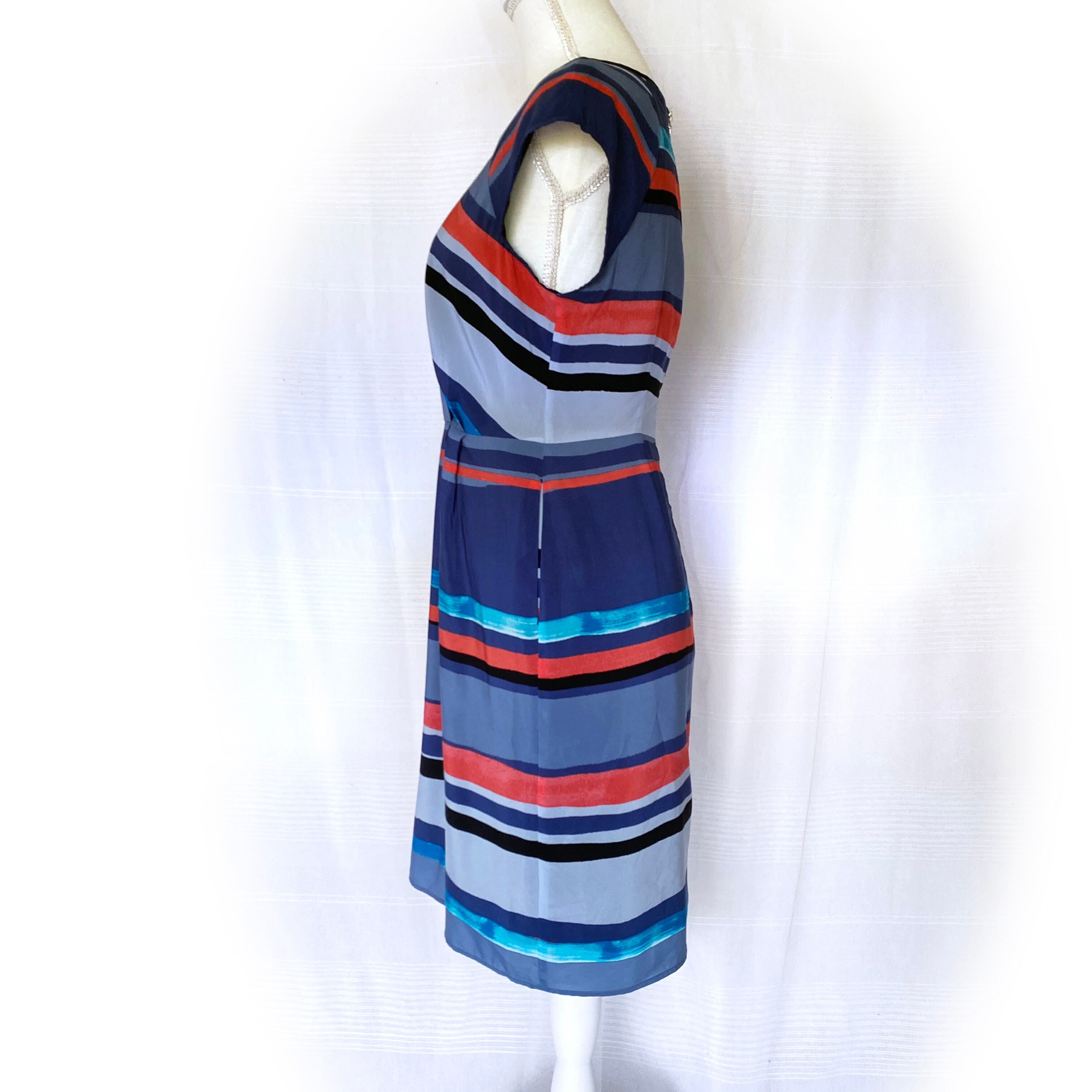 ありそうでない、くすみブルーとレッドの手書き風ボーダーラインのミニワンピース。