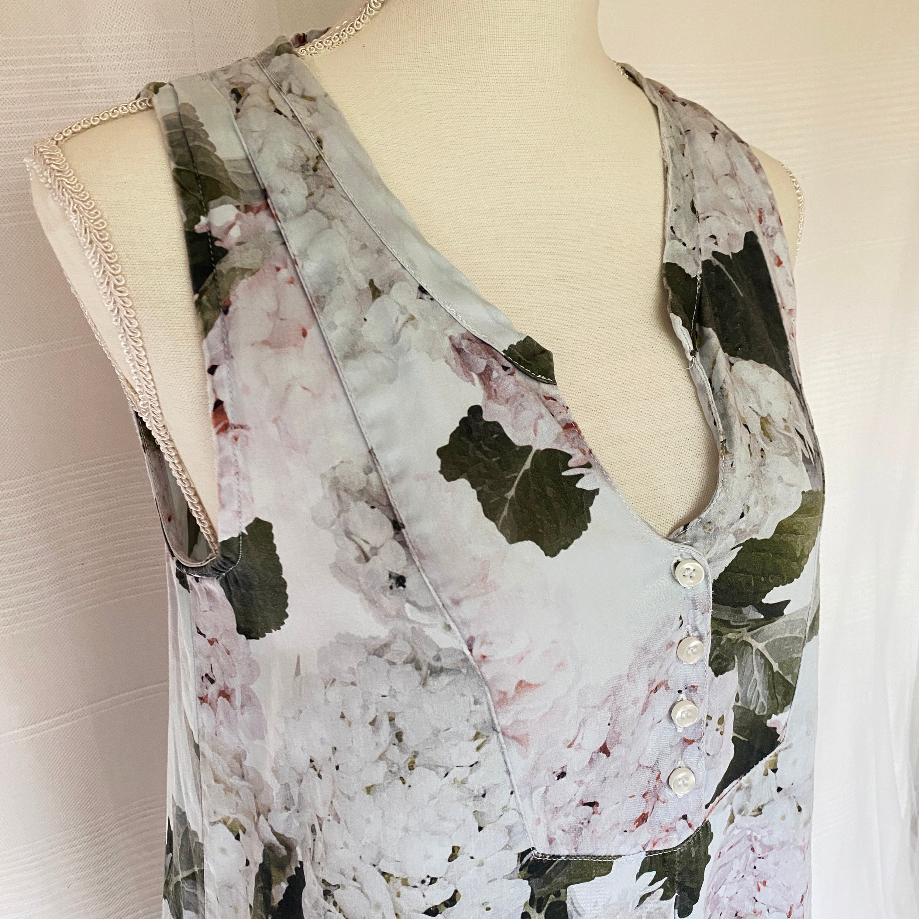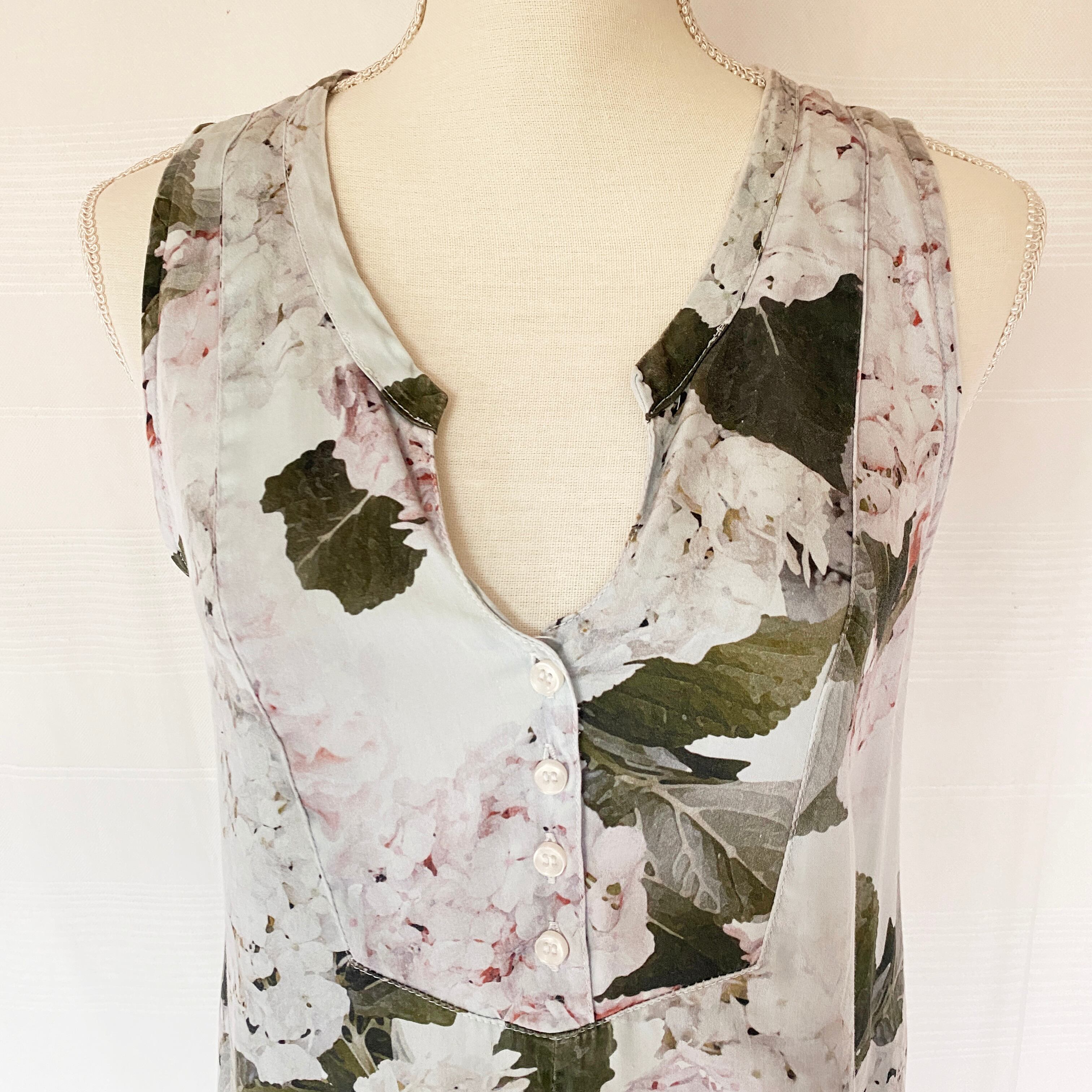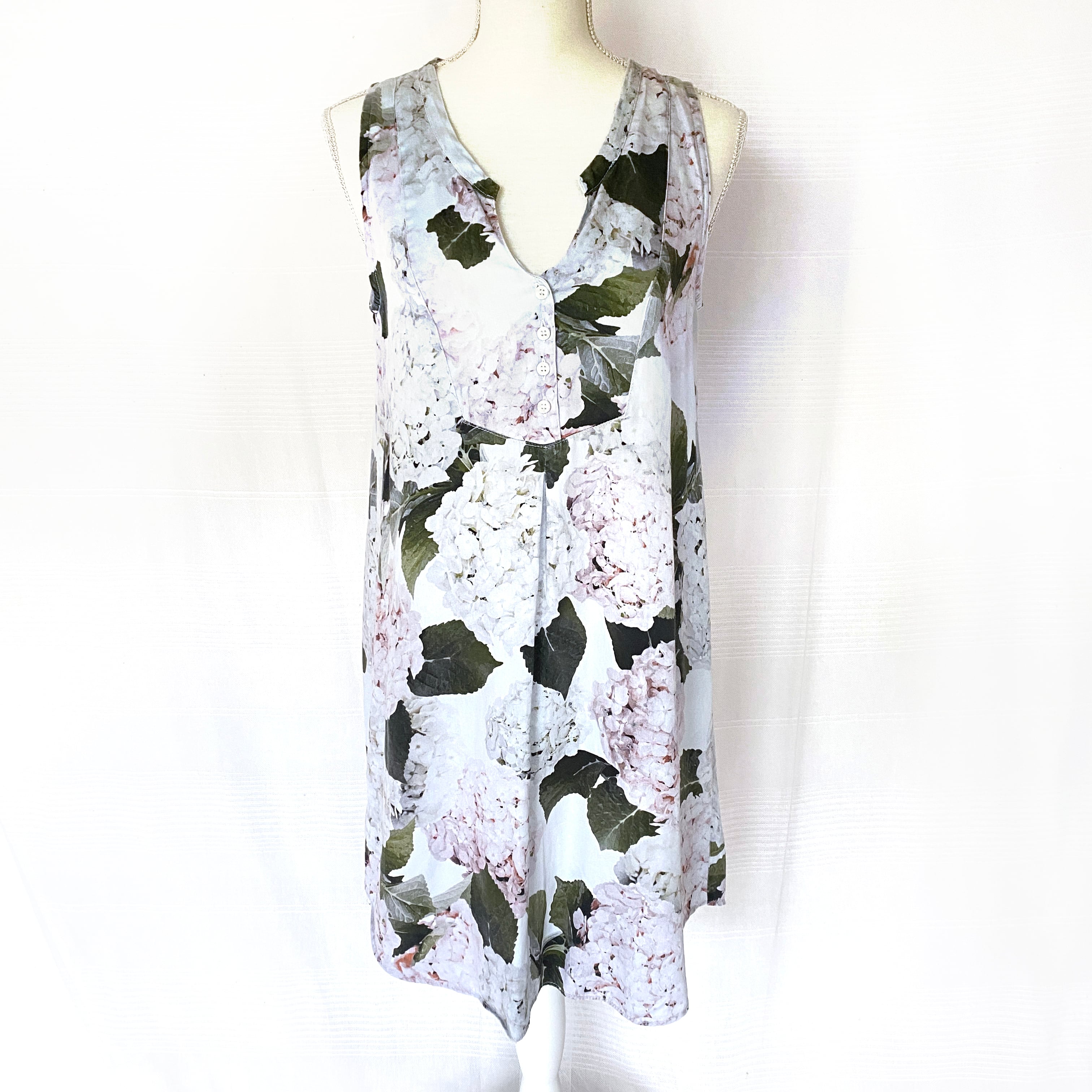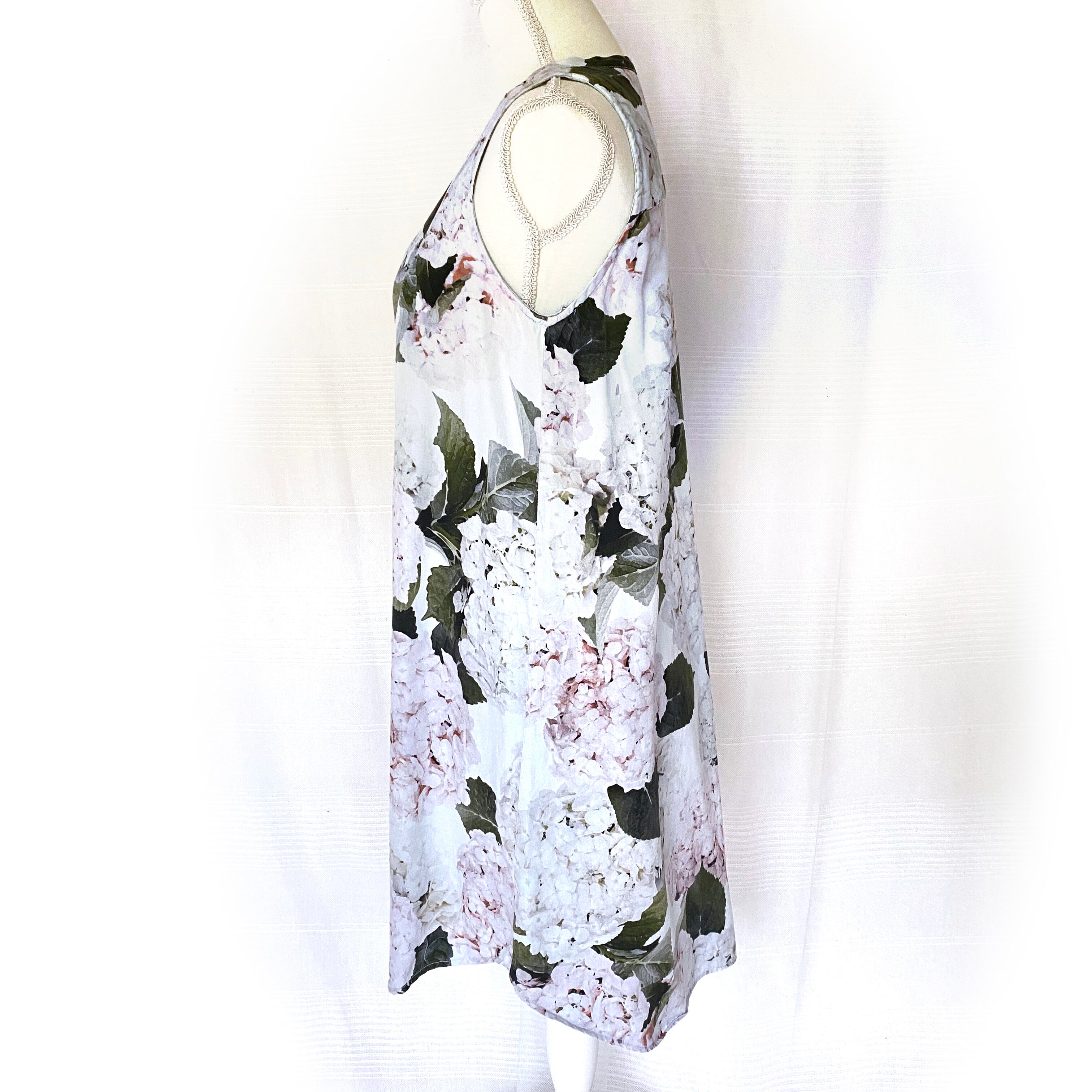コットン生地に大きな紫陽花柄がプリントされた、すずしげなノースリーブミニワンピース。