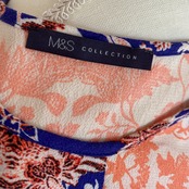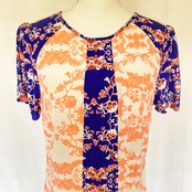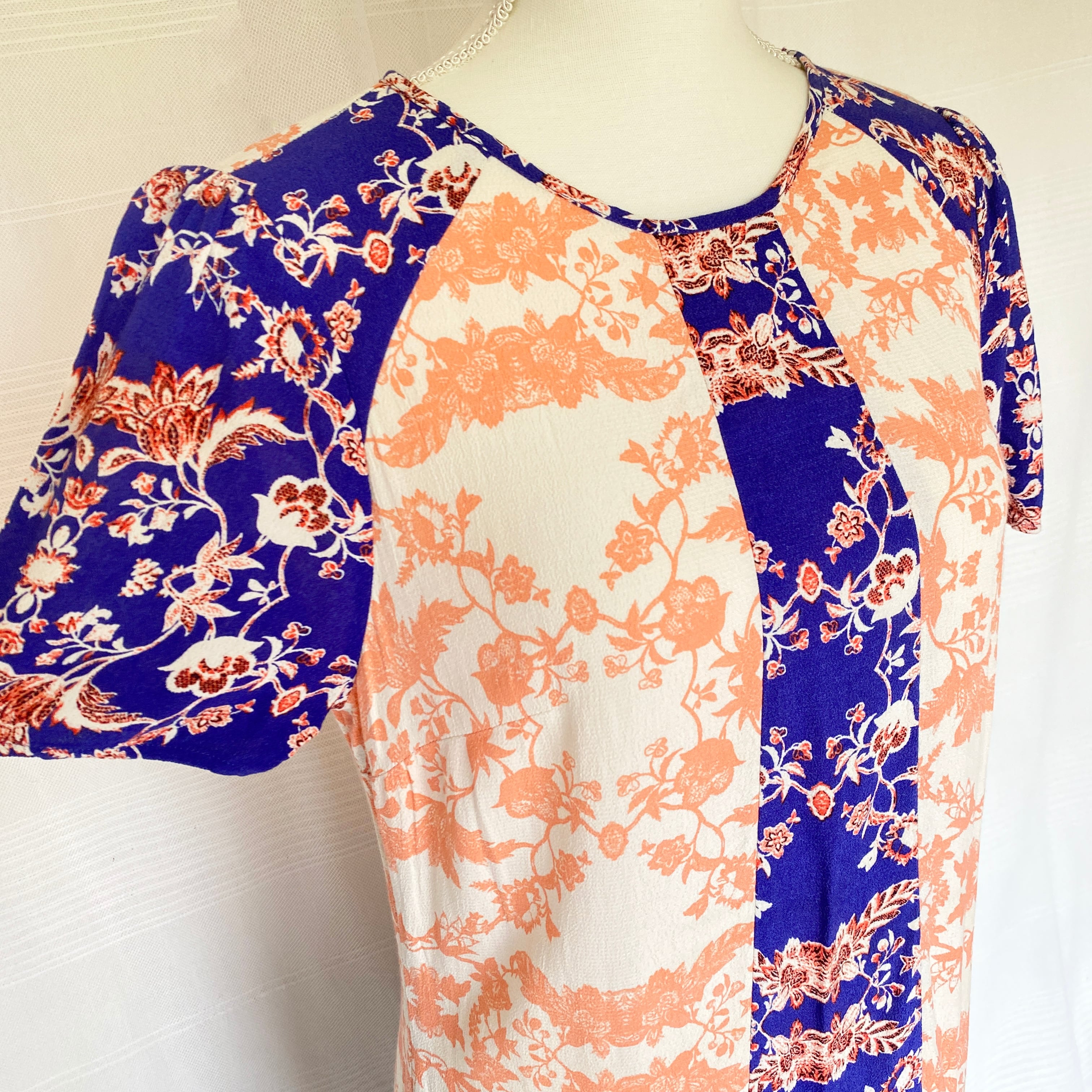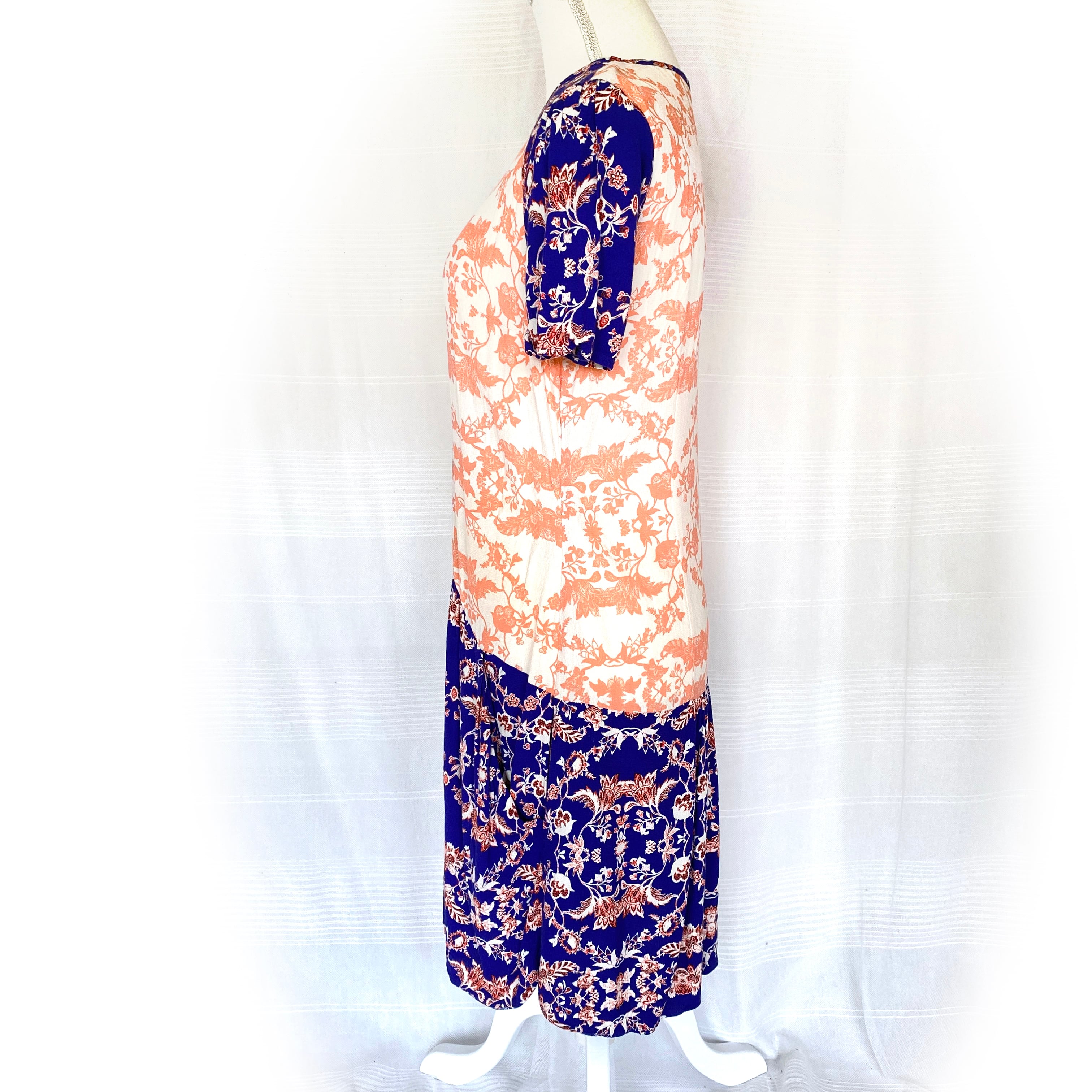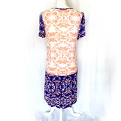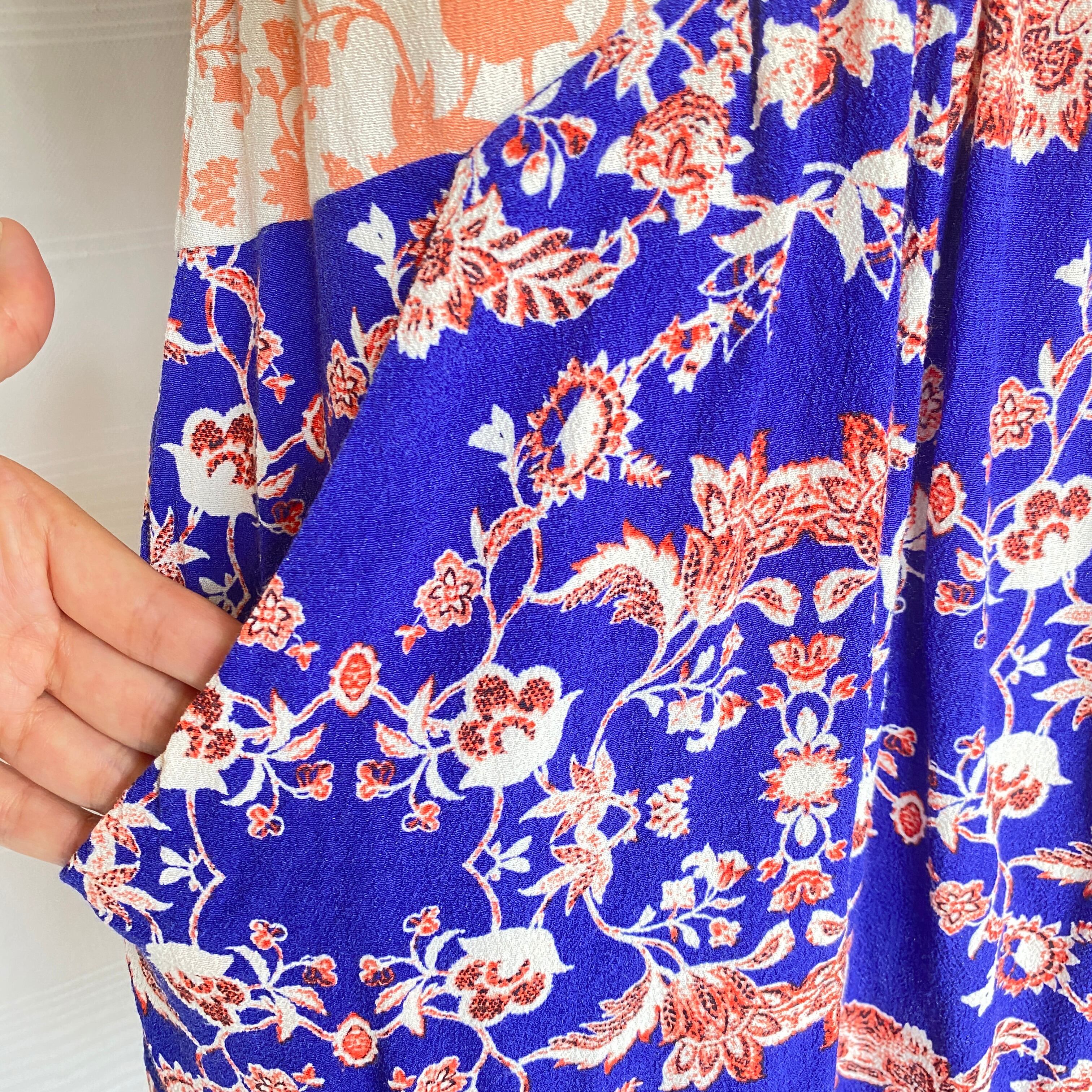 しゃりしゃりとした落ち感のある生地にヴィヴィッドなプリントの切り替えのワンピース。