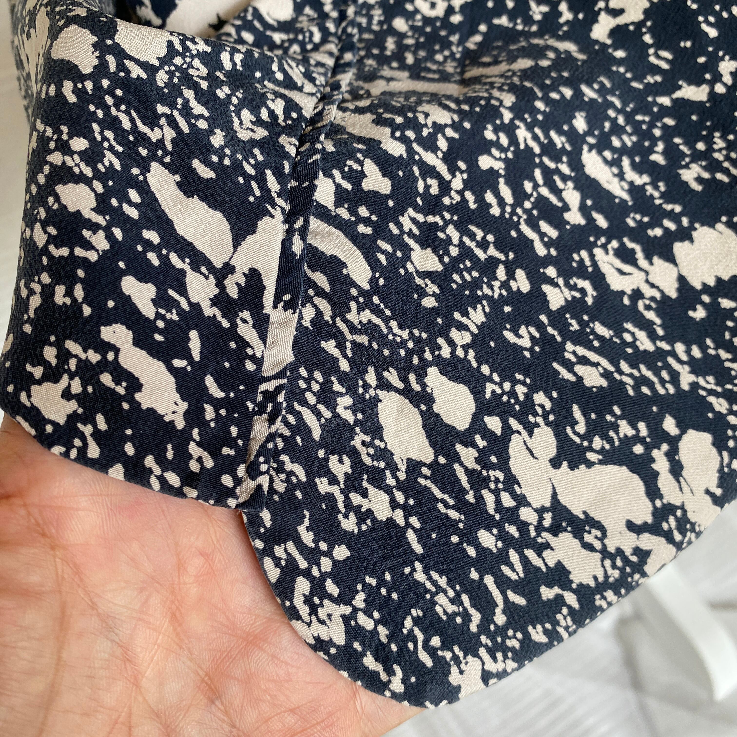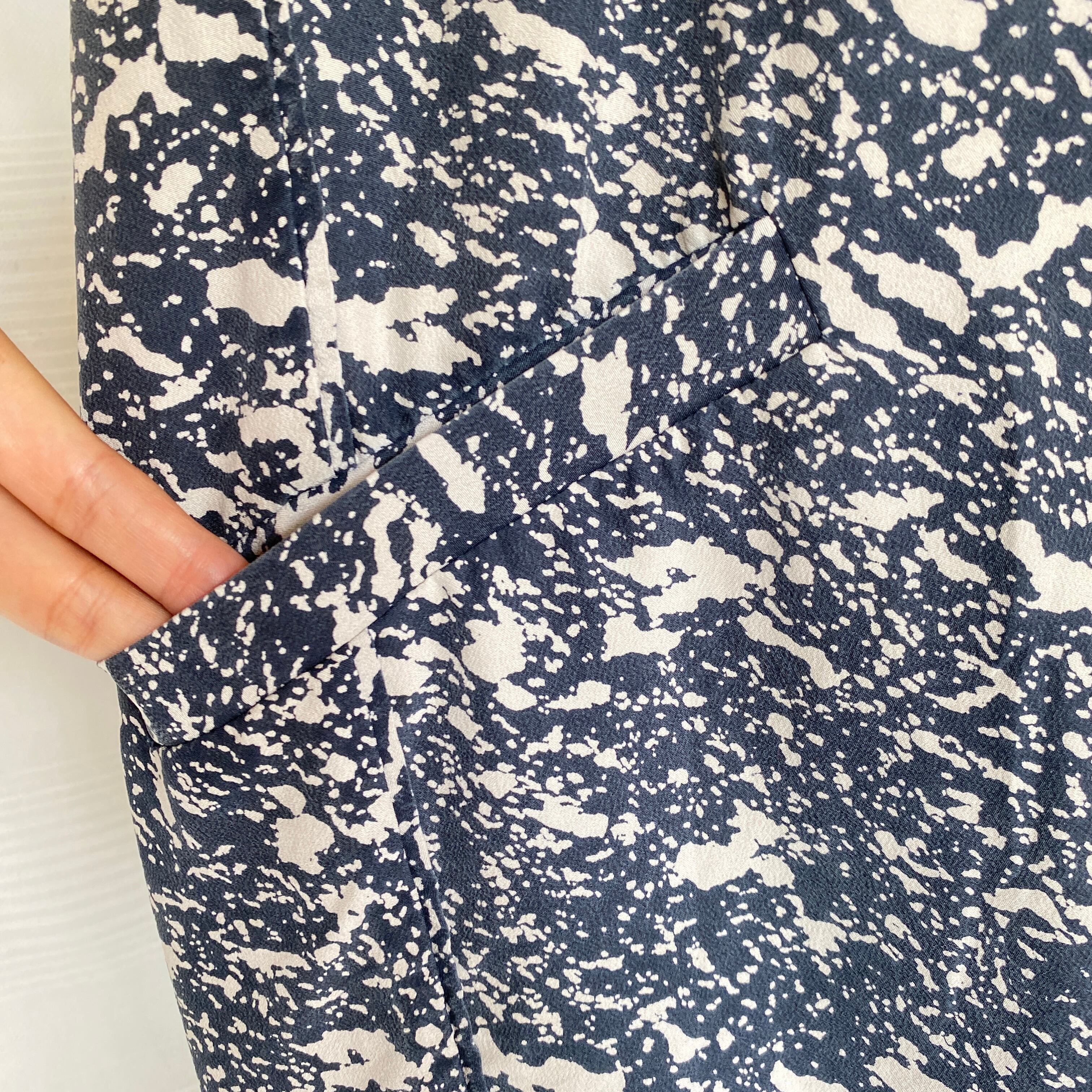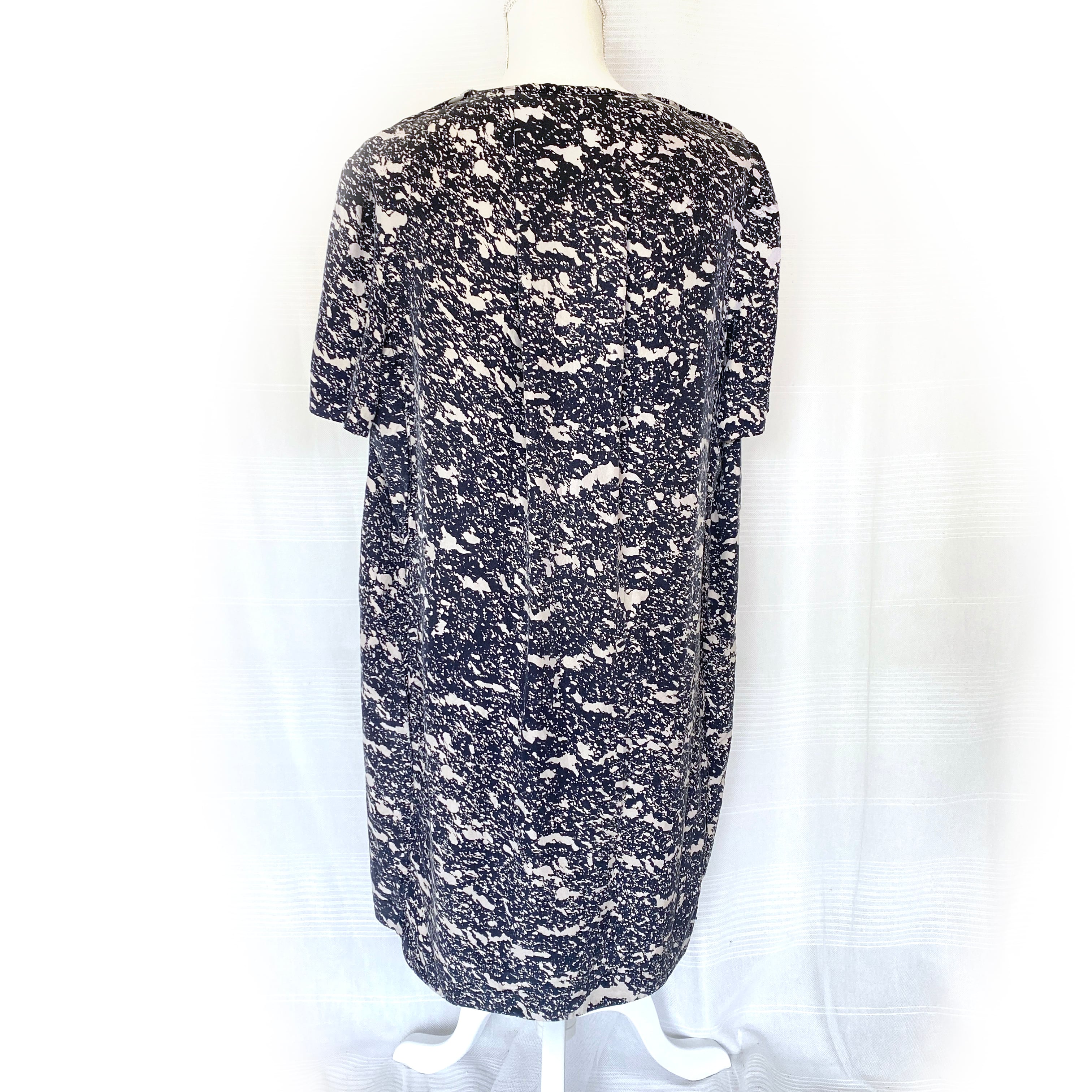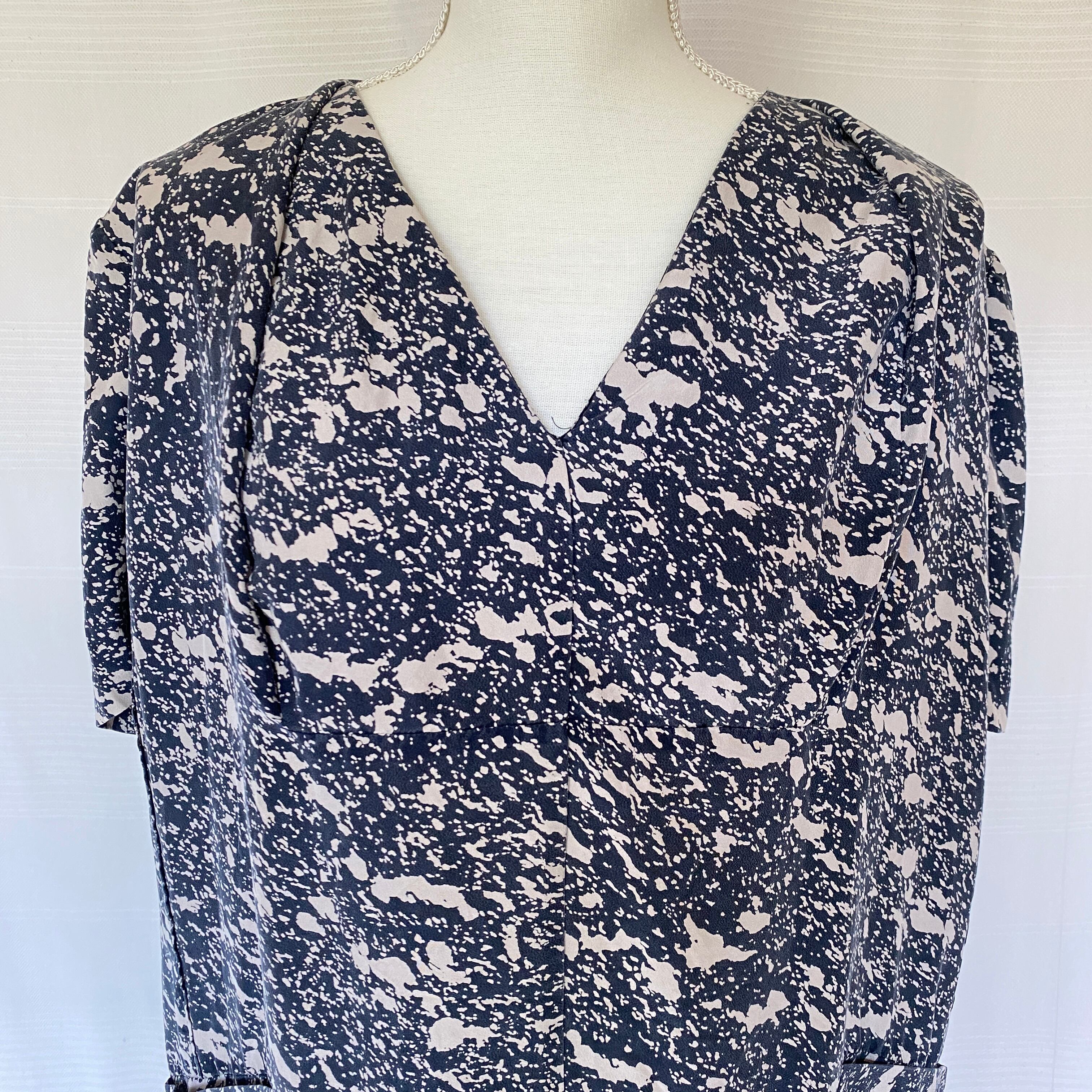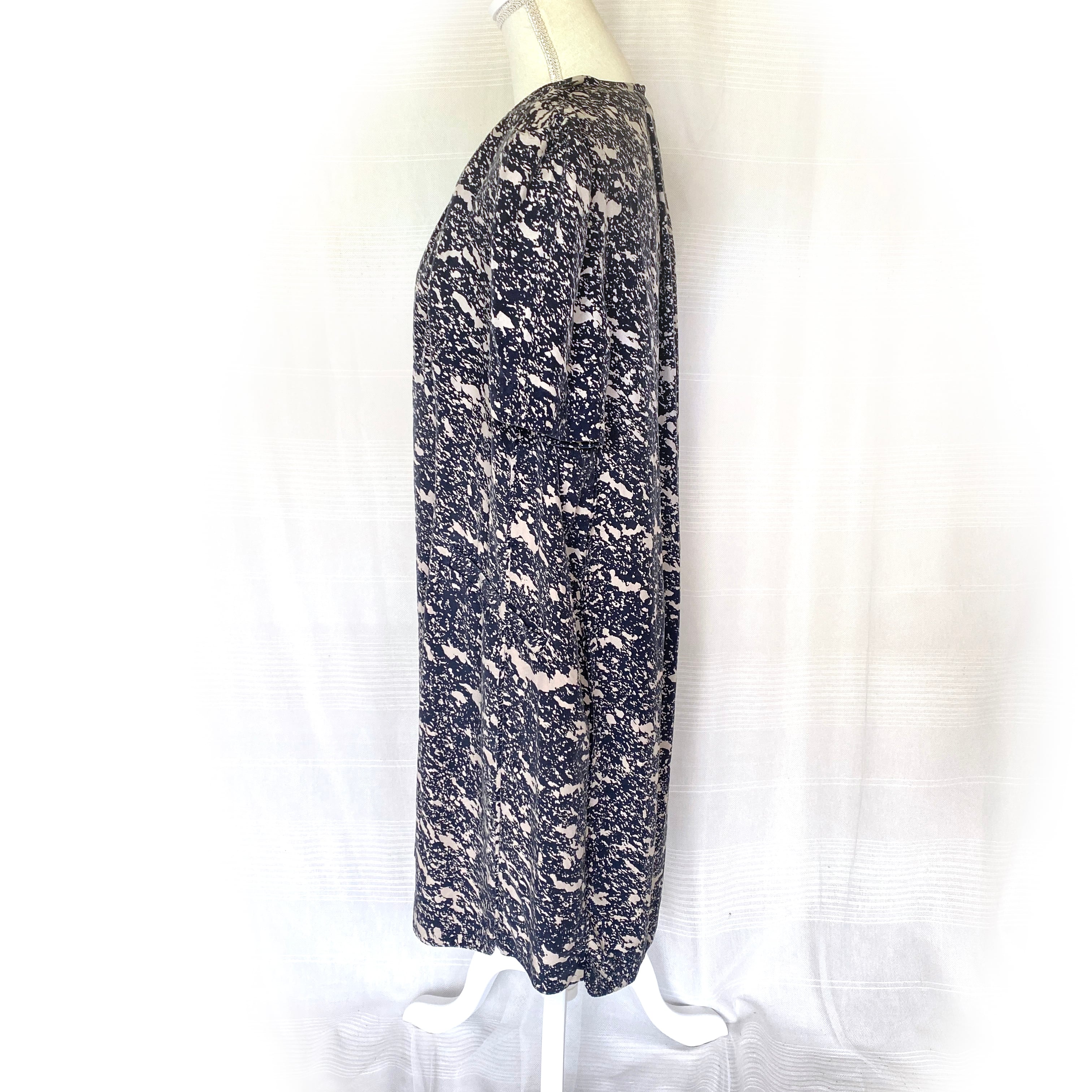 モノトーンに見えてややネイビーよりのグレーとベージュよりのグレーのブリザード柄のチュニックワンピース。