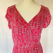 濃いピンクにグレーの手書きの植物模様がゆるかわいい、腰位置の切り替えワンピース。