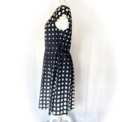 白と黒の格子柄が、遠目にはドットのグラデーションにも見えるレトロなシルエットのワンピース。