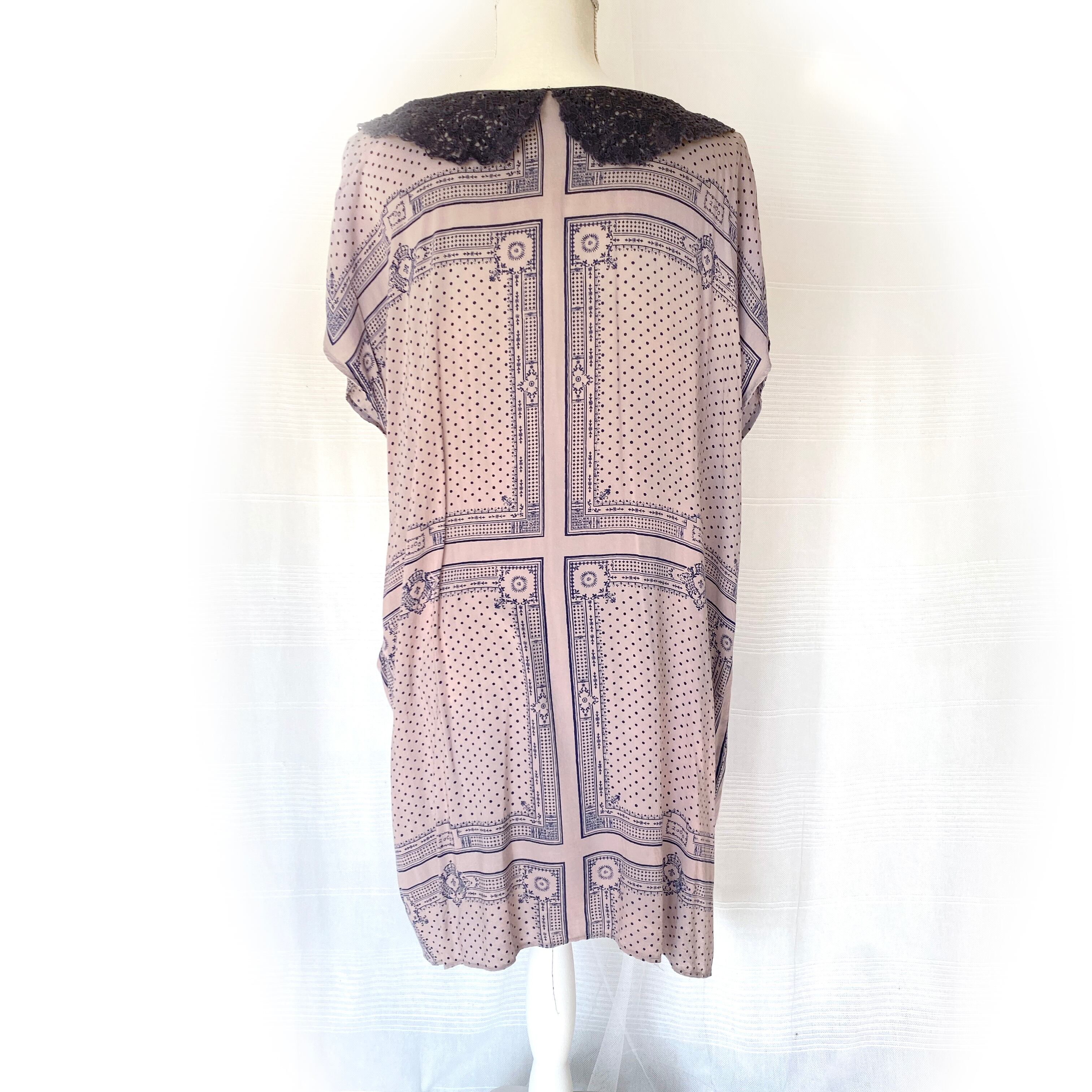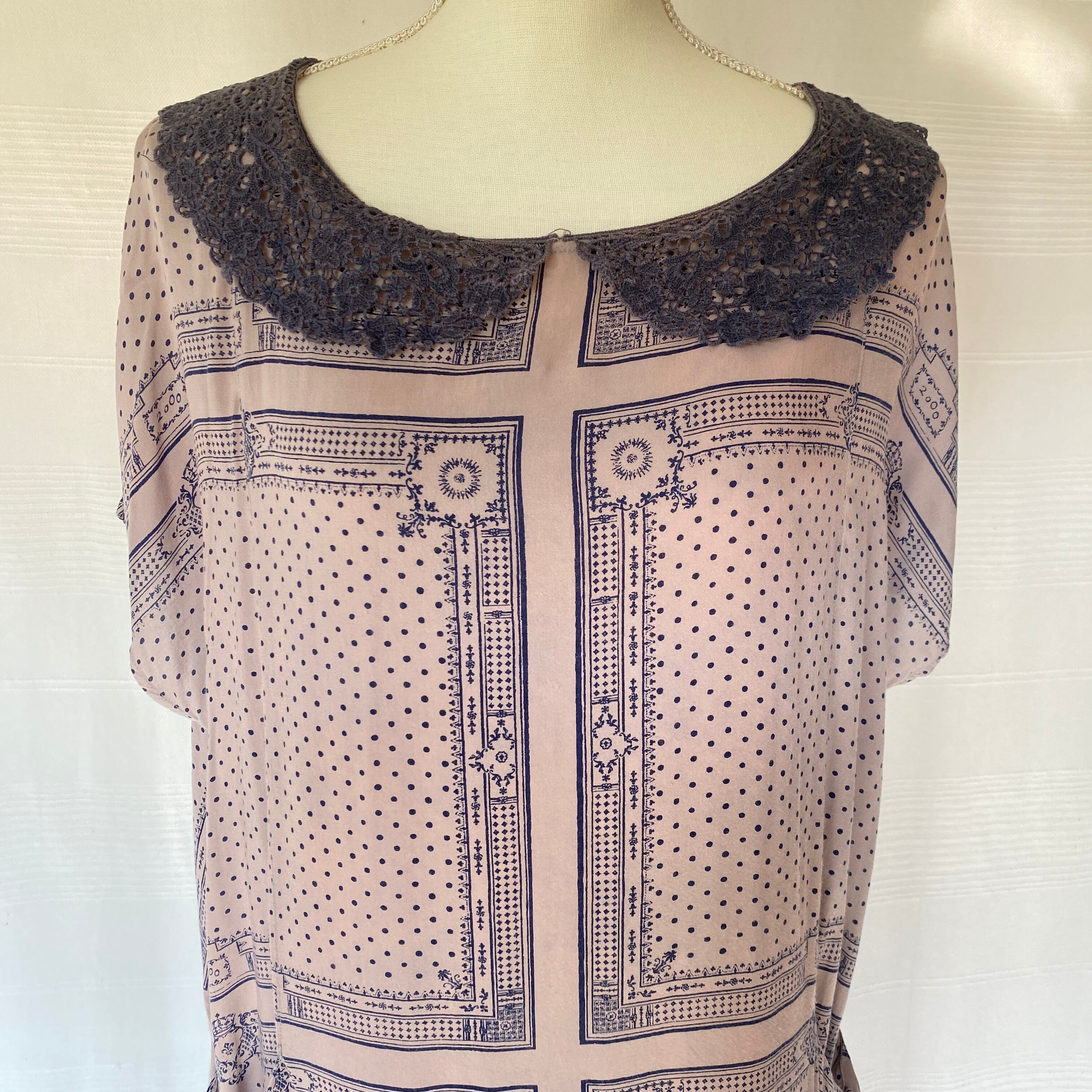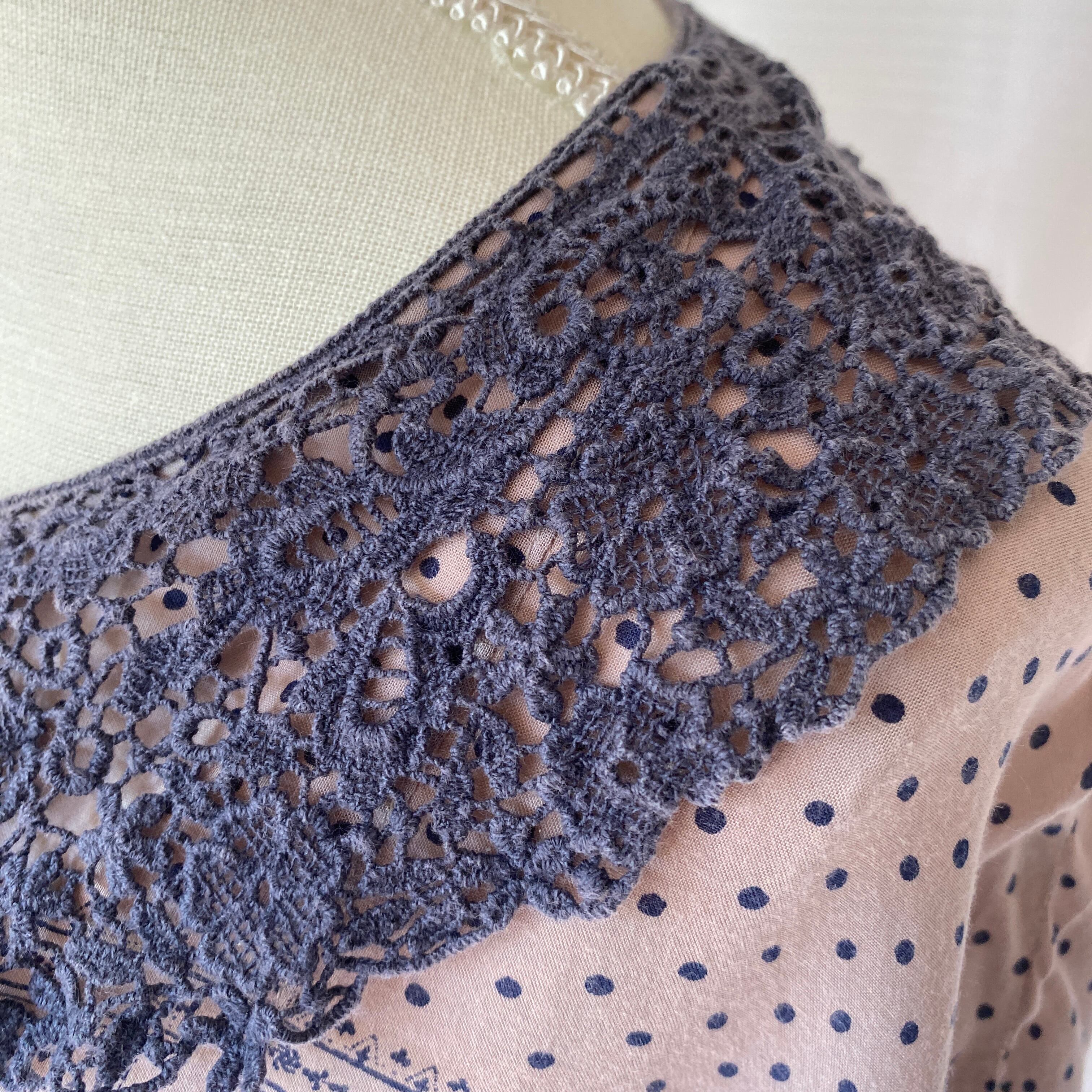 ネイビーのクロシェ襟とスカーフ柄がアンティークな雰囲気のチュニックワンピース。