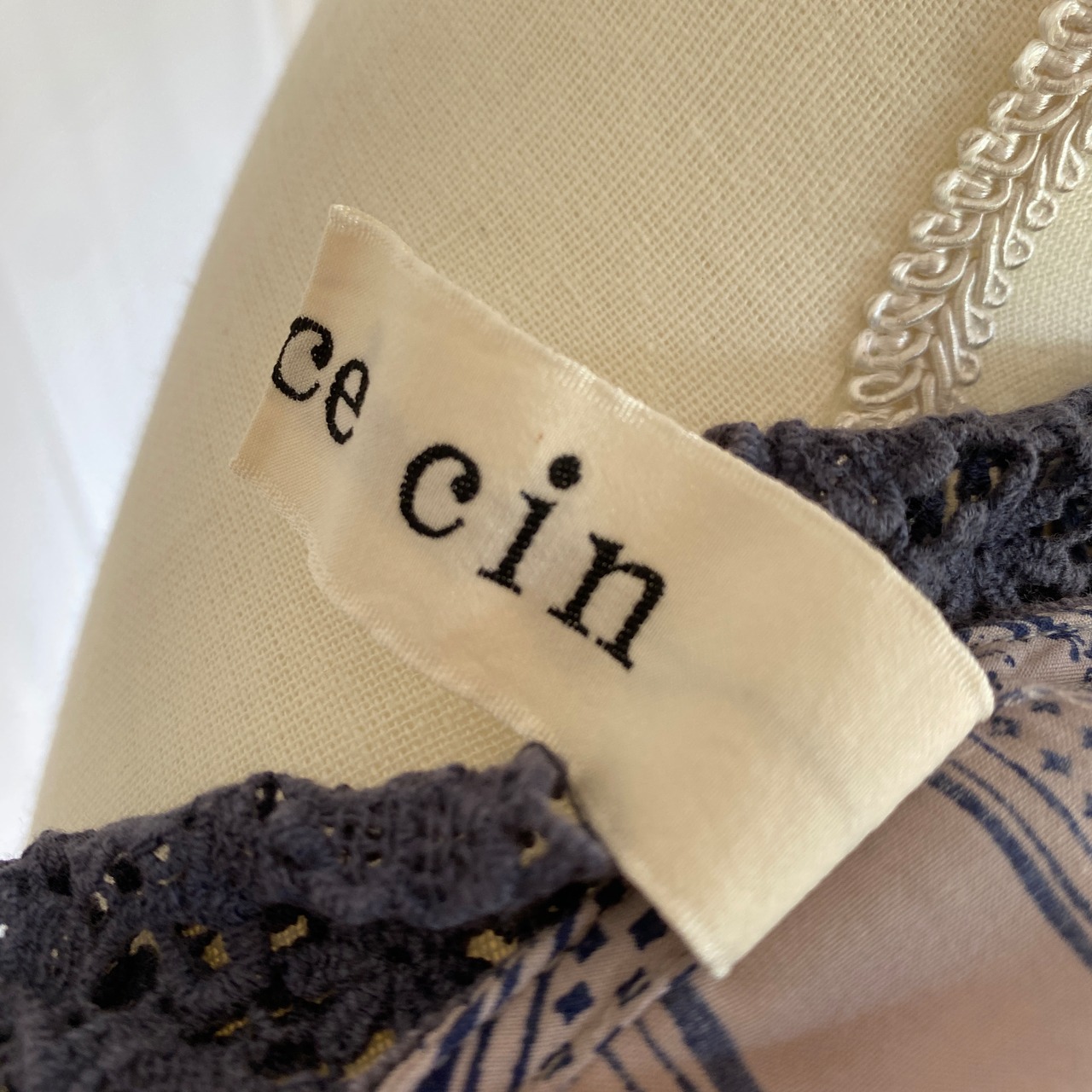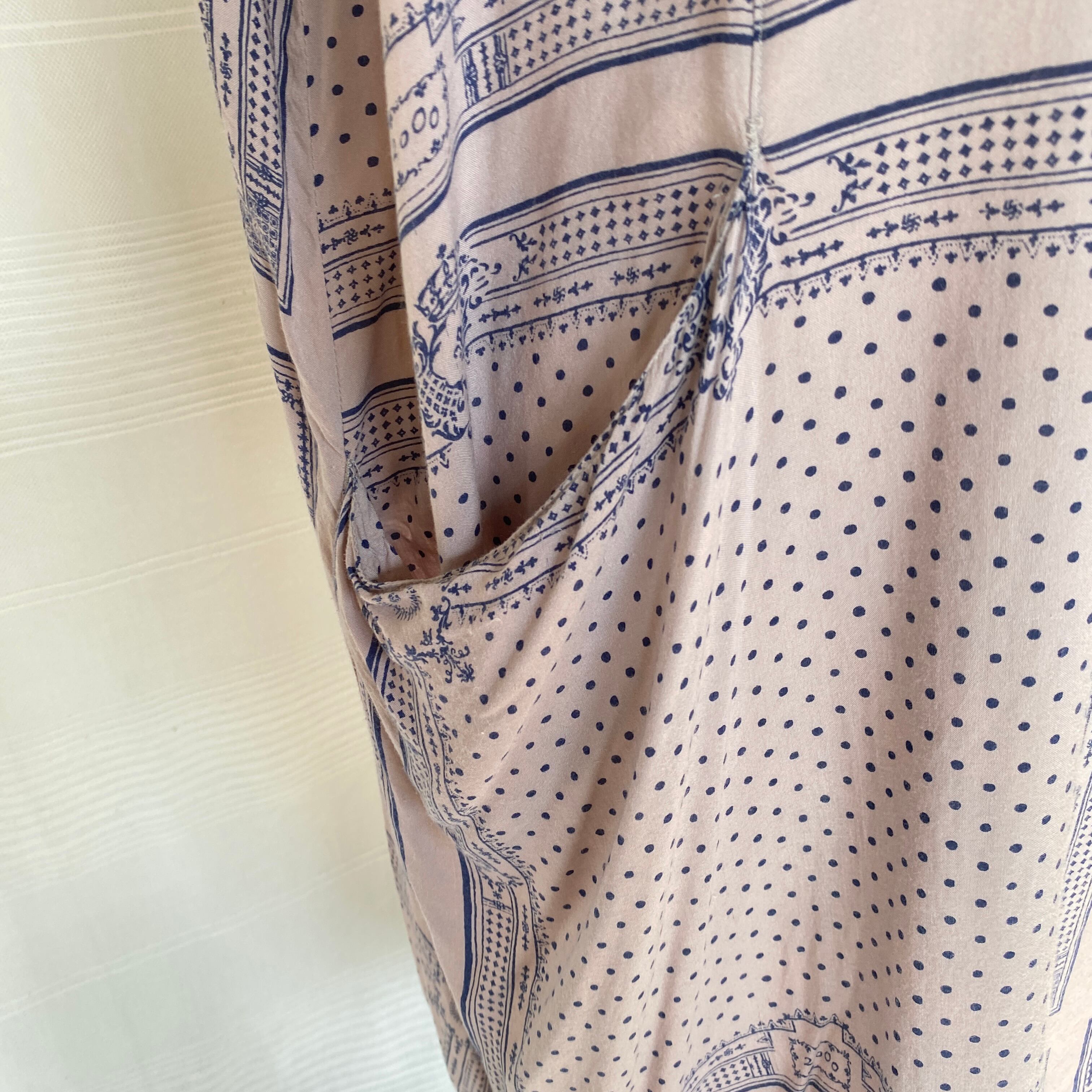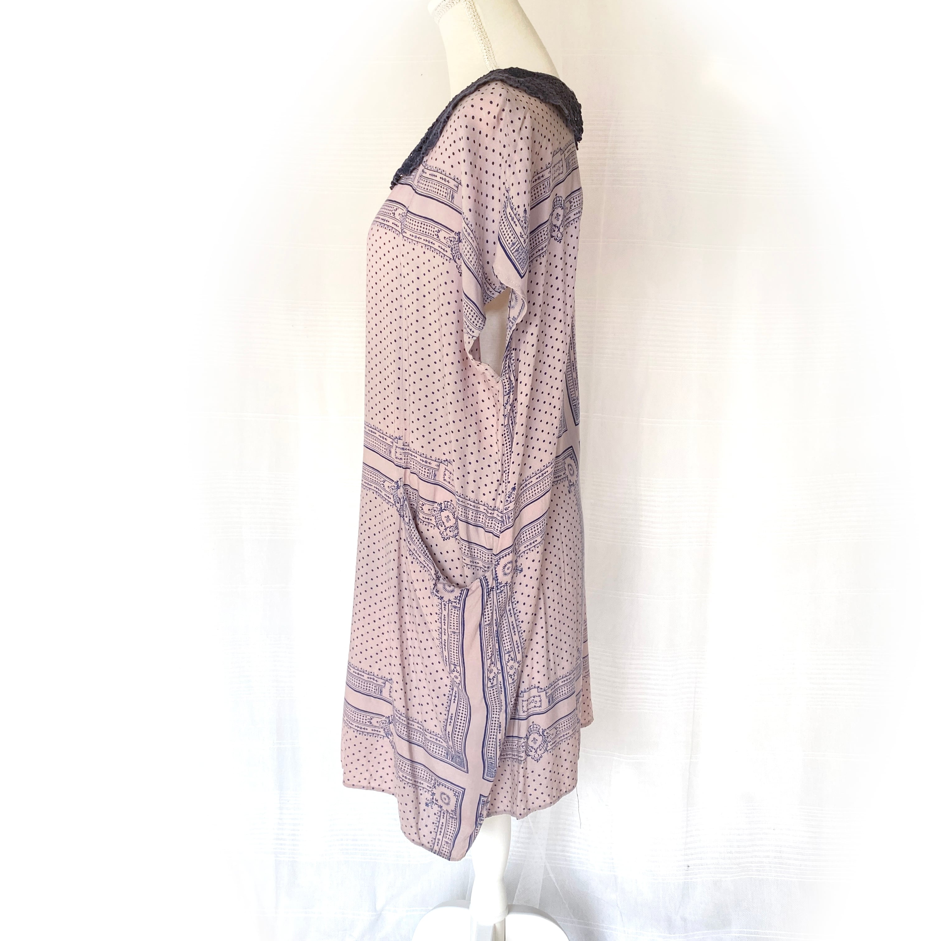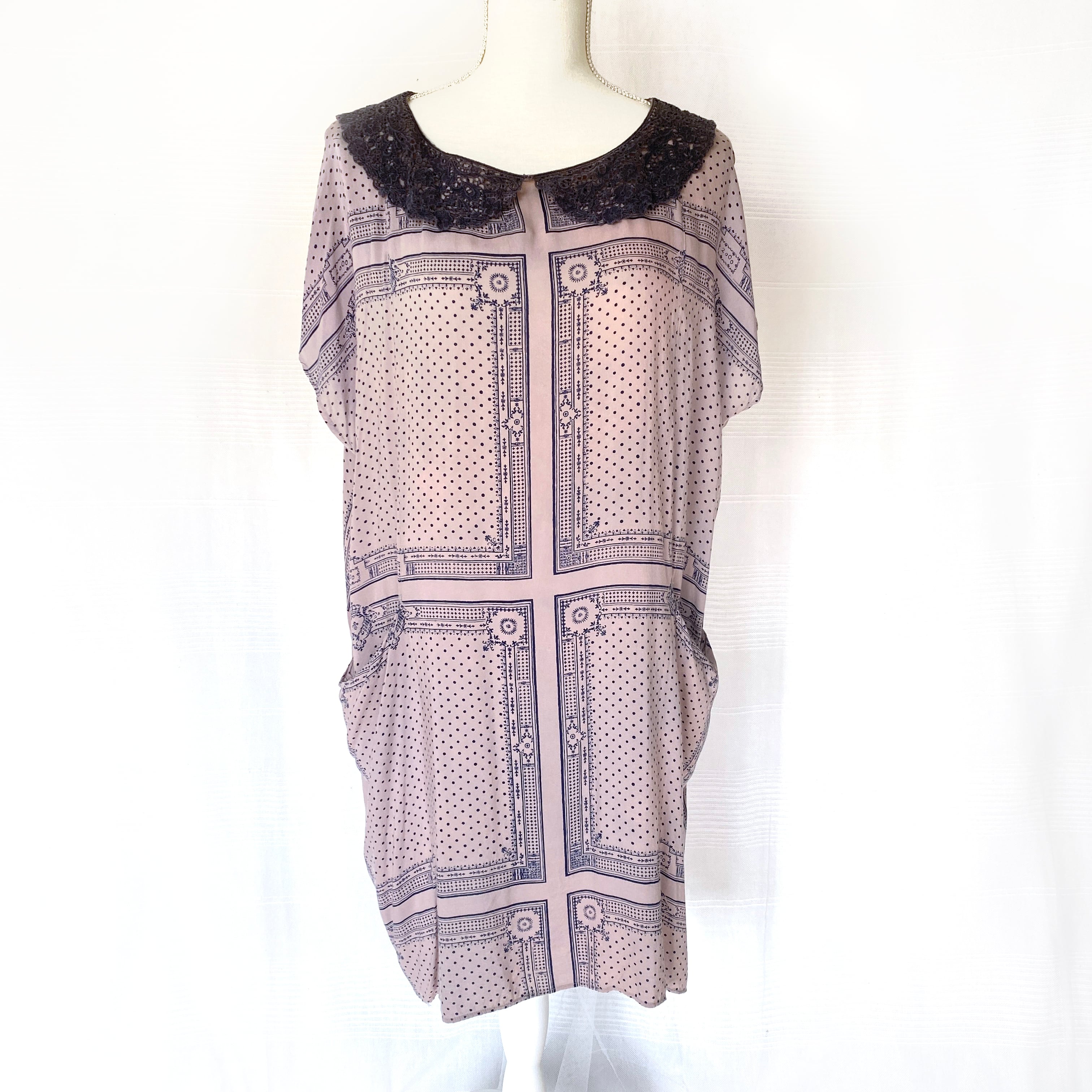 ネイビーのクロシェ襟とスカーフ柄がアンティークな雰囲気のチュニックワンピース。