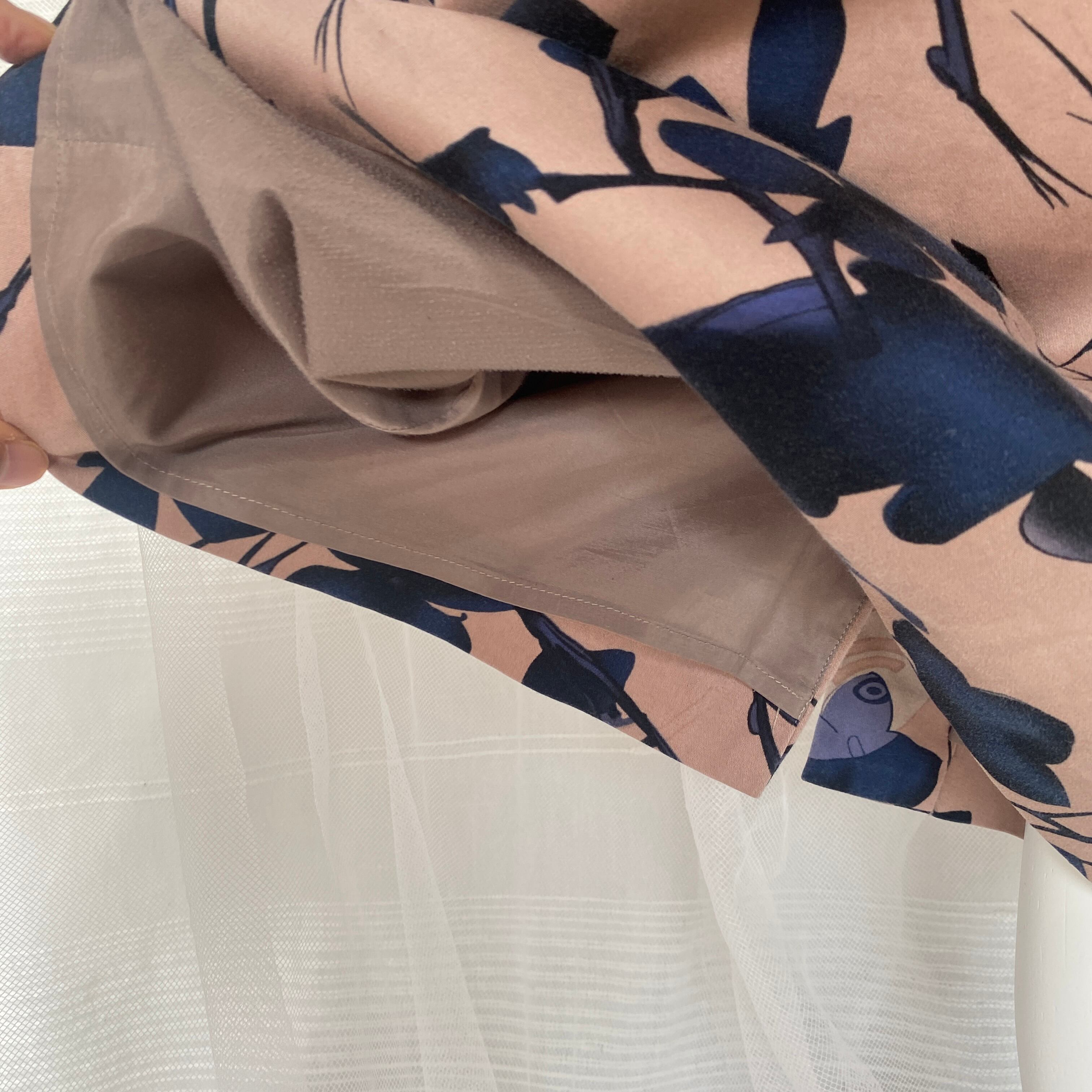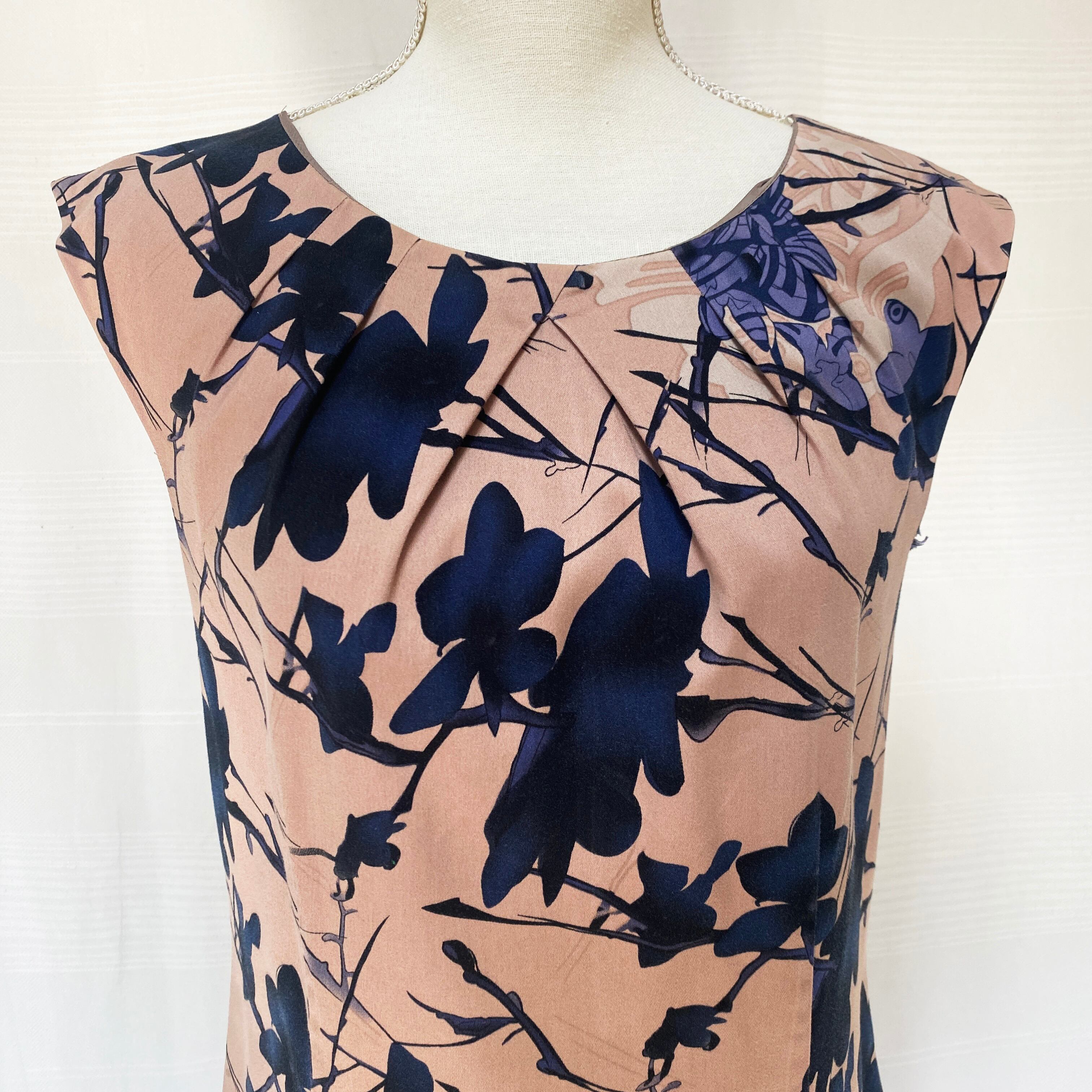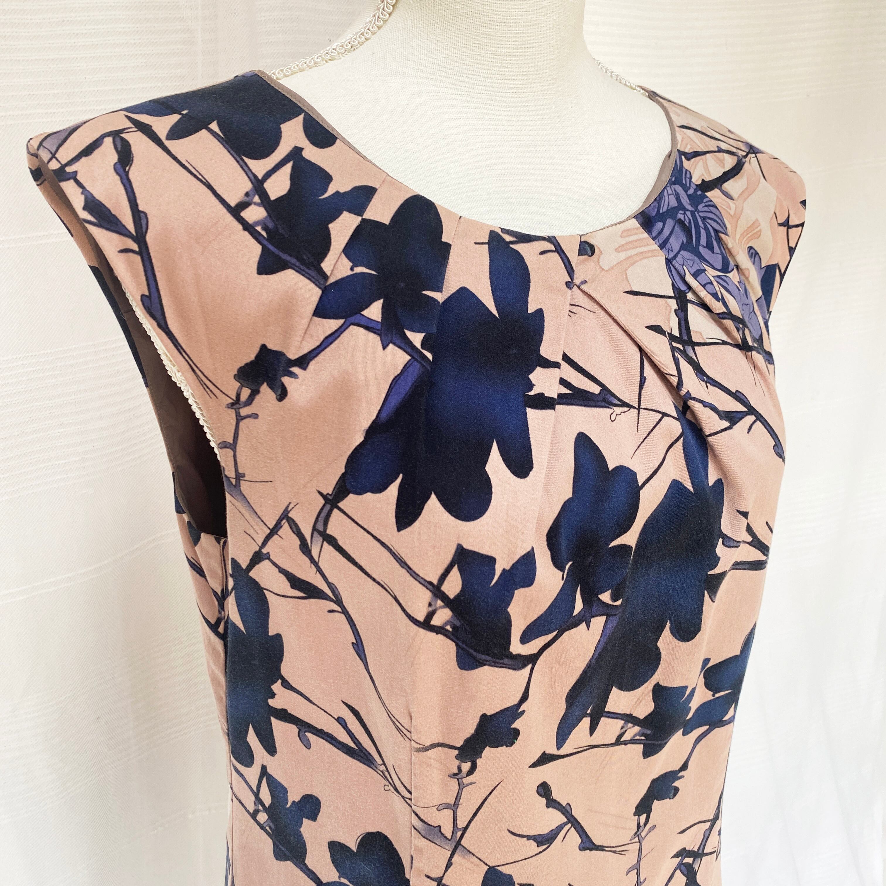 やや赤みがかったベージュに、滲んだようなネイビーで描かれた花のシルエットが印象的なワンピース。