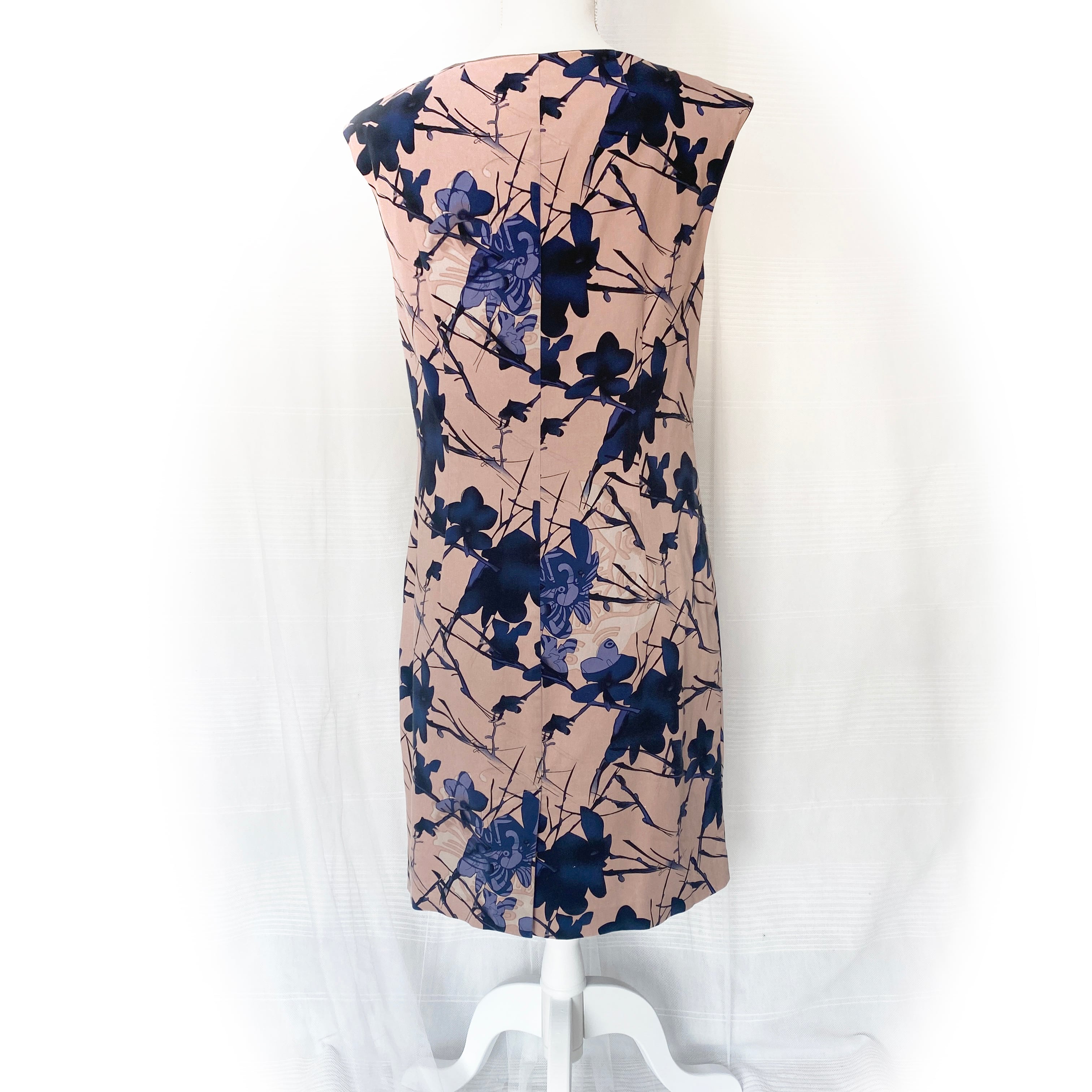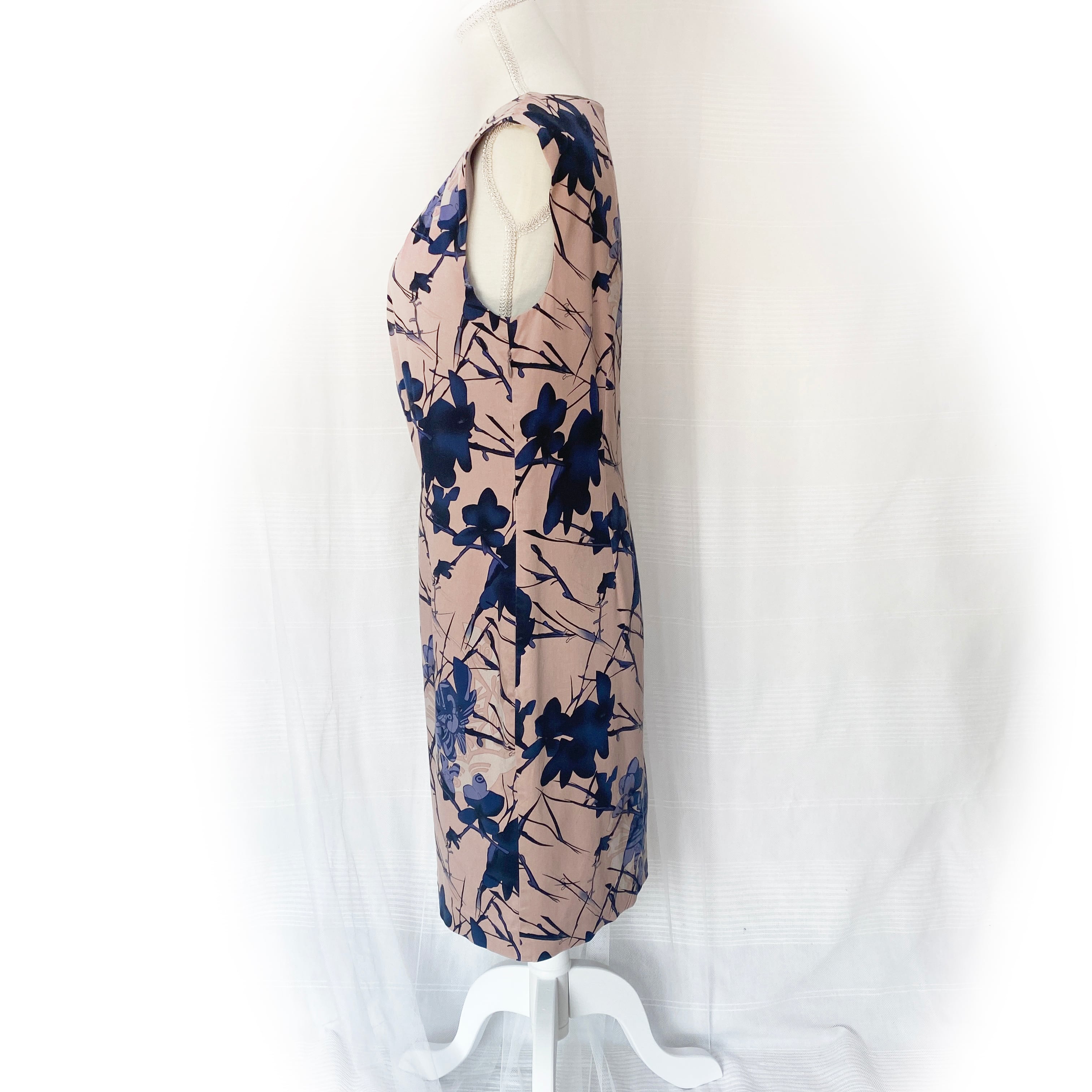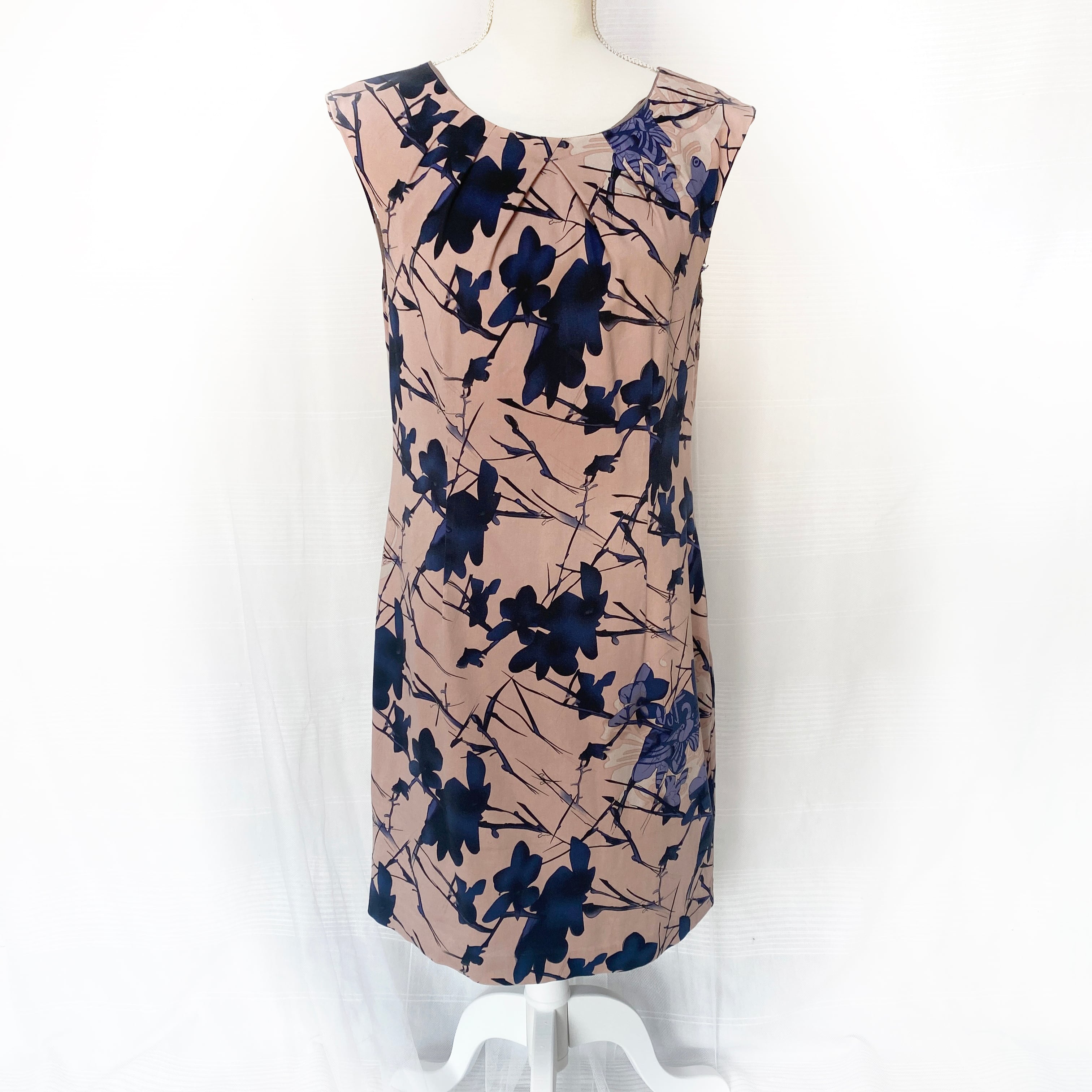 やや赤みがかったベージュに、滲んだようなネイビーで描かれた花のシルエットが印象的なワンピース。
