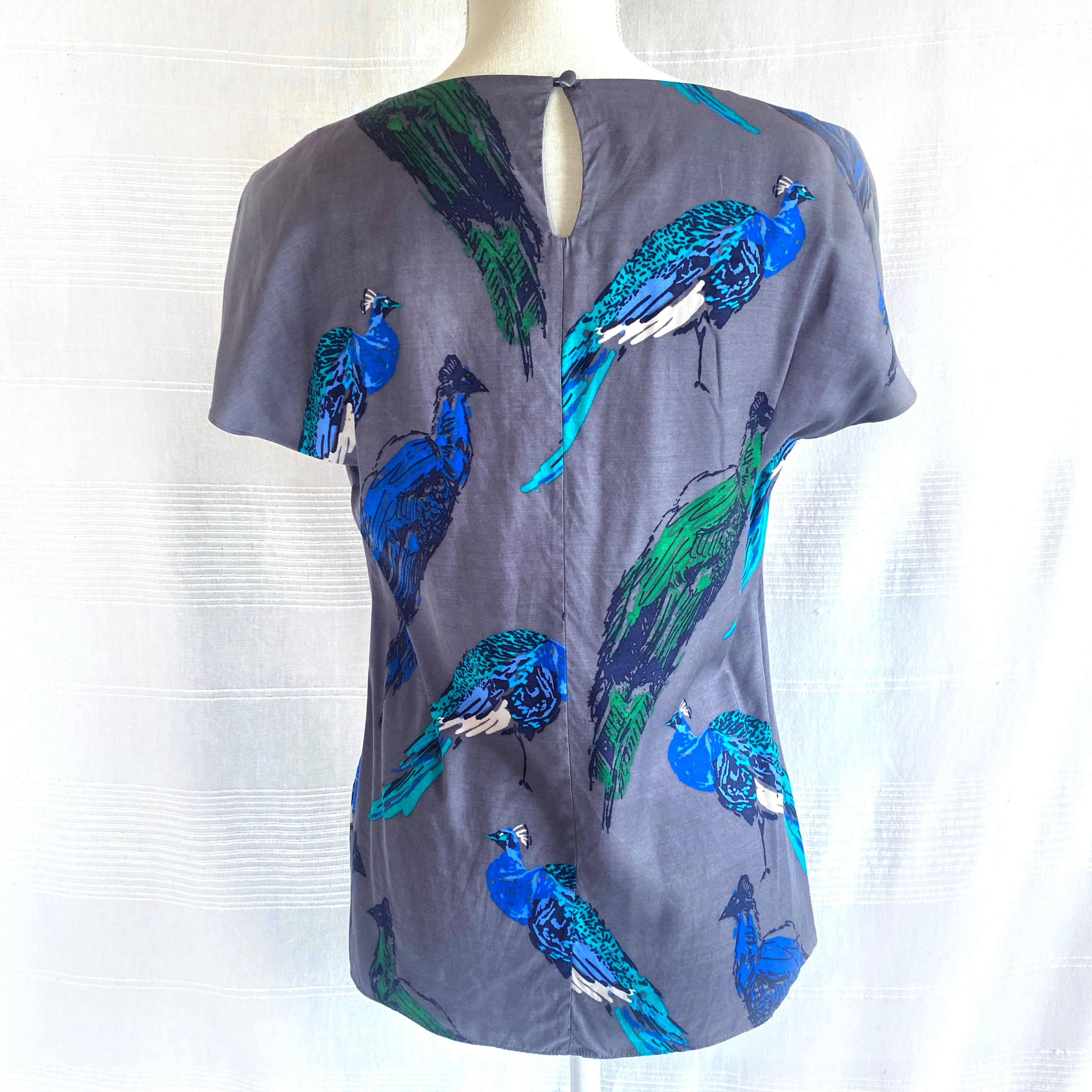 グレーにグリーンとブルーで鮮やかな孔雀がプリントされたショートスリーブのトップス。