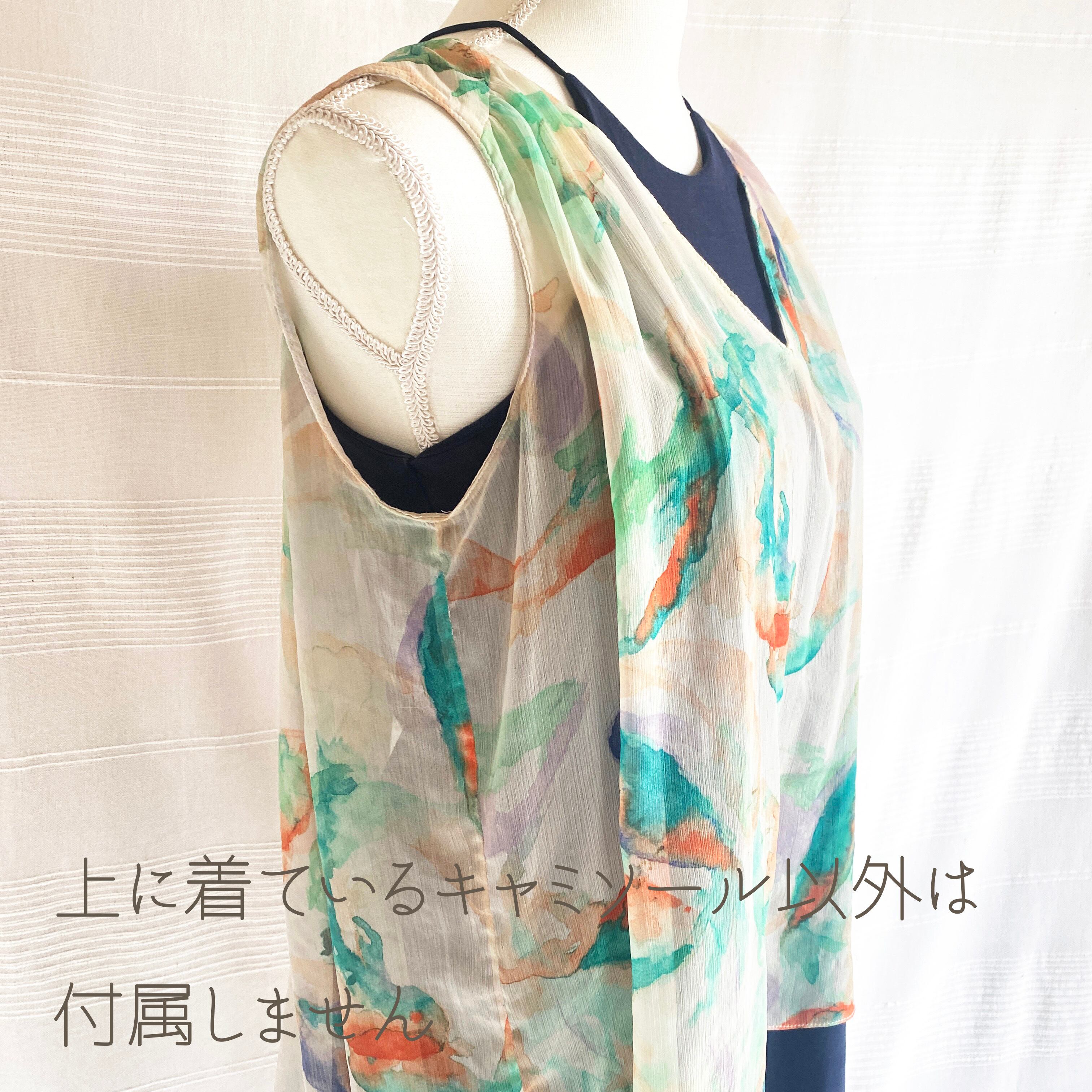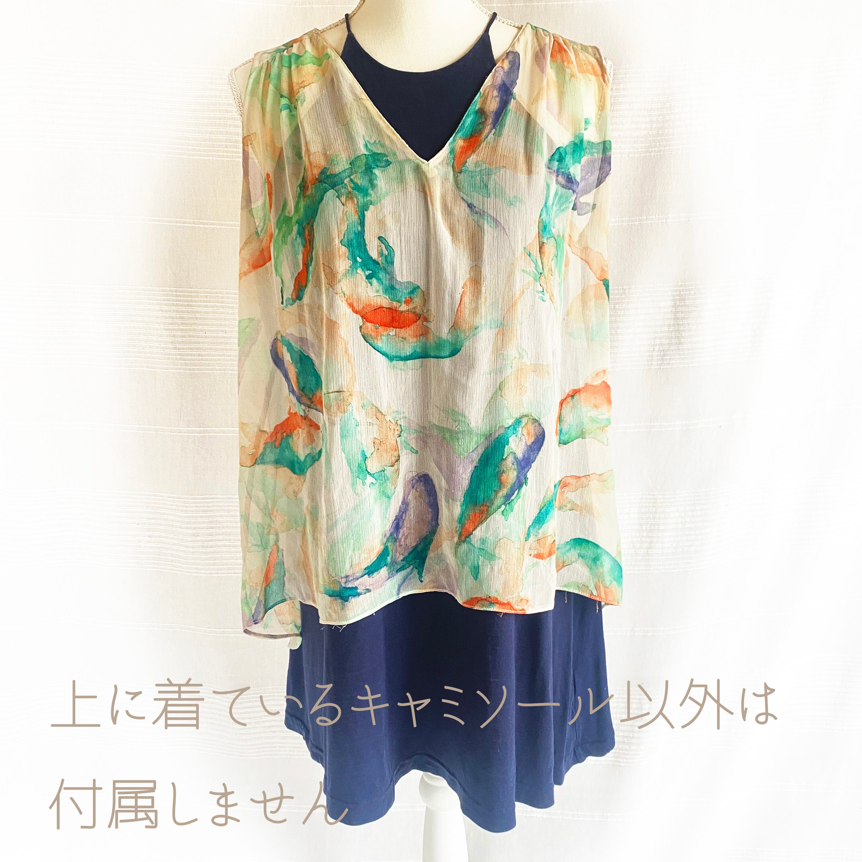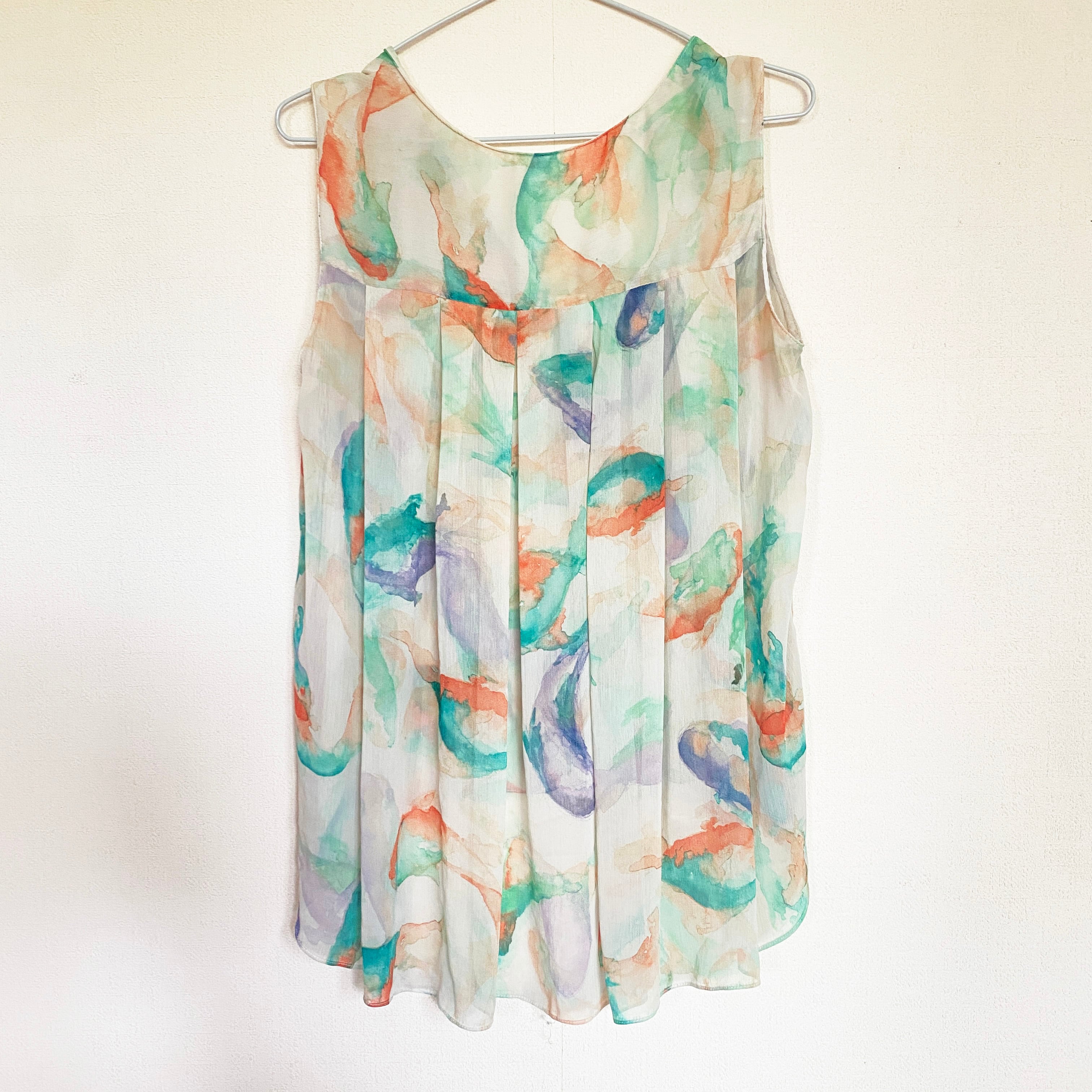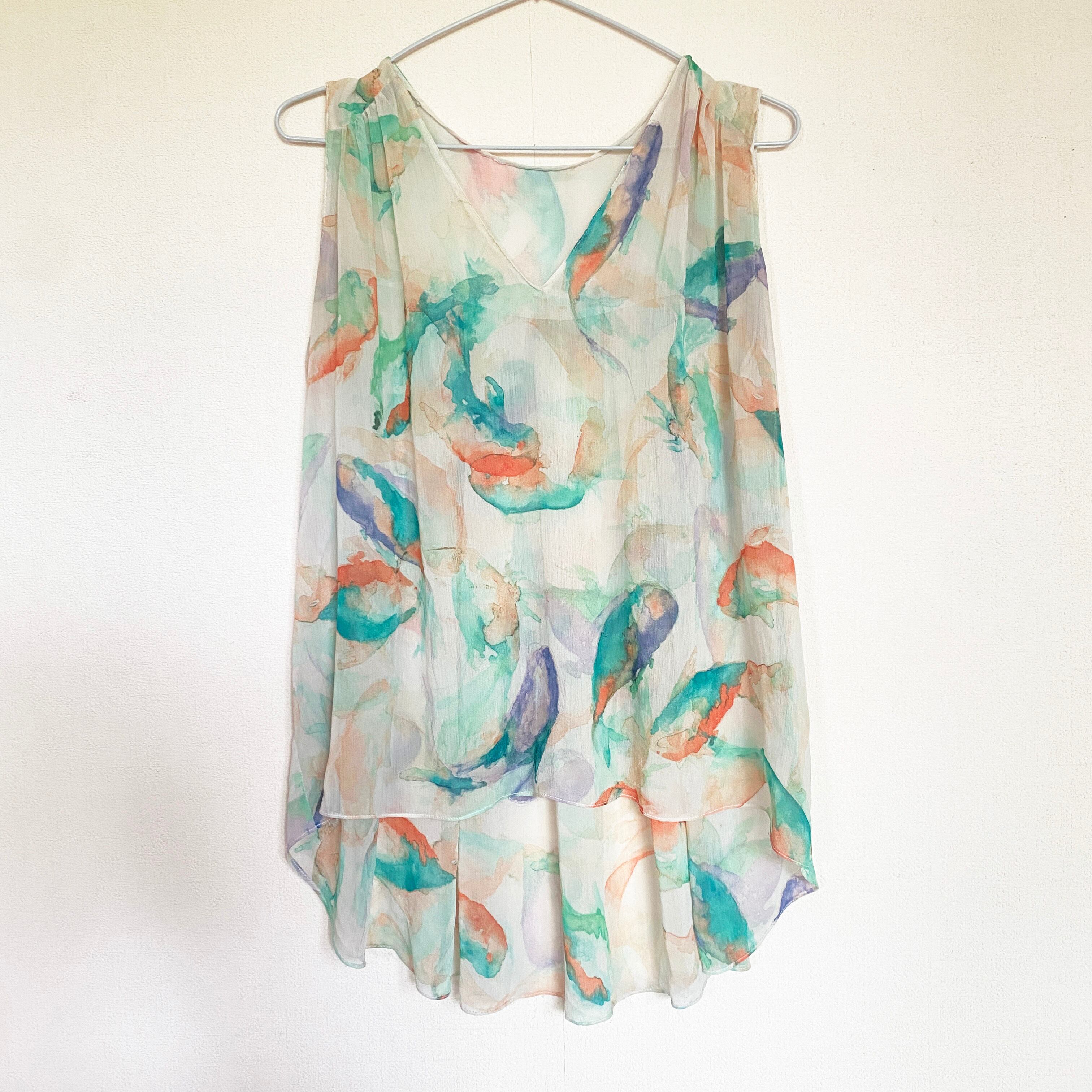 シアーな生地にグリーンとオレンジの滲んだような水彩のランダムペイントのタンクトップ。