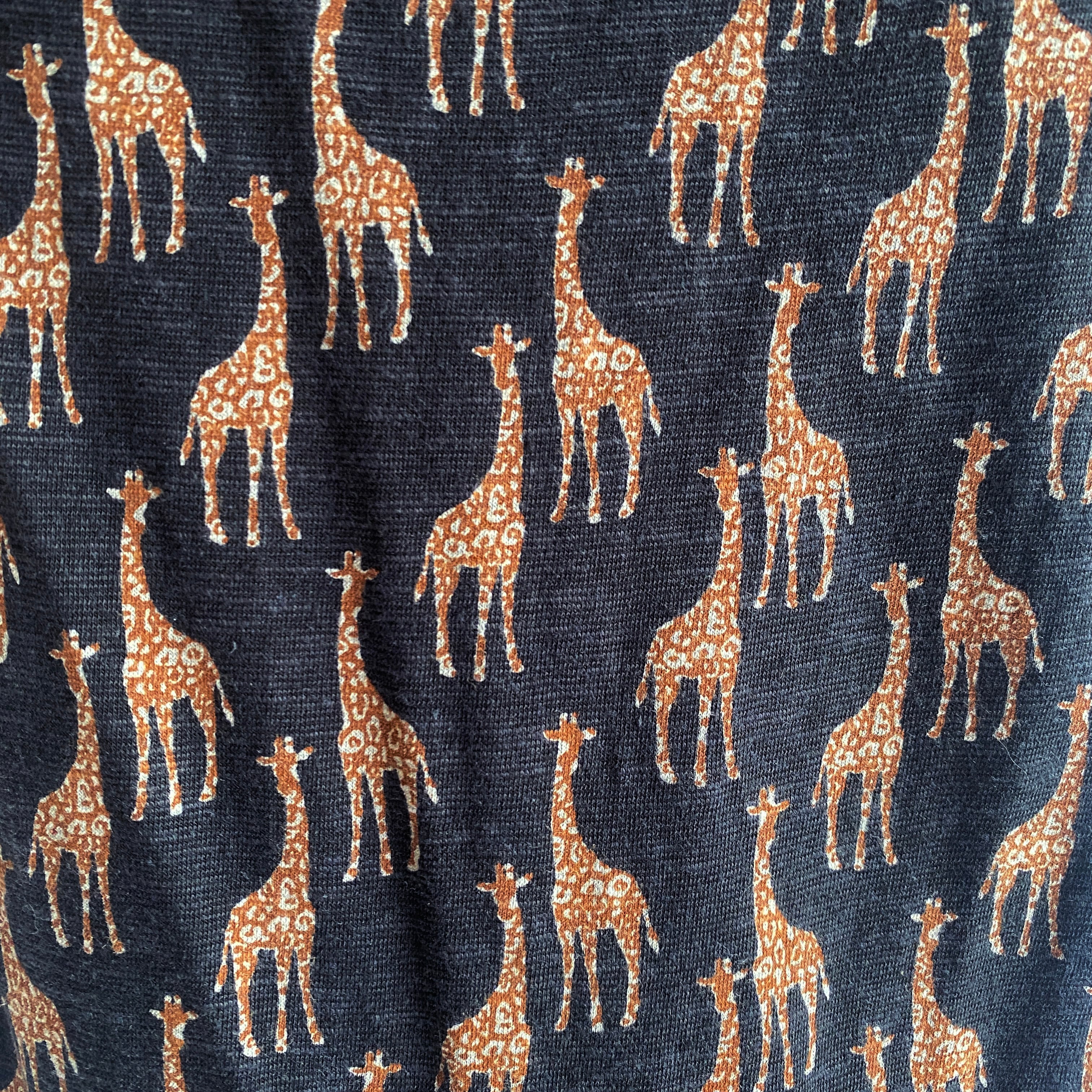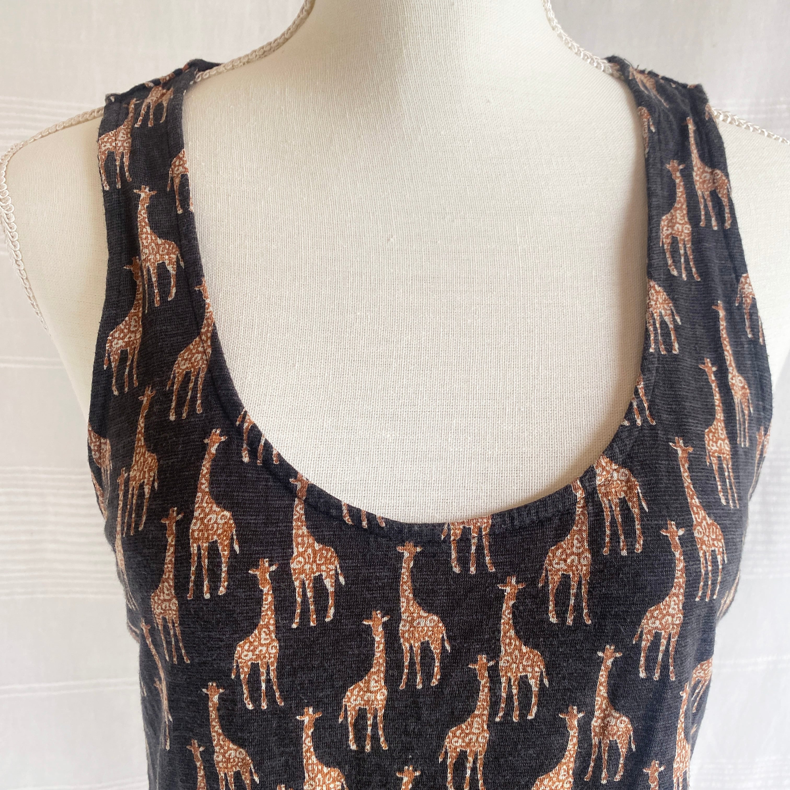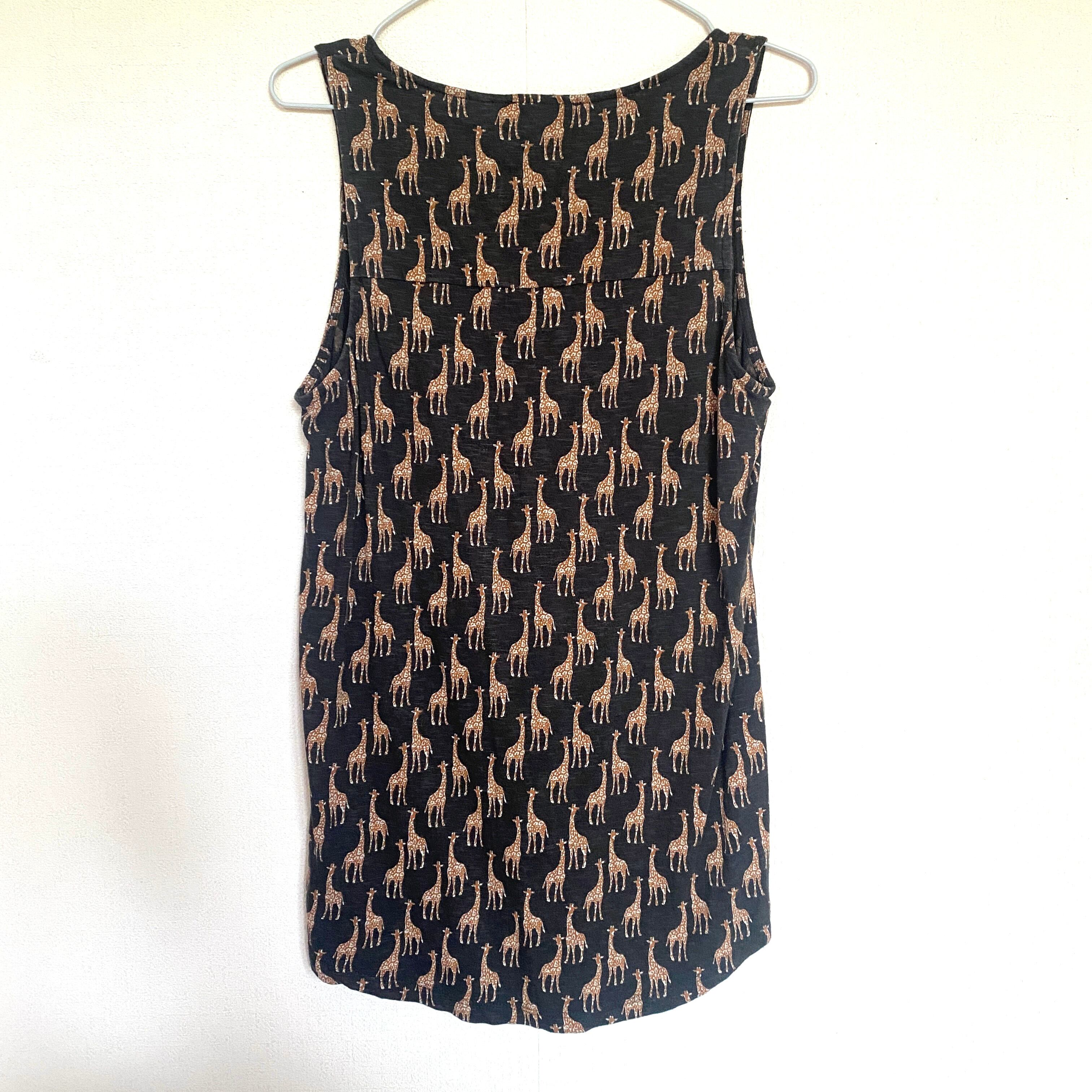 黒に木彫りのスタンプのようなキリンのパターンが全体にプリントされたタンクトップ。