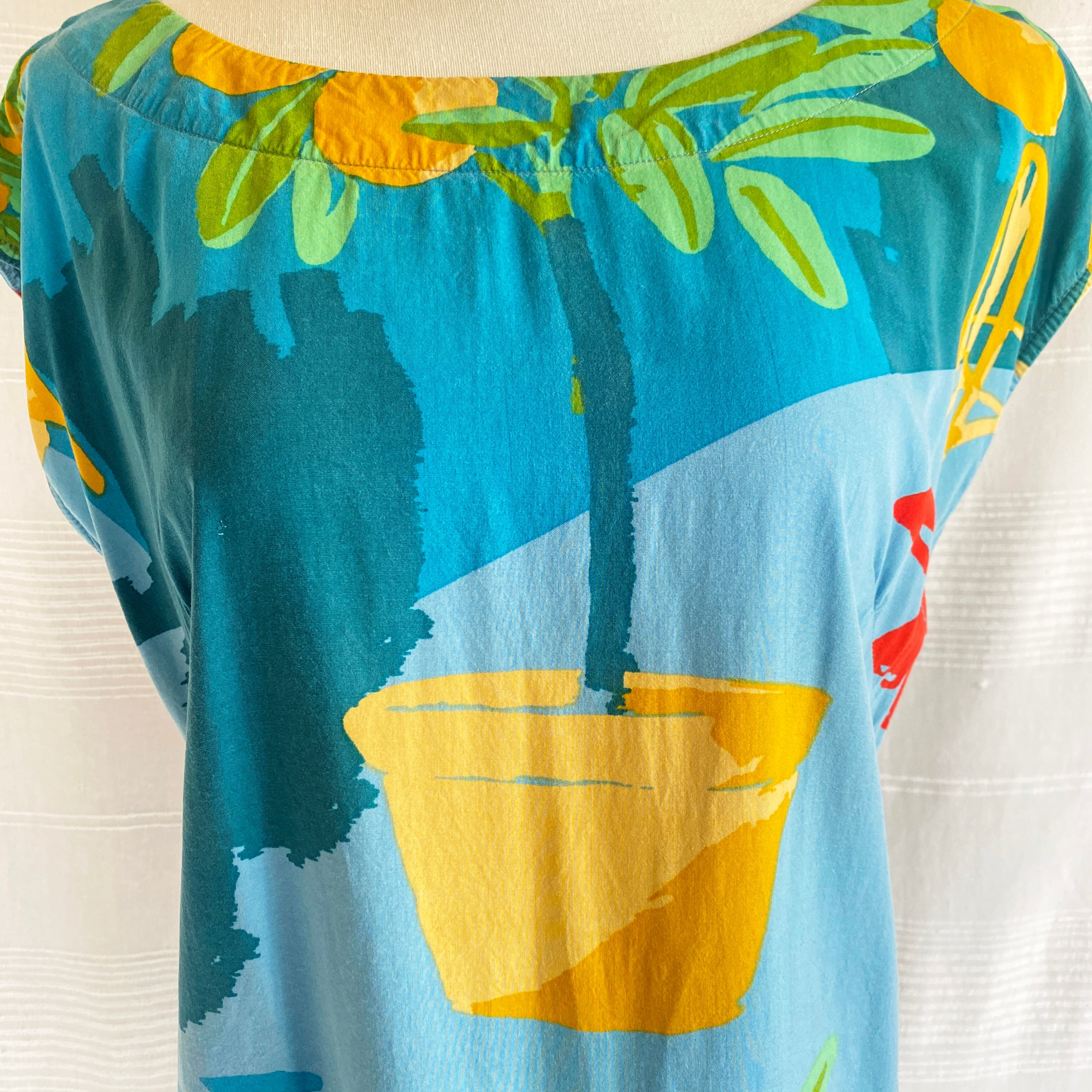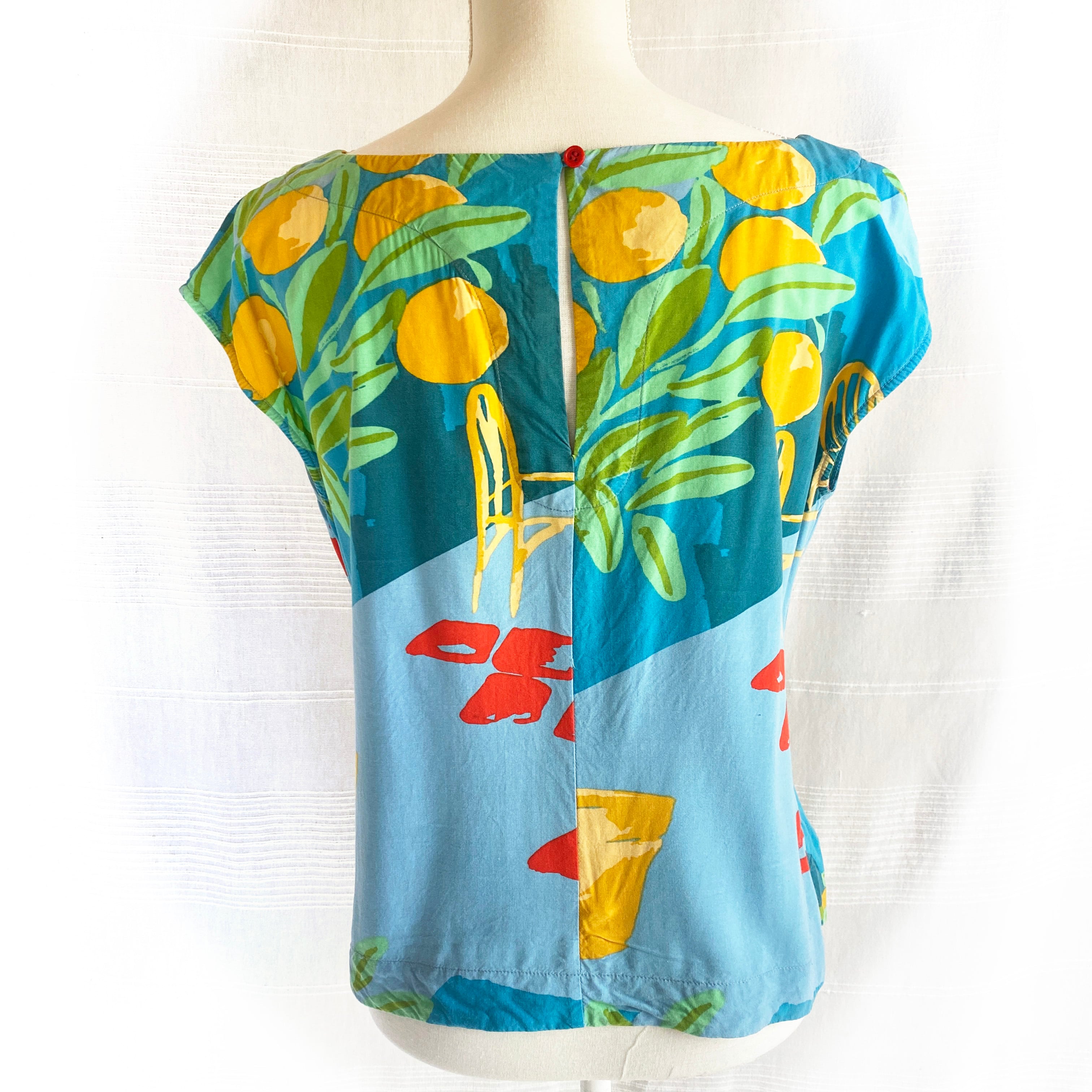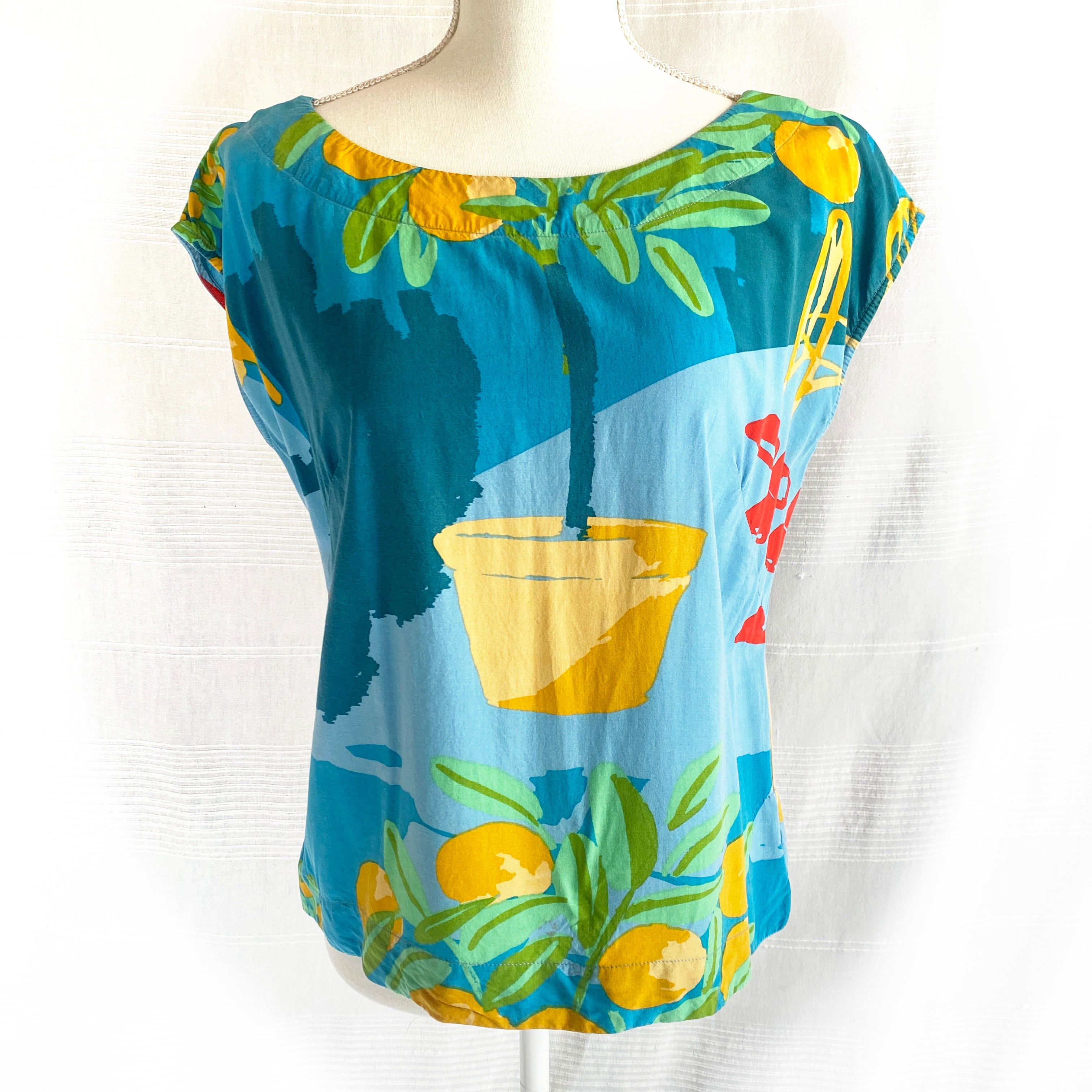 ビビッドなブルーとグリーンにぱきっと映えるレモンの植木鉢が大胆にプリントされたトップス。気分が上向きになるしかない、そんな一枚です。
