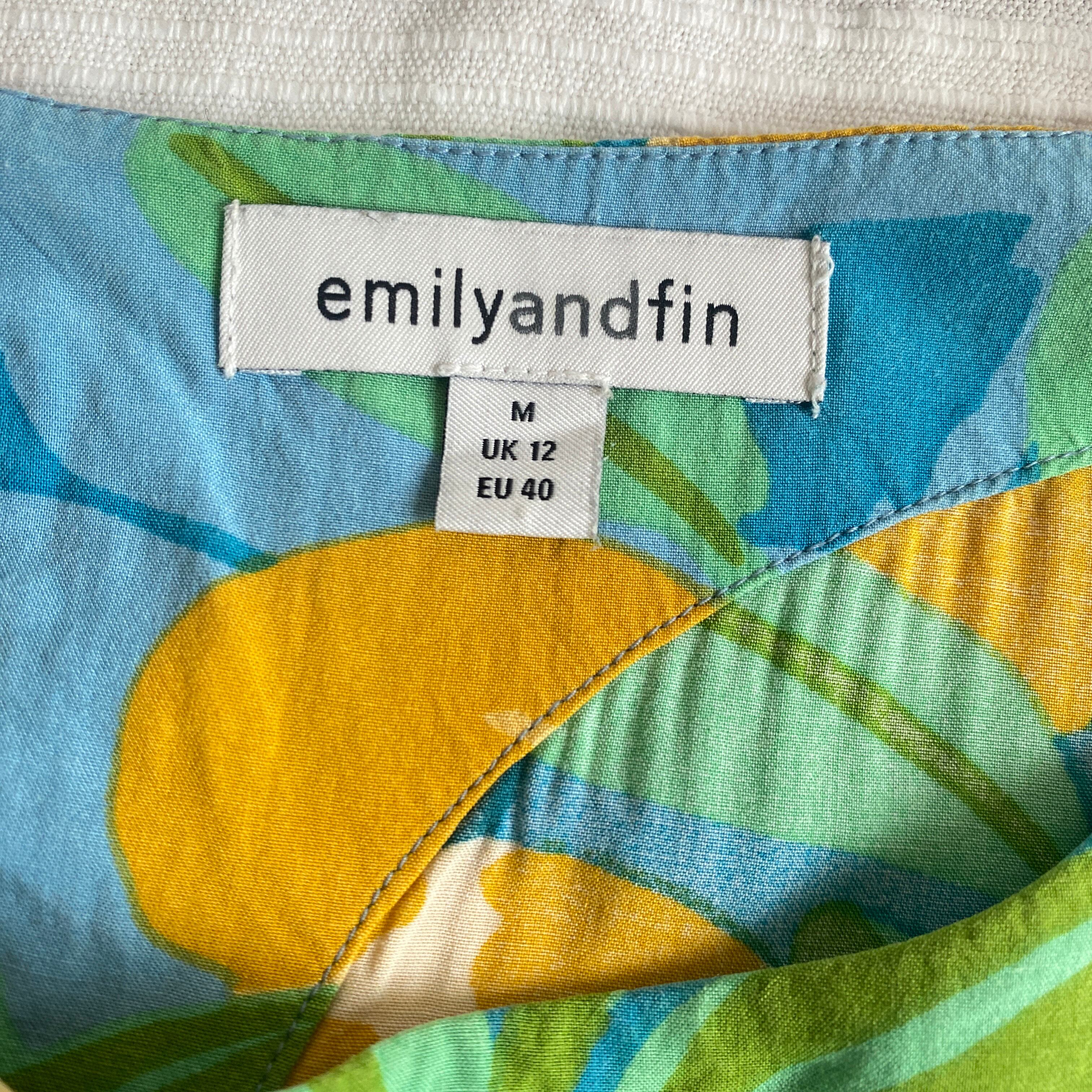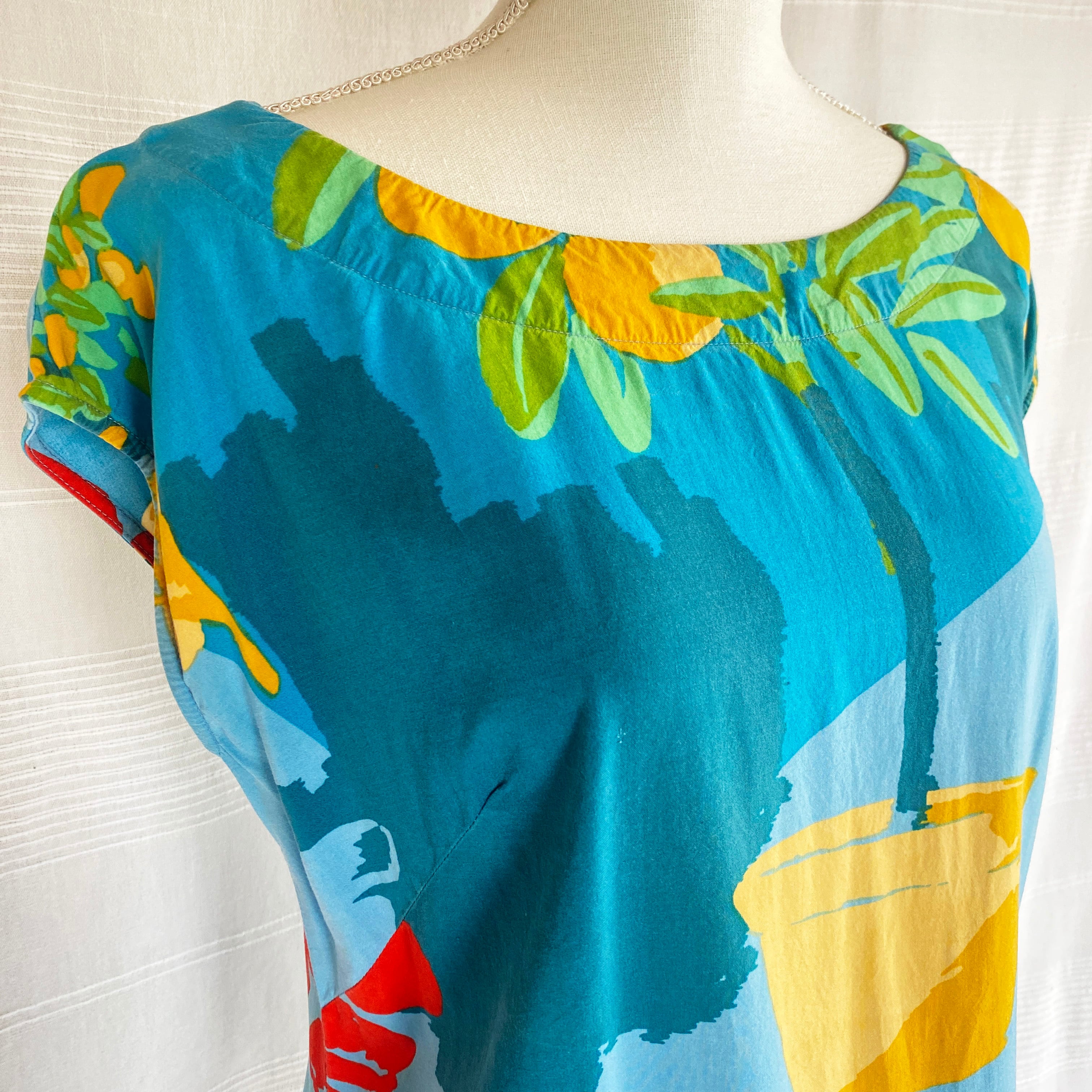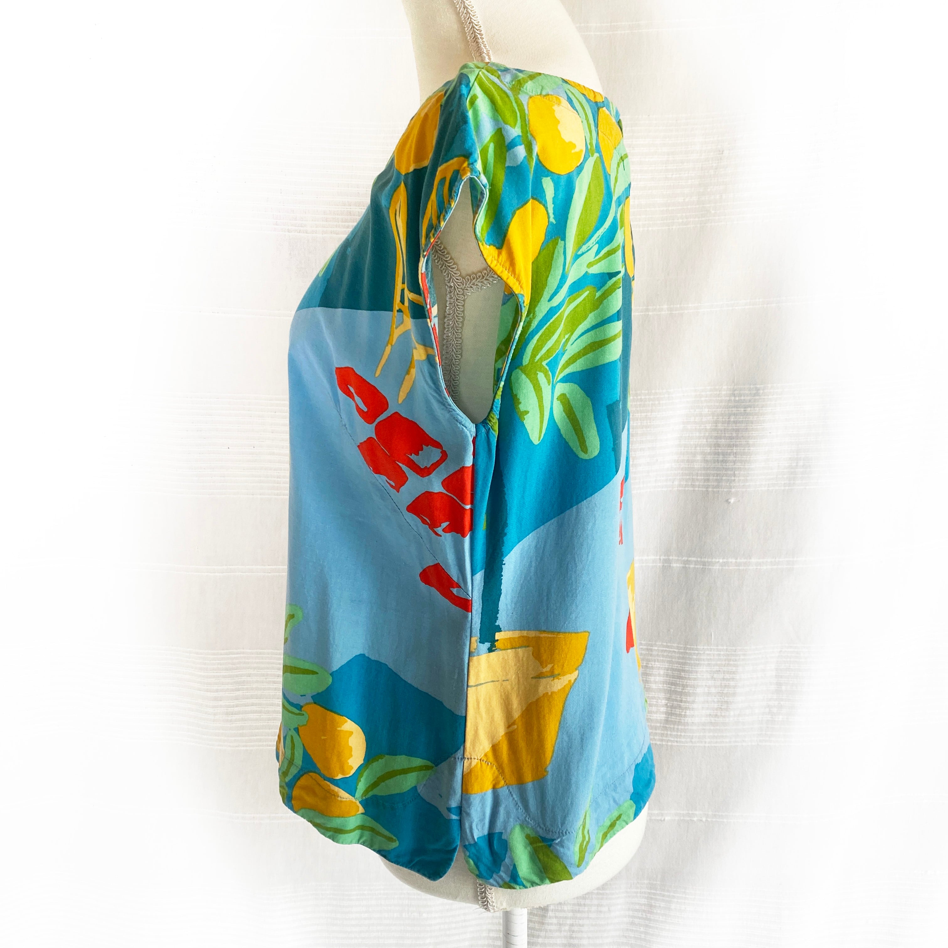 ビビッドなブルーとグリーンにぱきっと映えるレモンの植木鉢が大胆にプリントされたトップス。気分が上向きになるしかない、そんな一枚です。