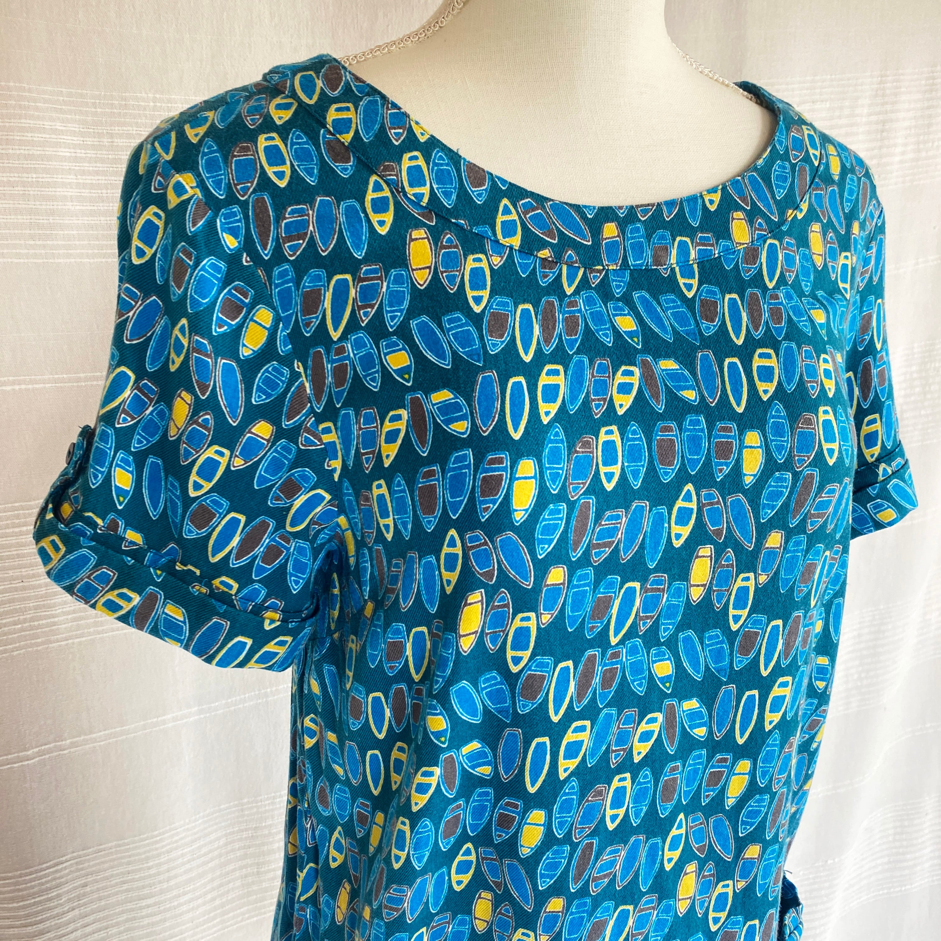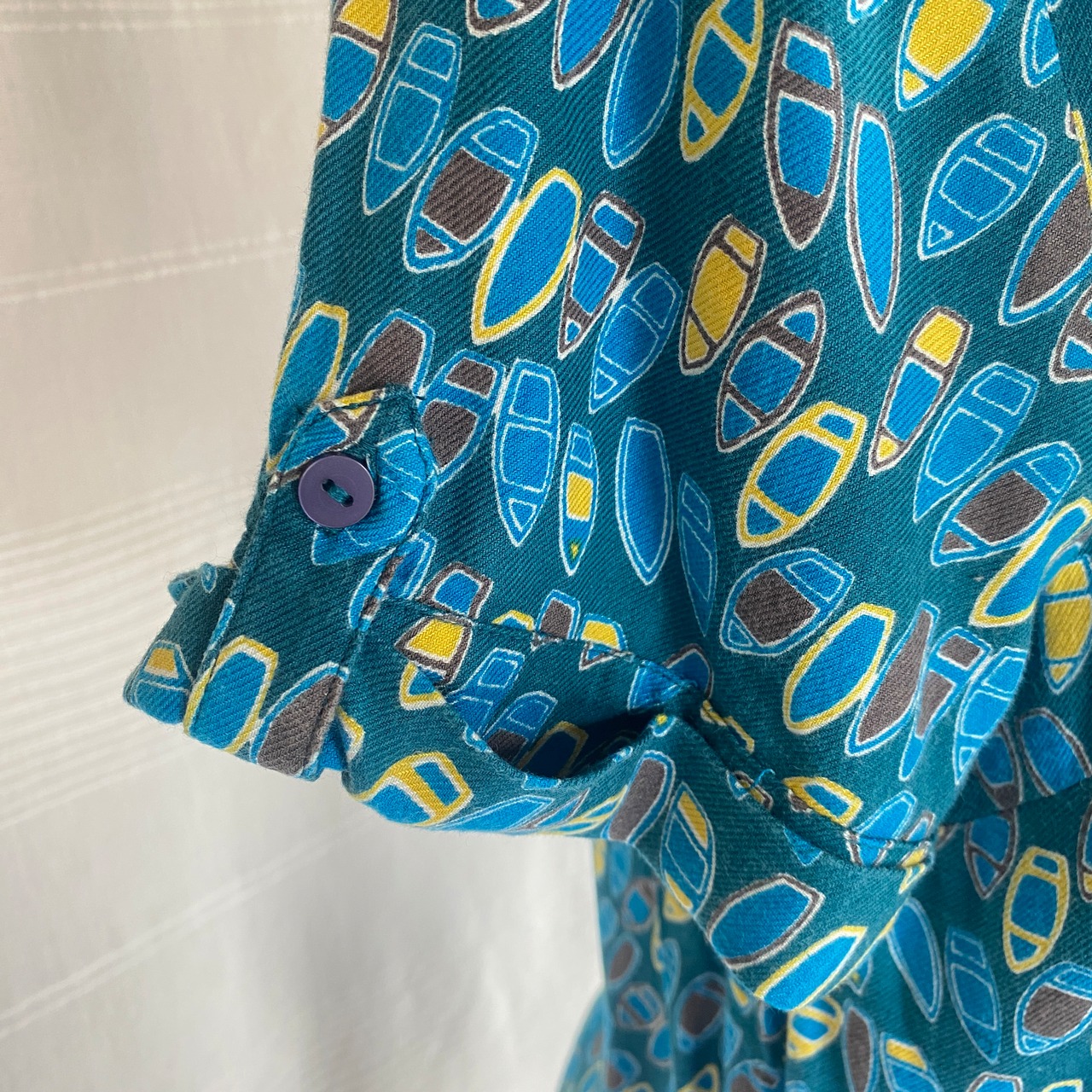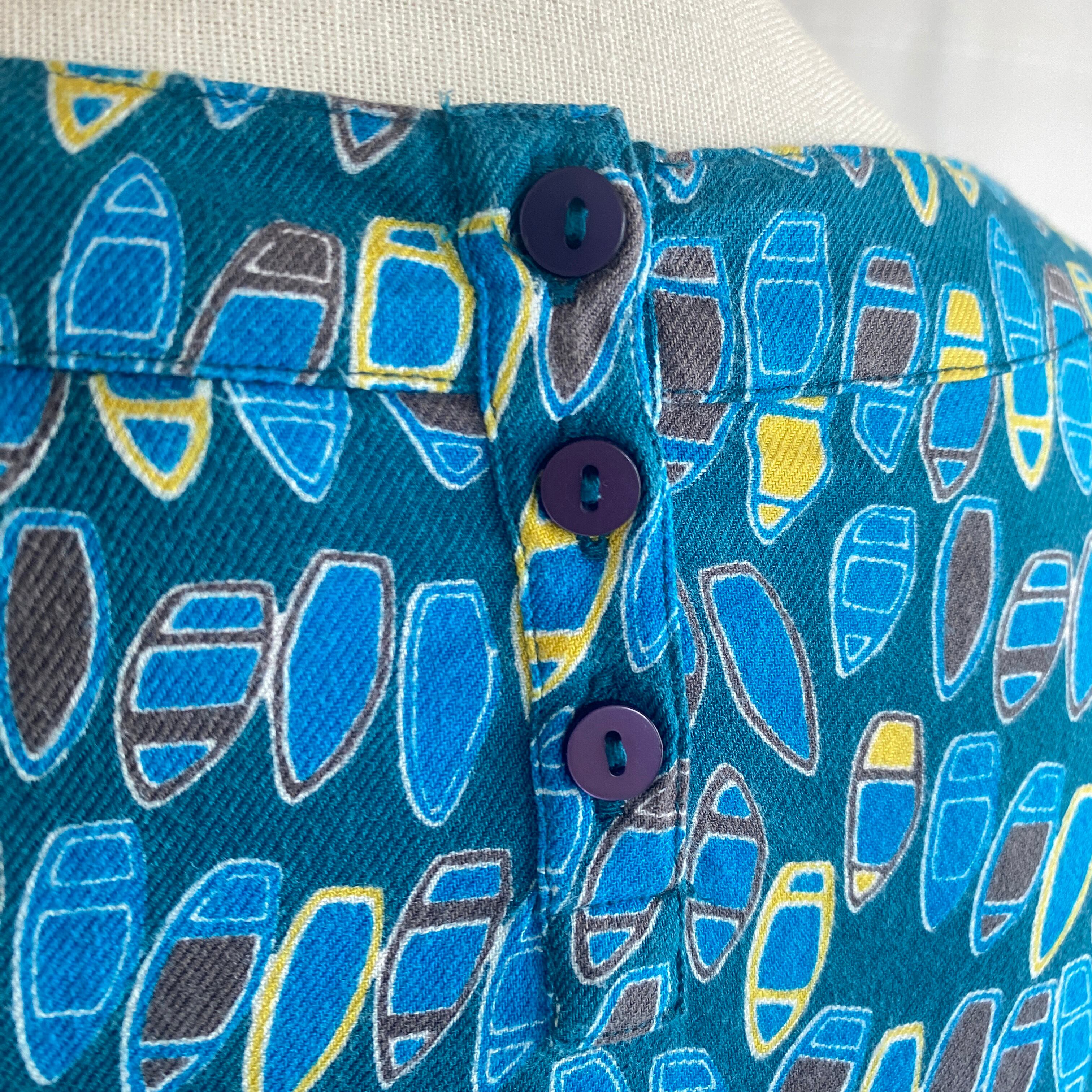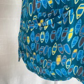 濃いめのブルーグリーンに、イエロー・ブルー・グレーで描かれた沢山のボート模様がかわいいトップスです。袖の折り返しや、ポケット、背中のボタンのディティールにも抜かりのない一枚。