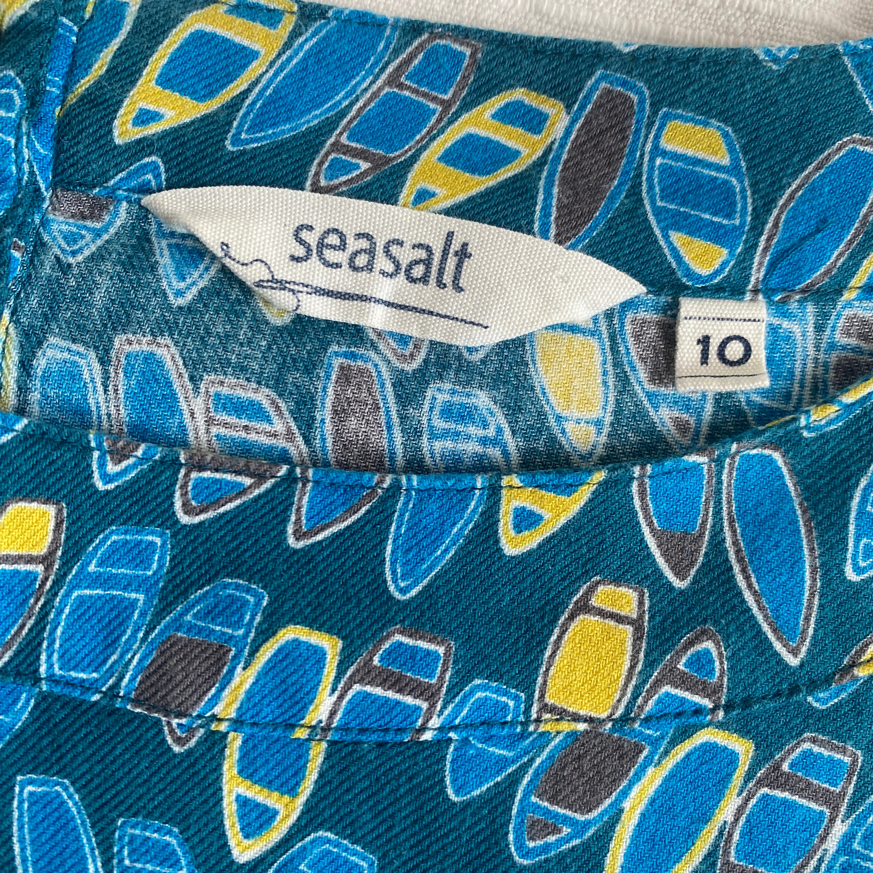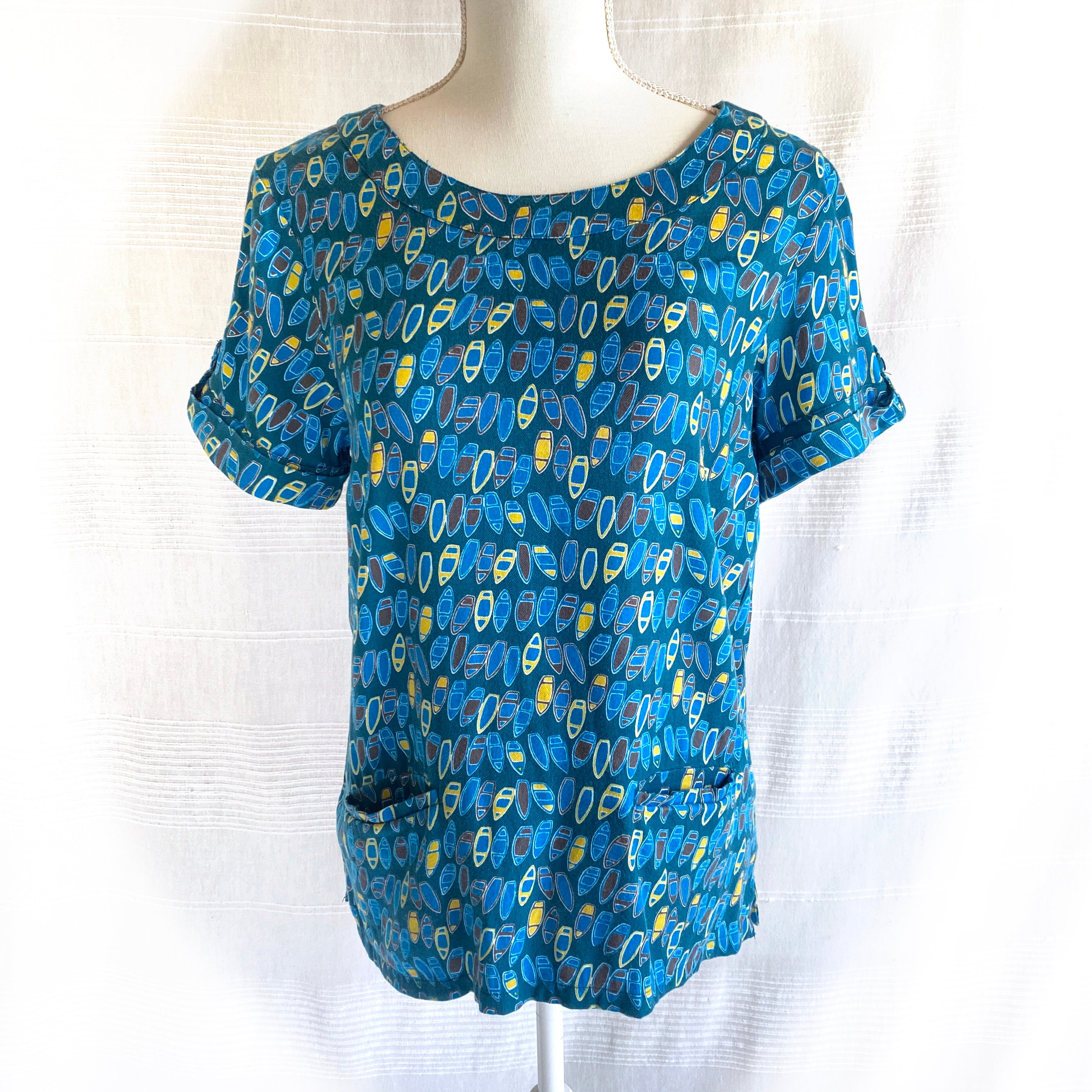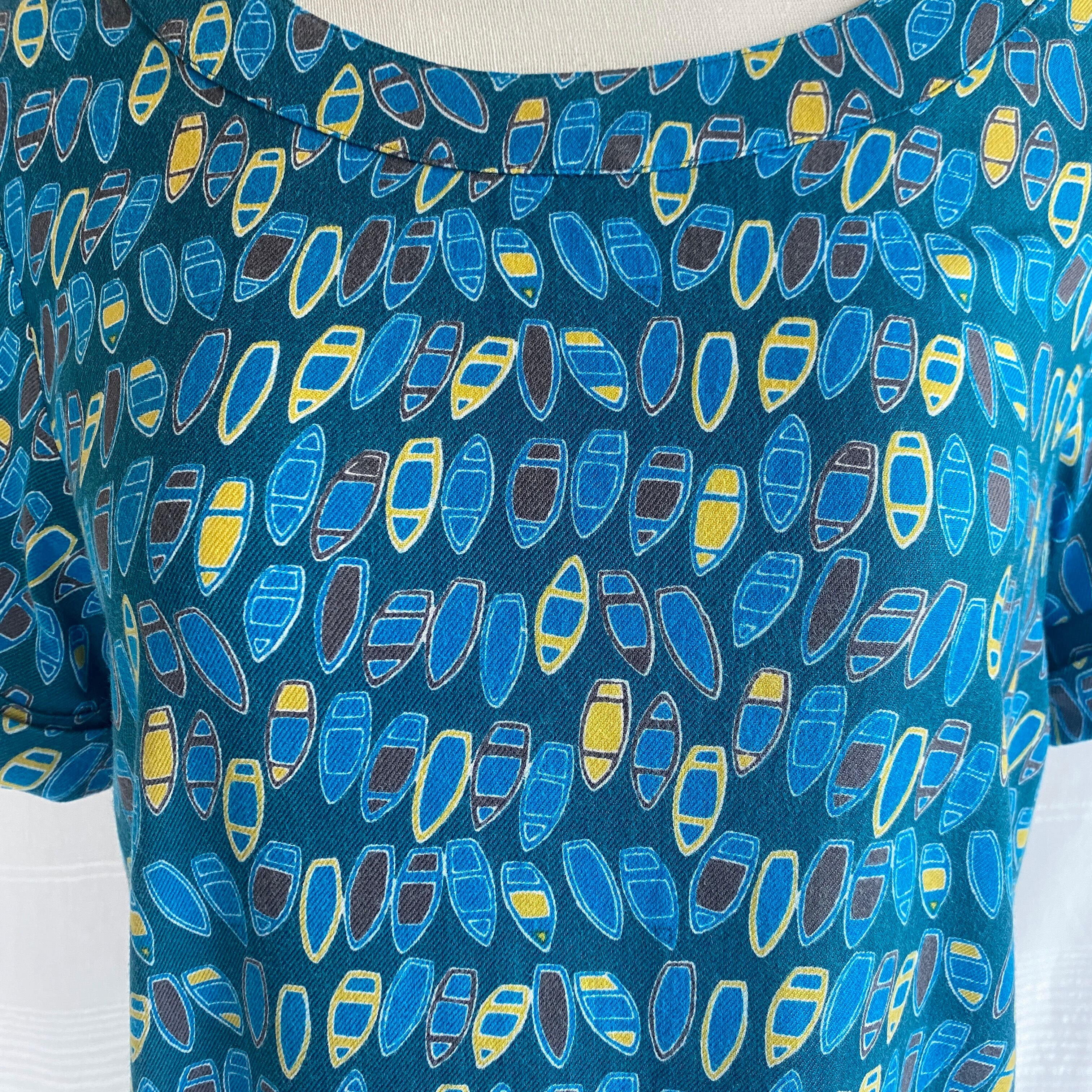 濃いめのブルーグリーンに、イエロー・ブルー・グレーで描かれた沢山のボート模様がかわいいトップスです。袖の折り返しや、ポケット、背中のボタンのディティールにも抜かりのない一枚。