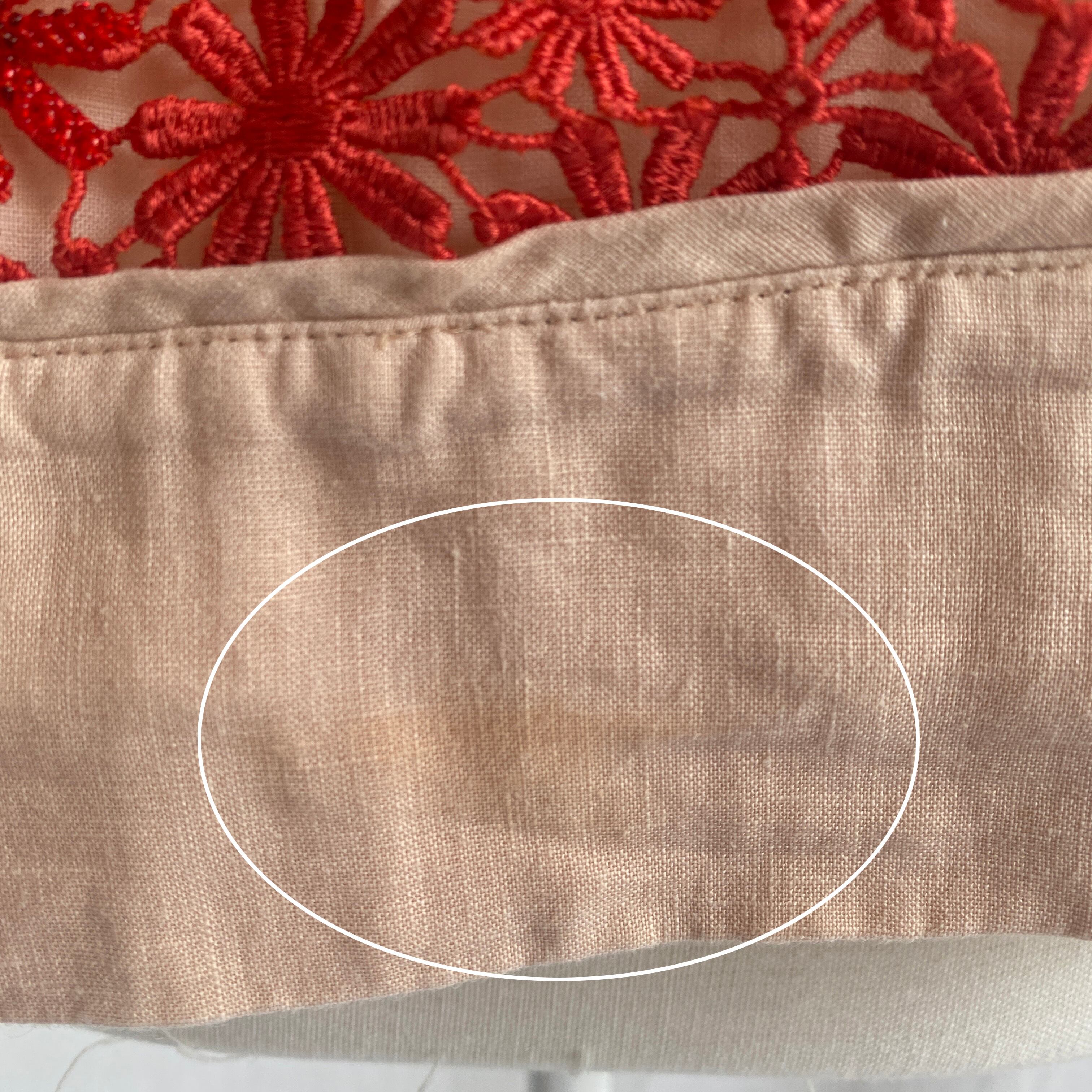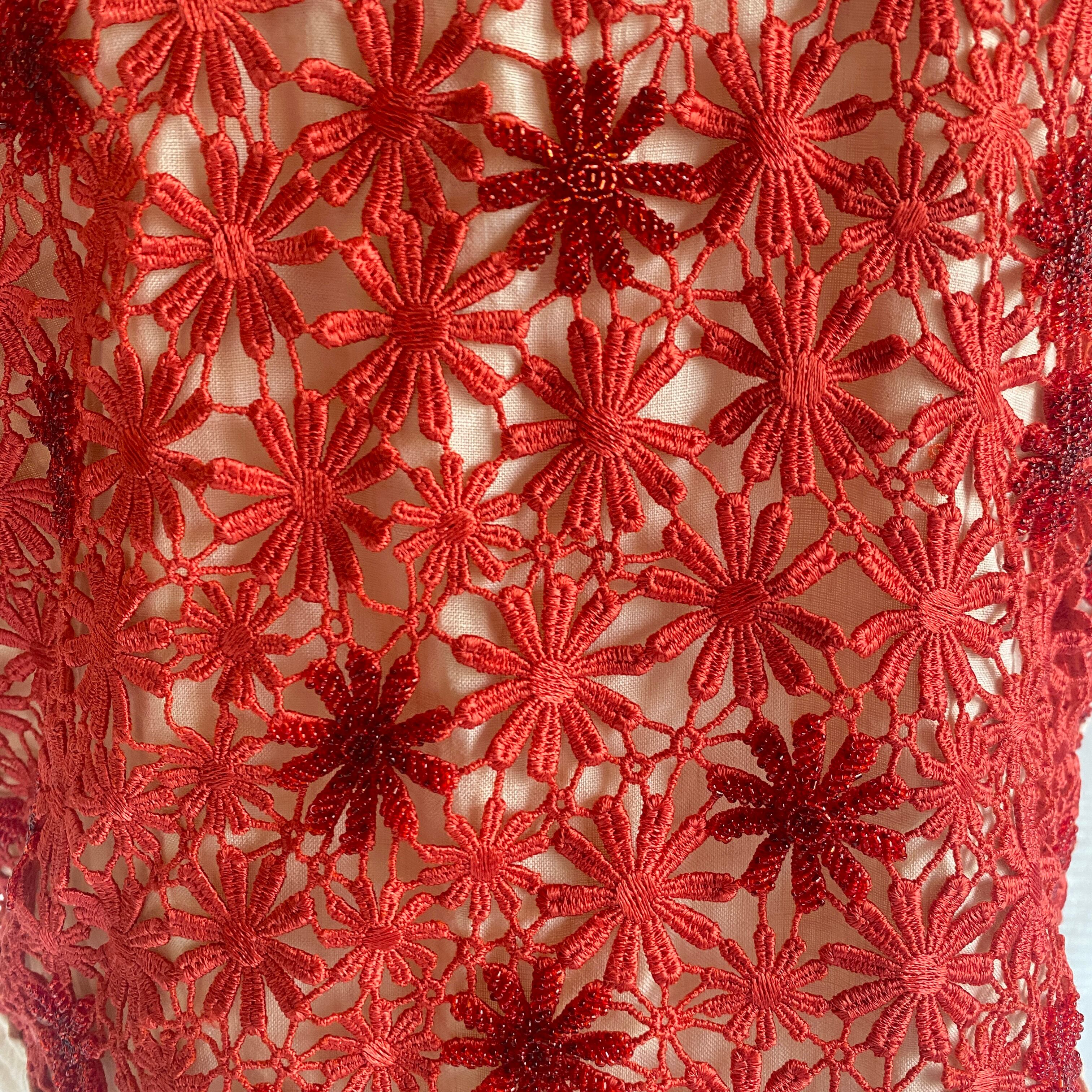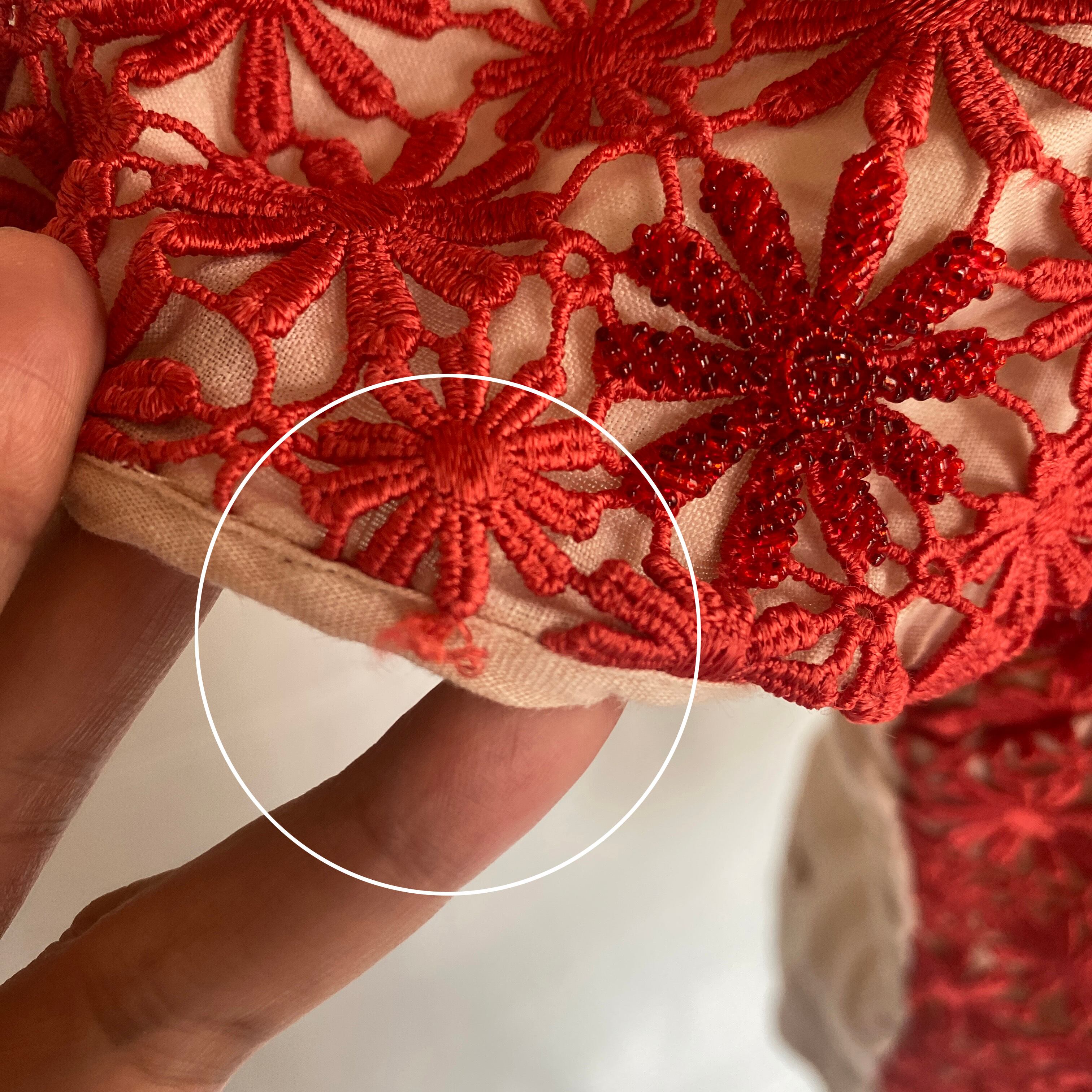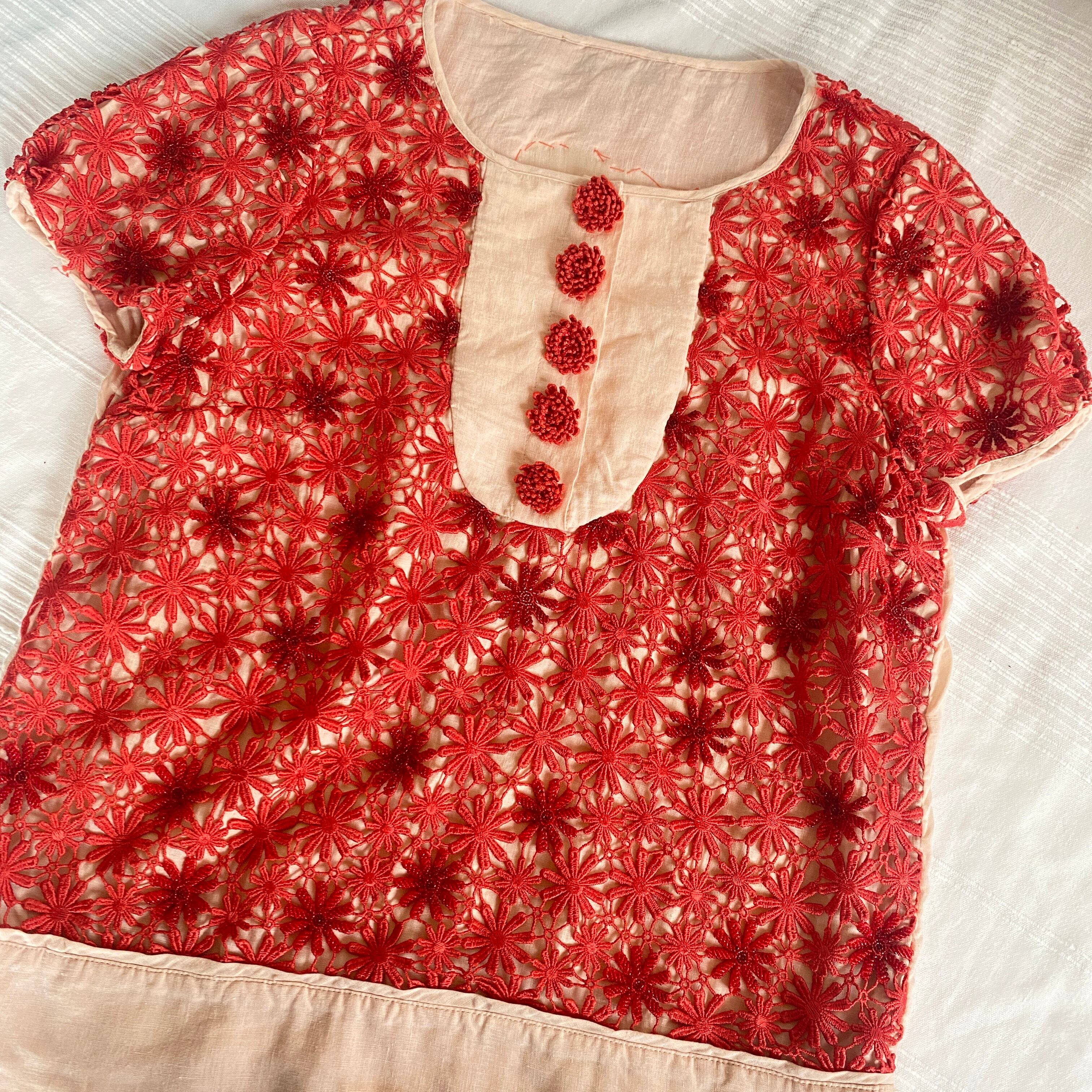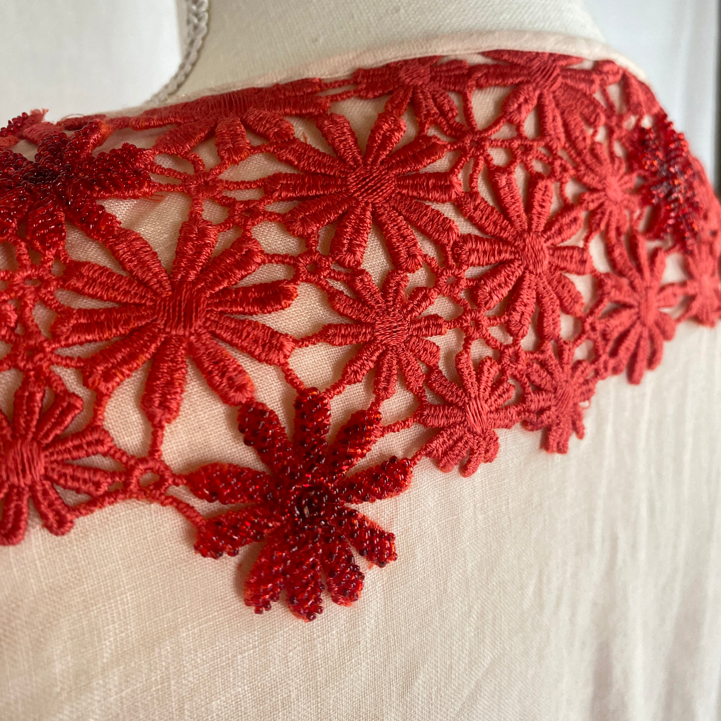 リネンライクな生地に、オレンジよりの赤で、お花のモチーフを繋いだ刺繍レースを贅沢に重ねた、ハンドメイドのトップスです。
