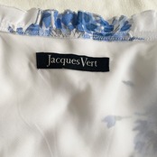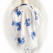 ゆったりとしたシルエットと、ひろくあいた襟元のフリルや、ブルーのフラワープリントがレトロな雰囲気をかもしだしているチュニック。
