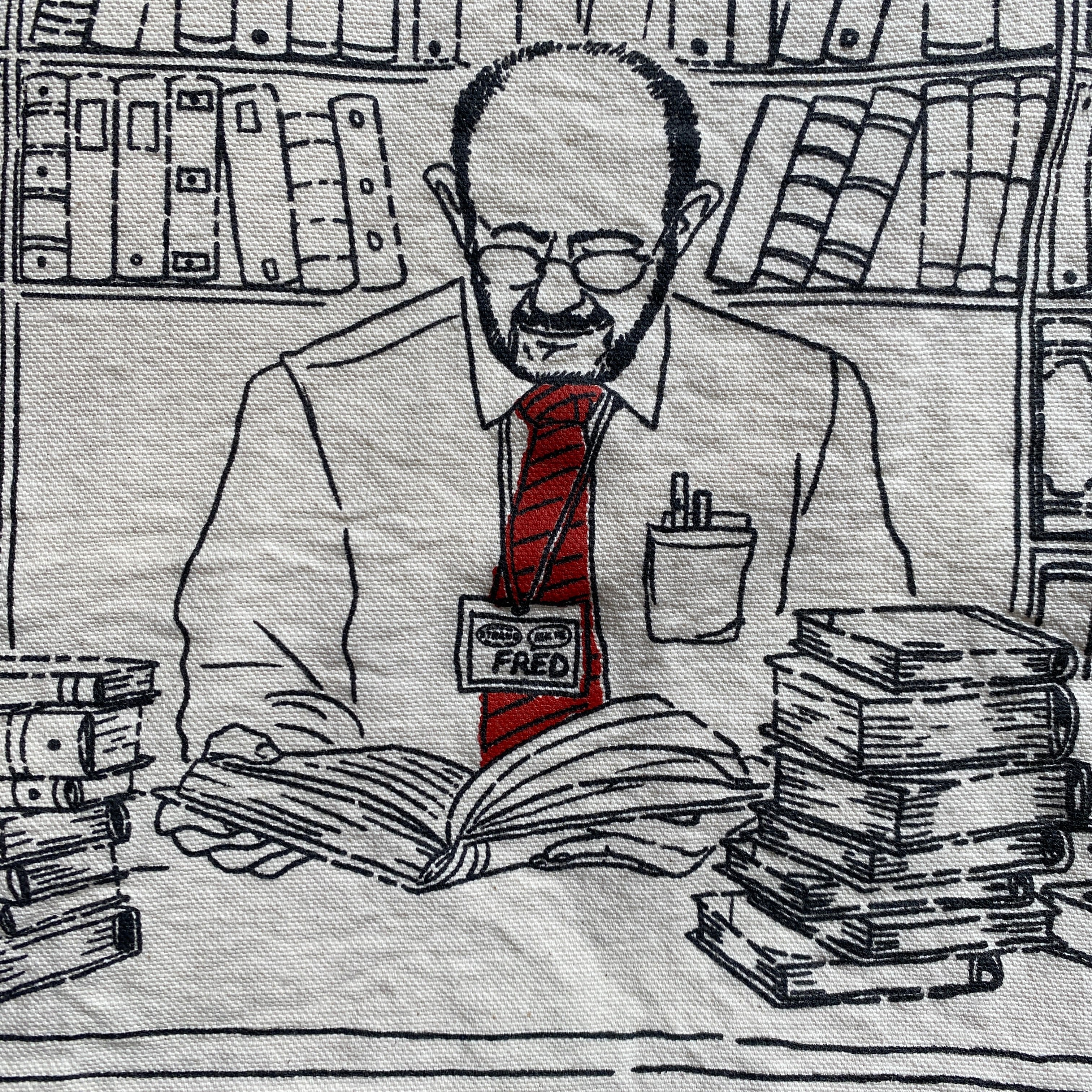 FREDの名札をつけた人が本を広げている線画と、反対の面はストランドブックスのロゴ。