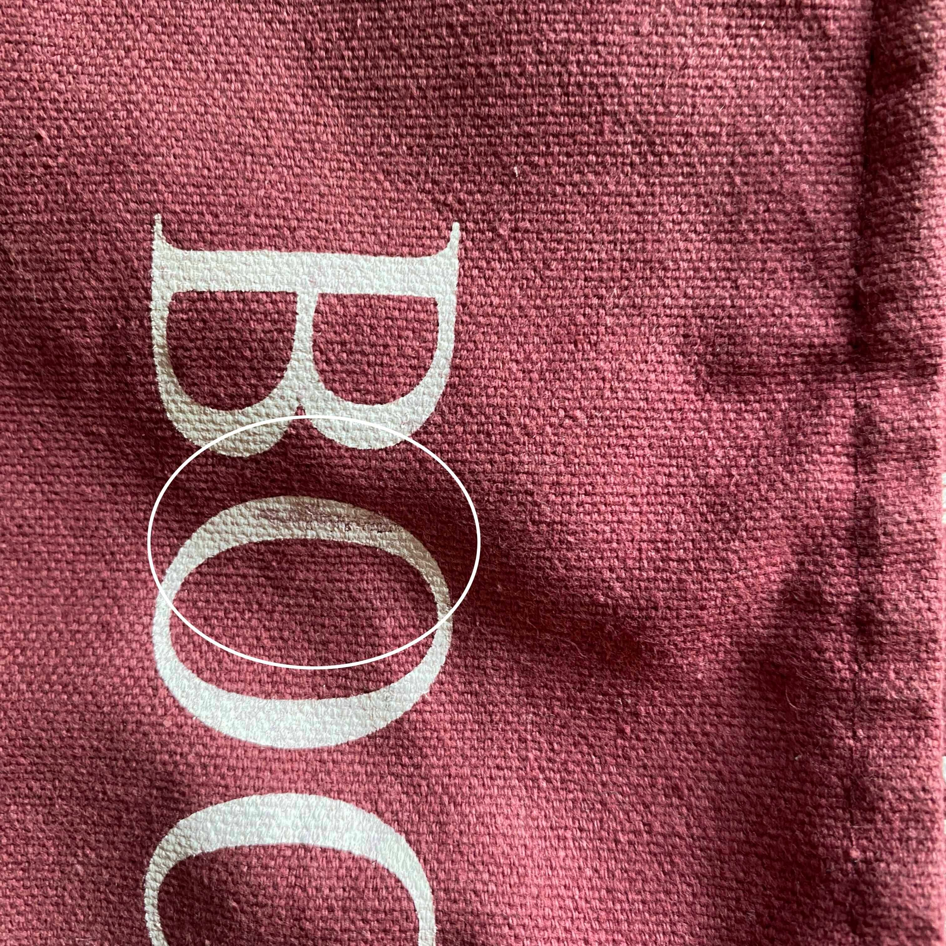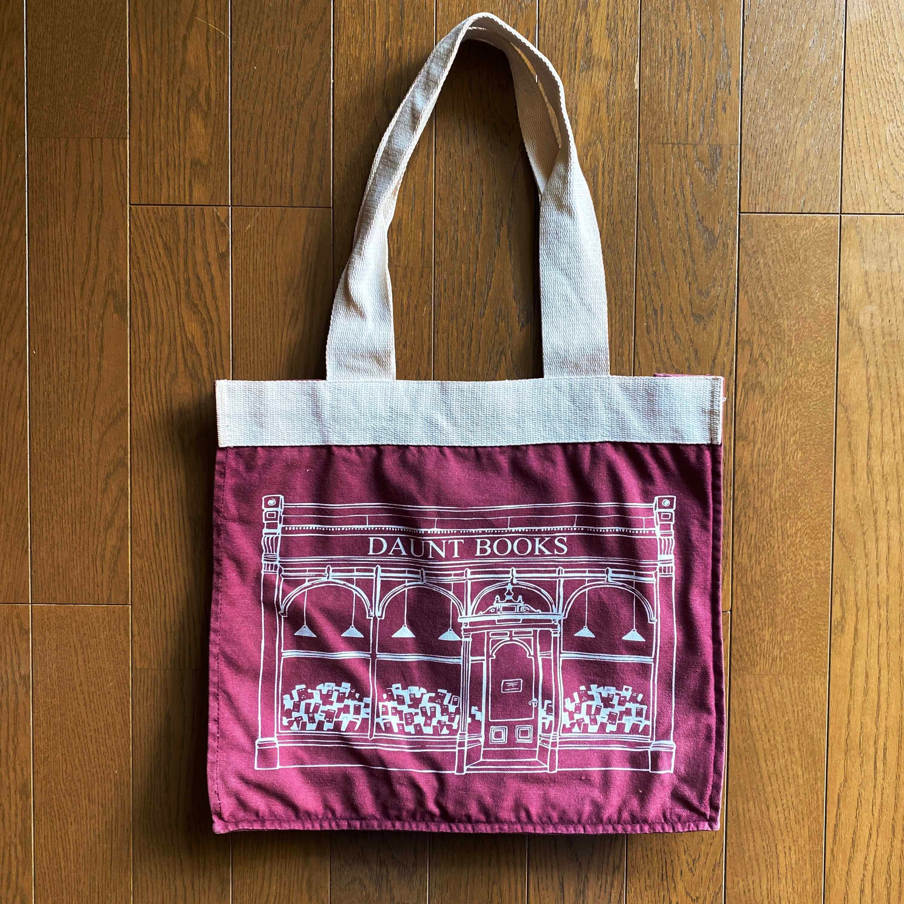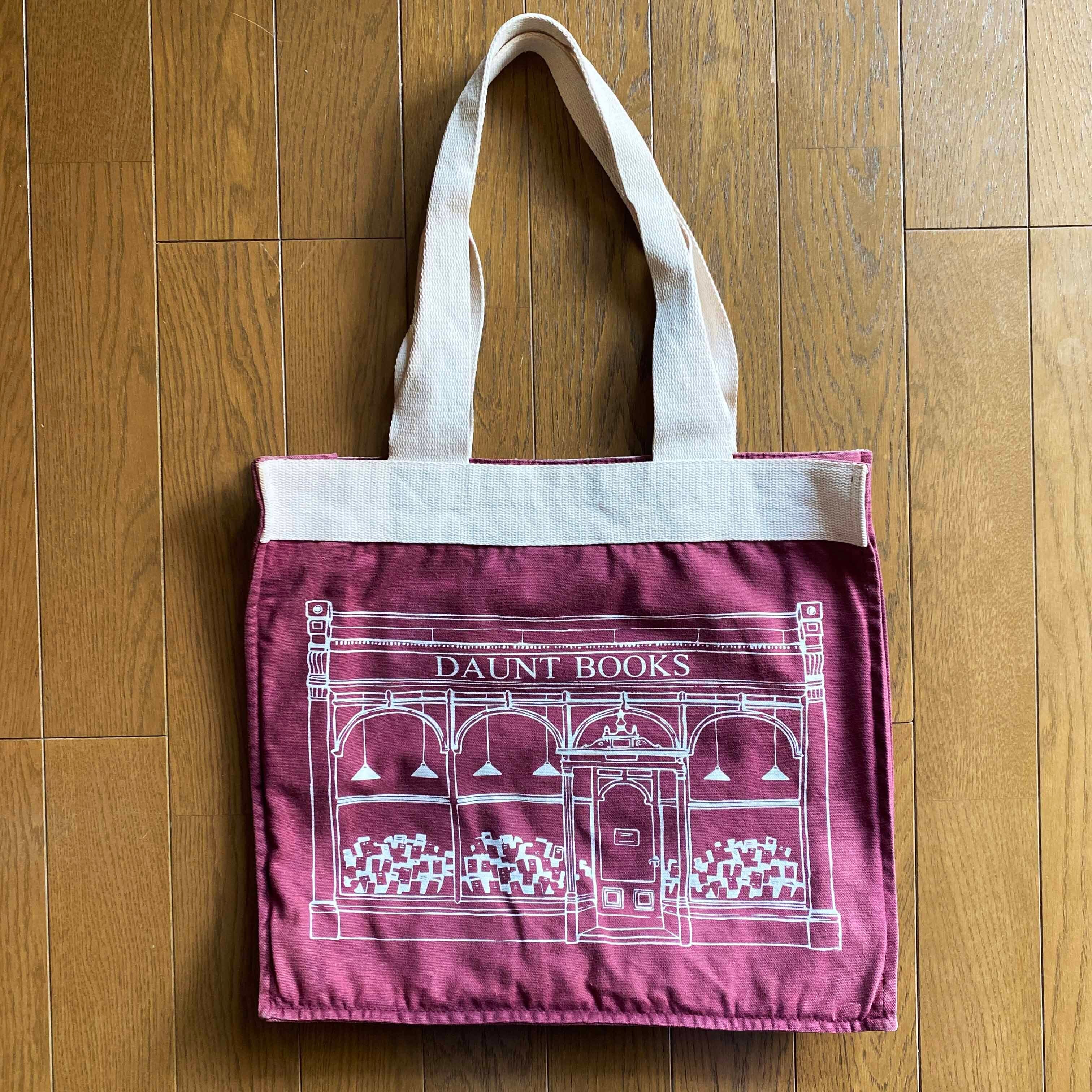 えんじ色の生地に、書店の店頭の線画が白でプリントされています。