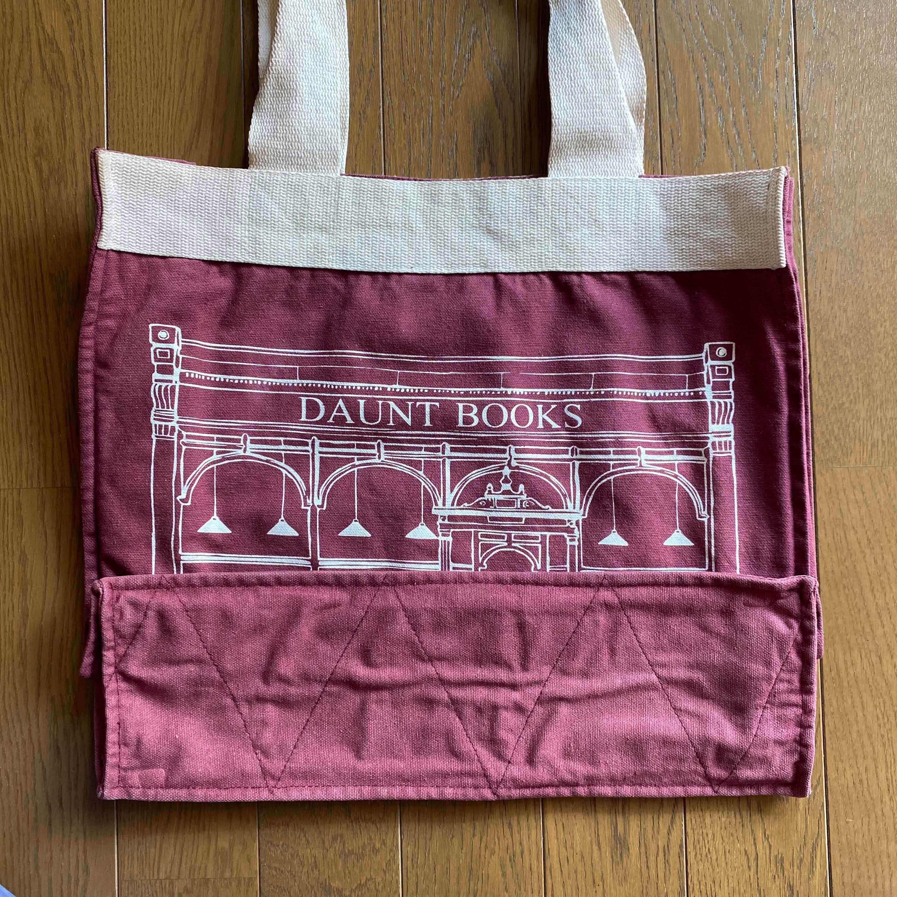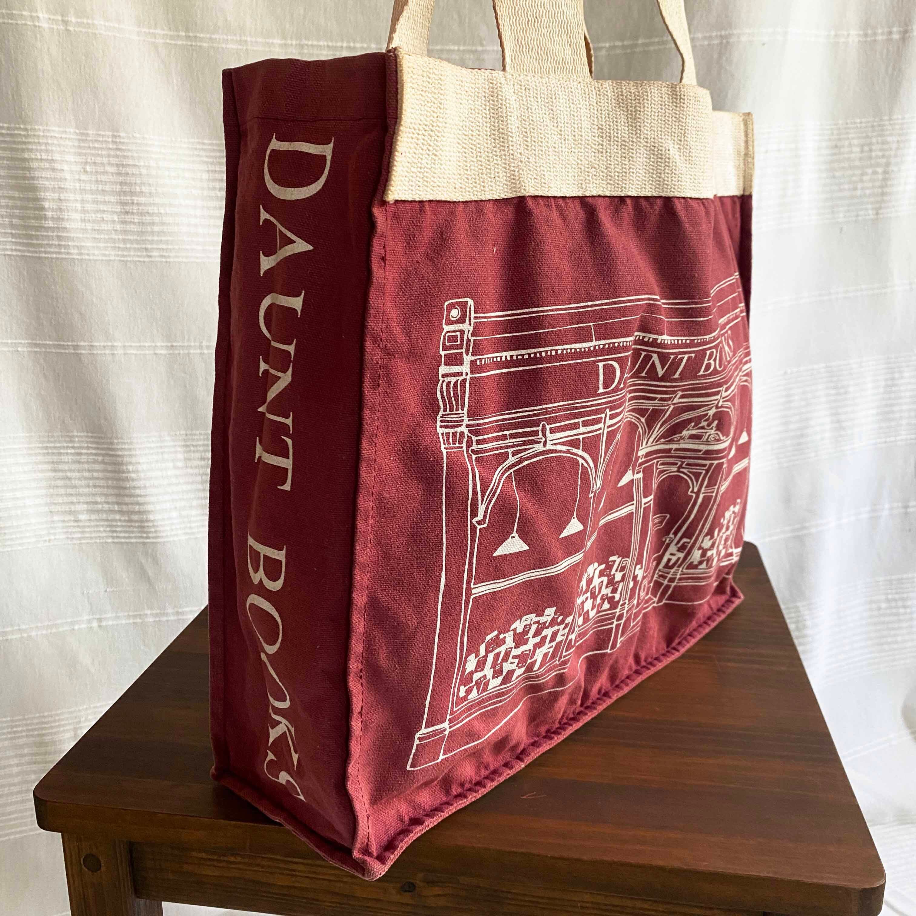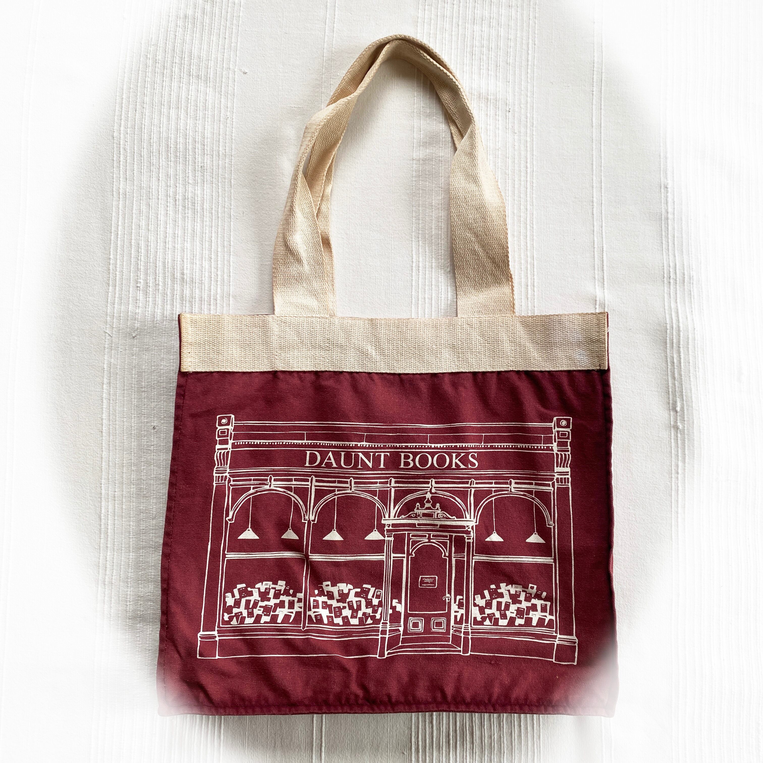 えんじ色の生地に、書店の店頭の線画が白でプリントされています。