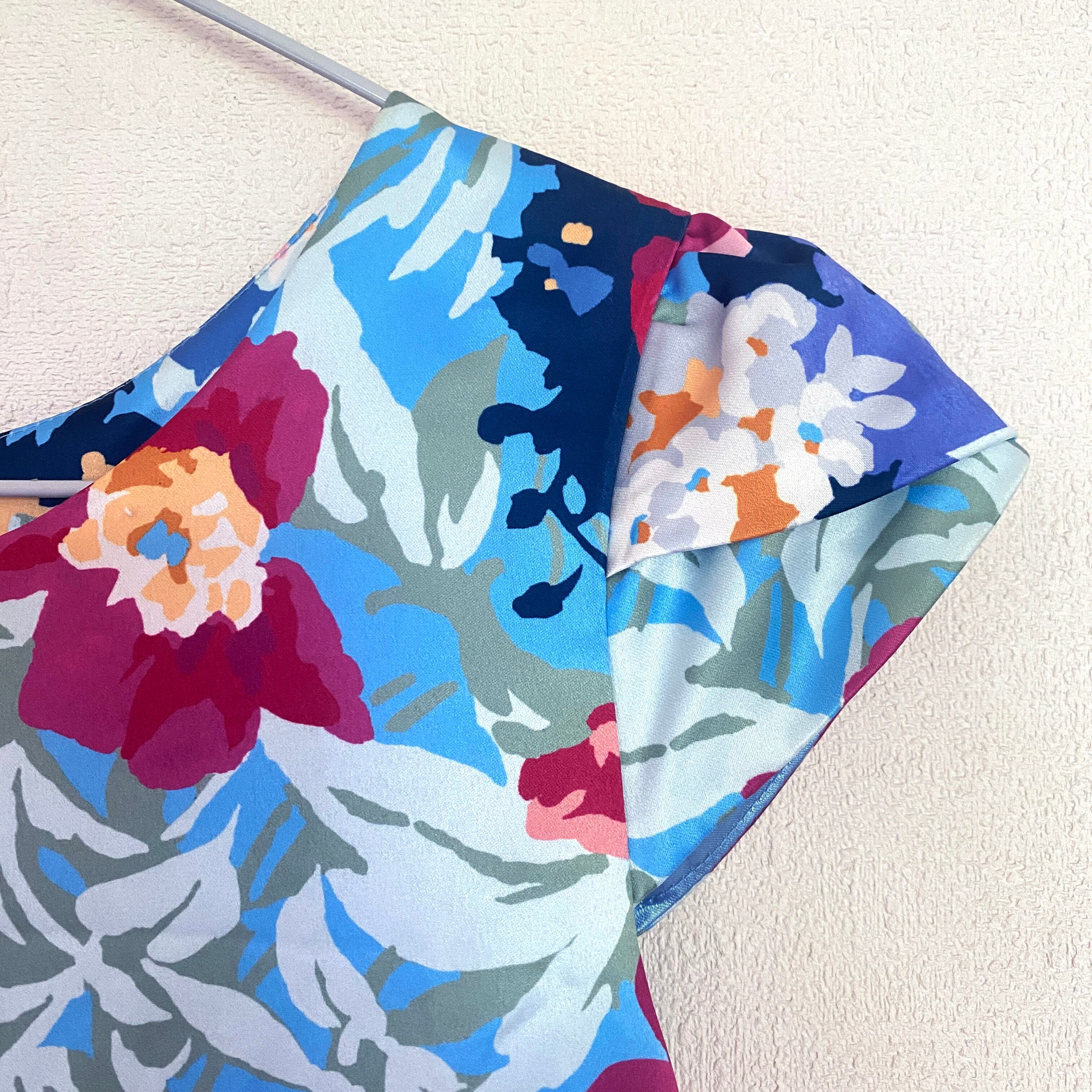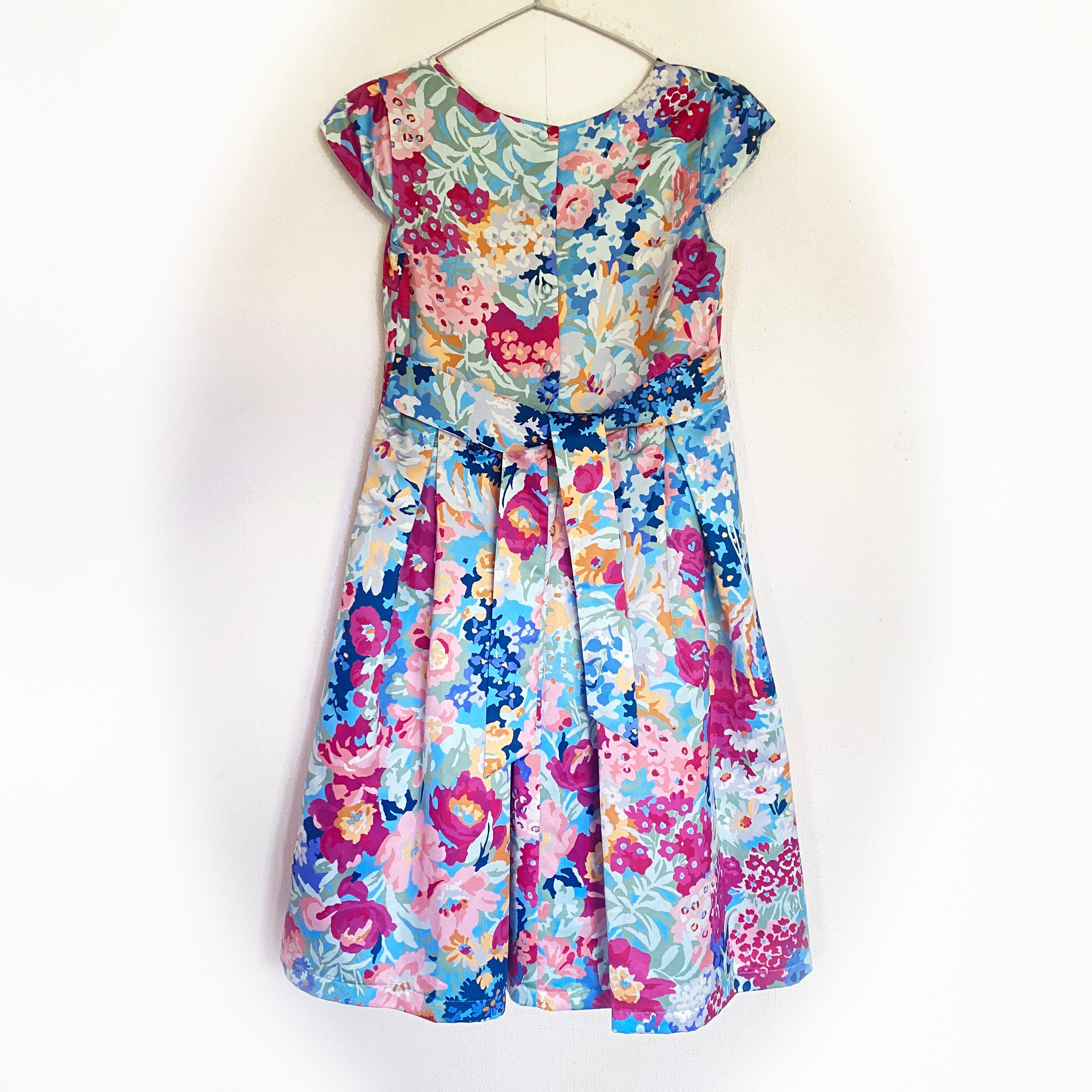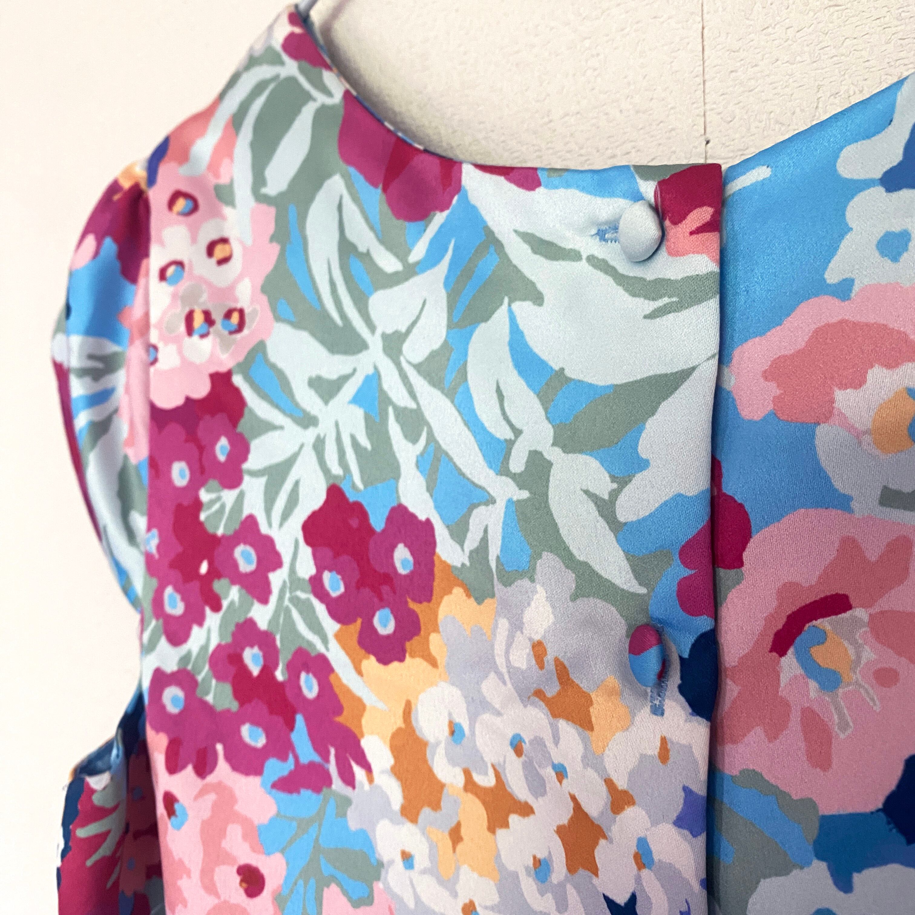水色にカラフルなフラワープリントがあざやかな、主役になれるドレス。