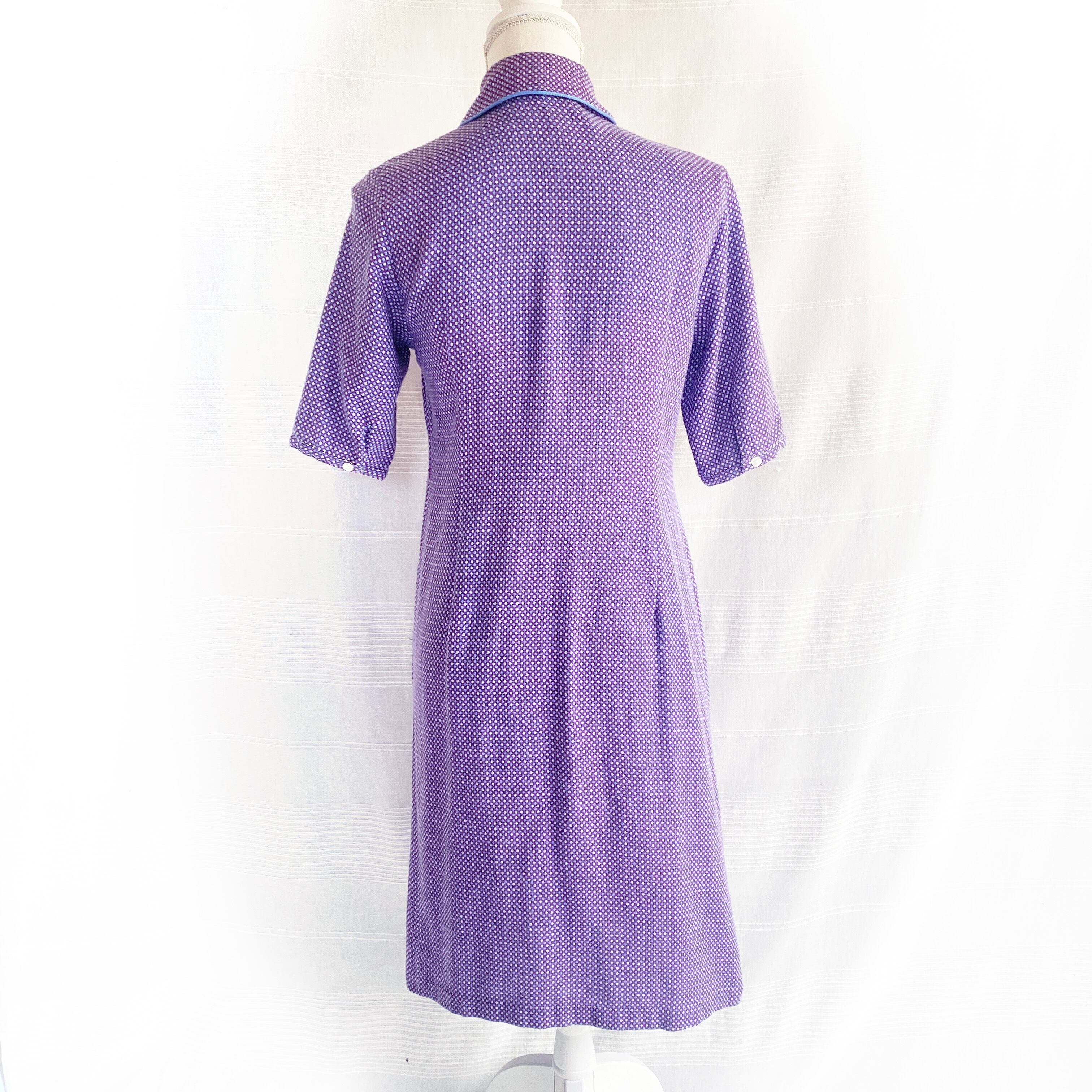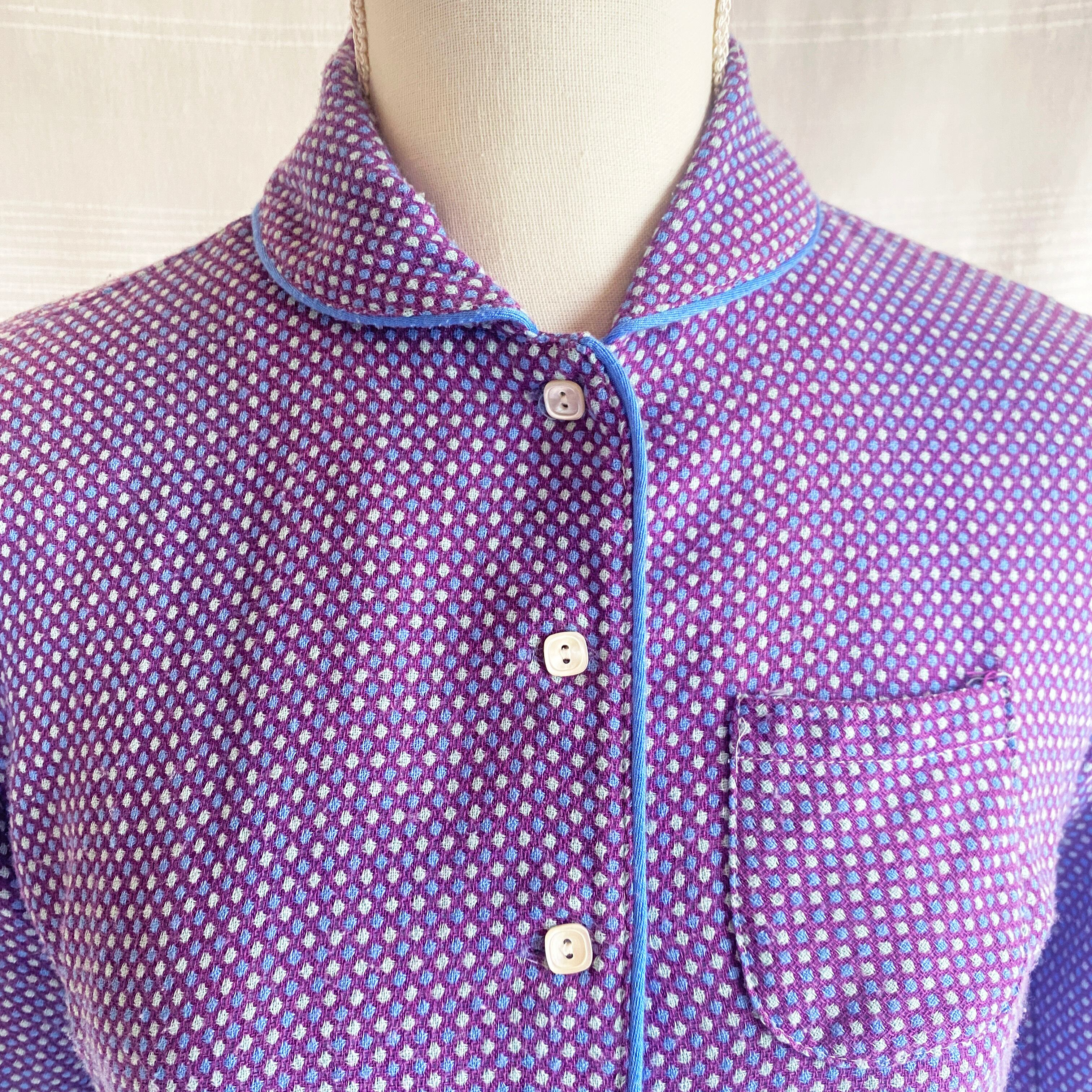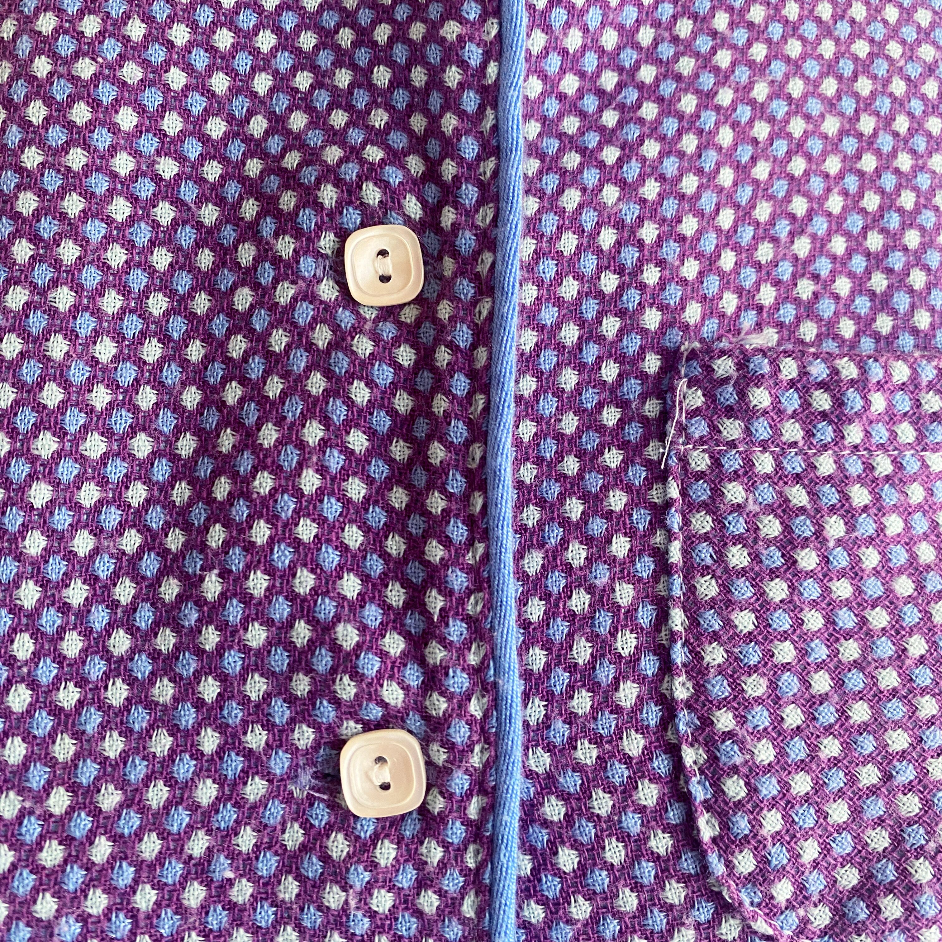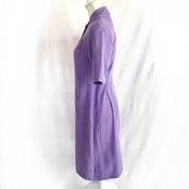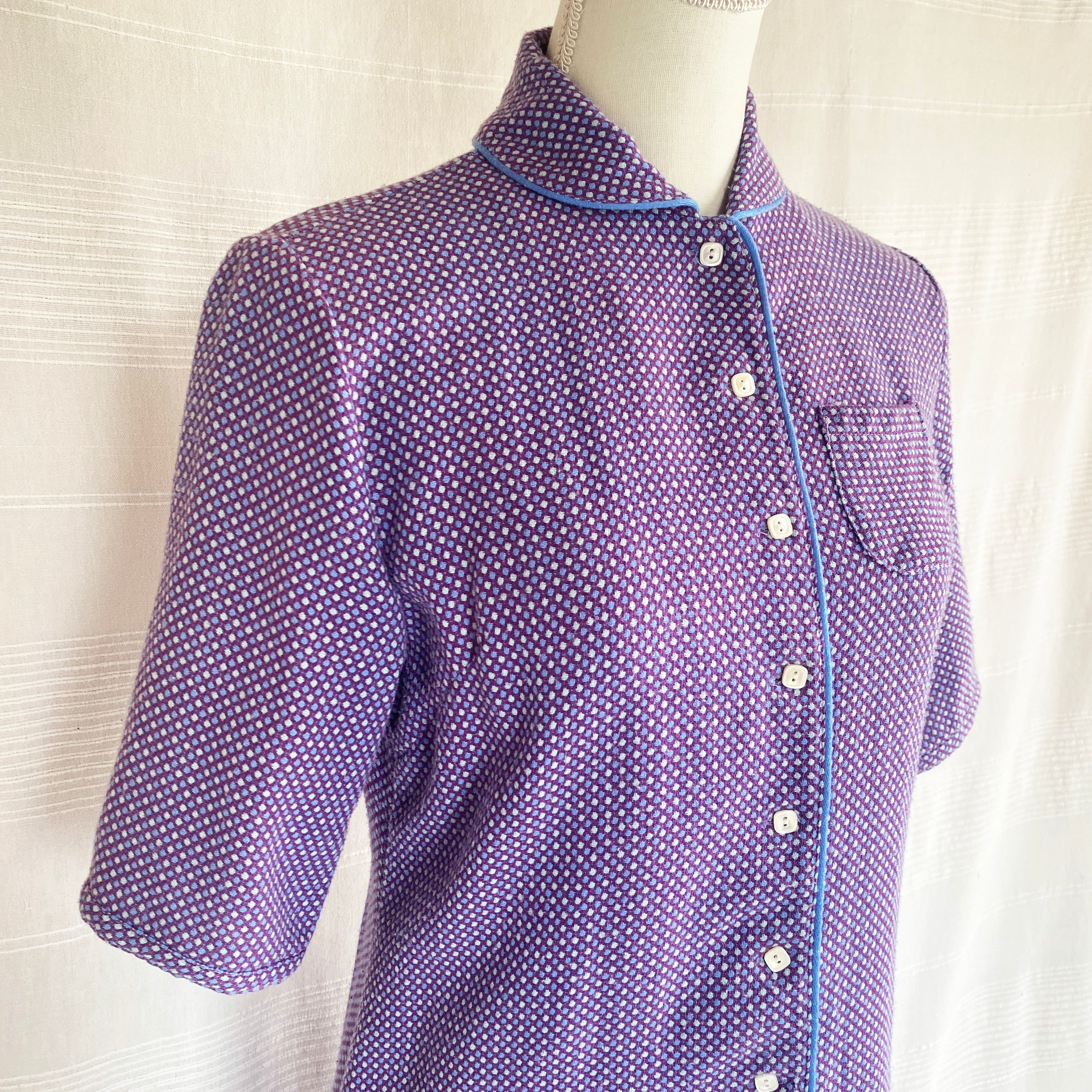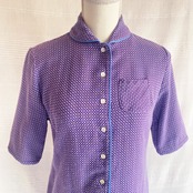 3色のパープル使いの格子のような生地に、パイピングが効いたレトロな雰囲気あふれるシャツワンピースです。