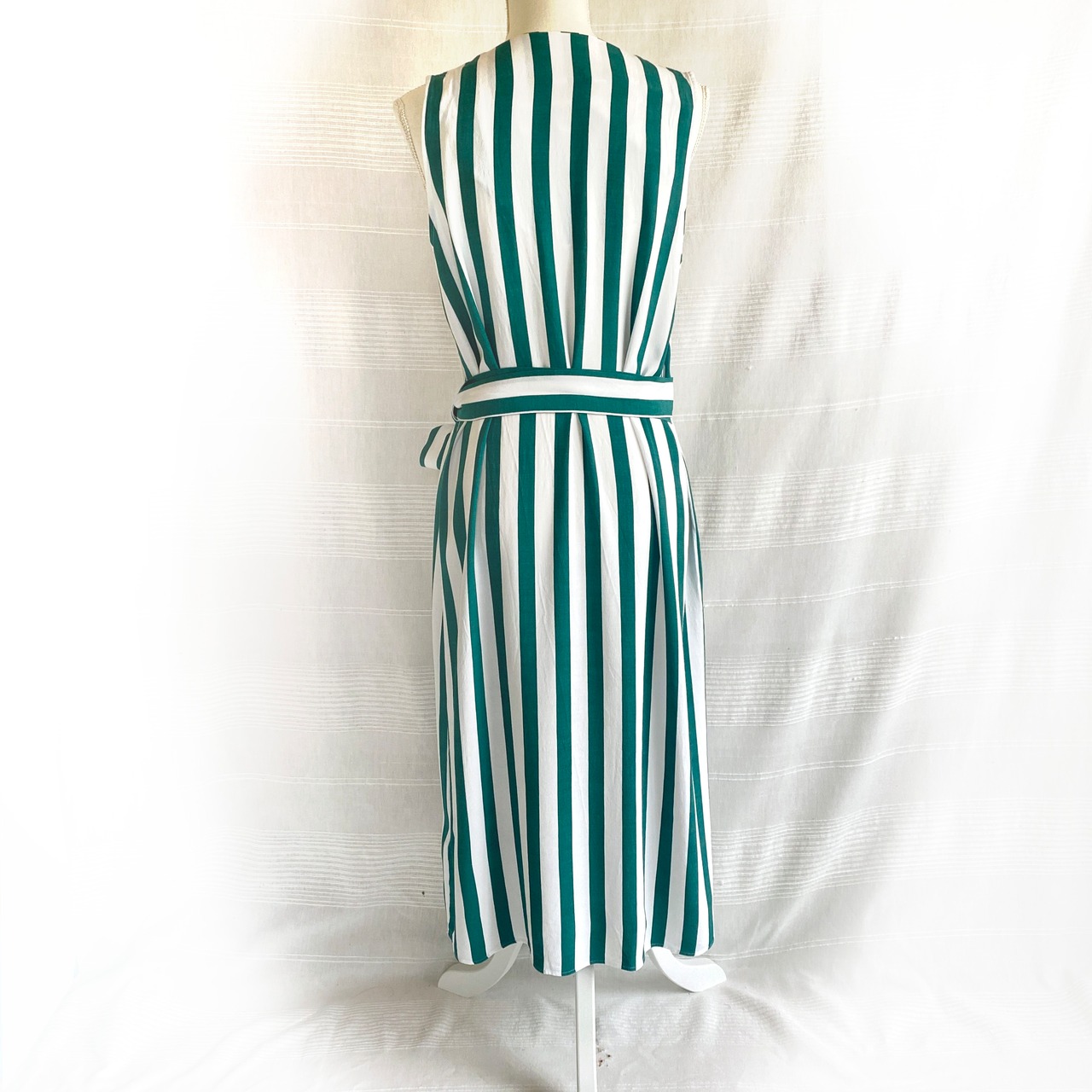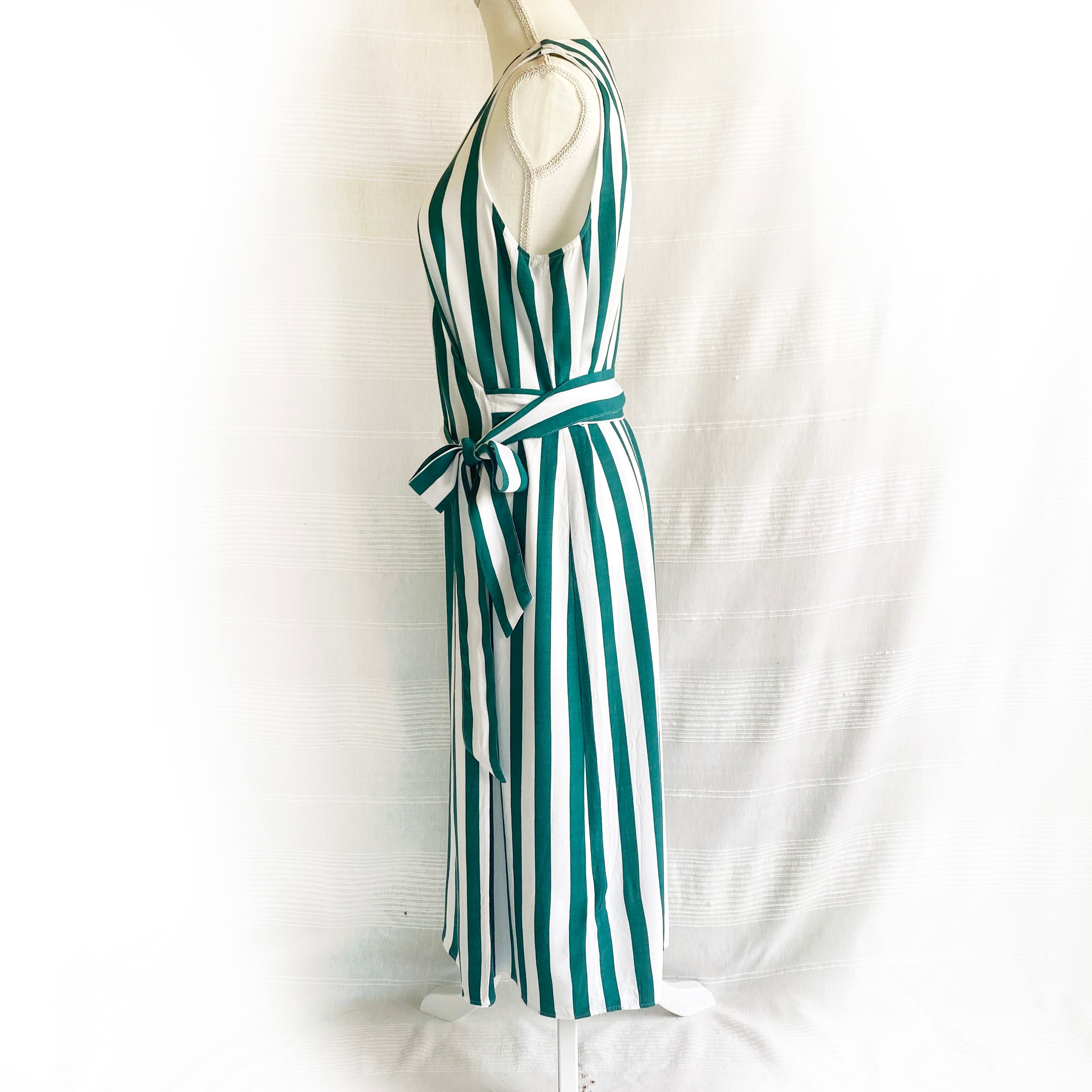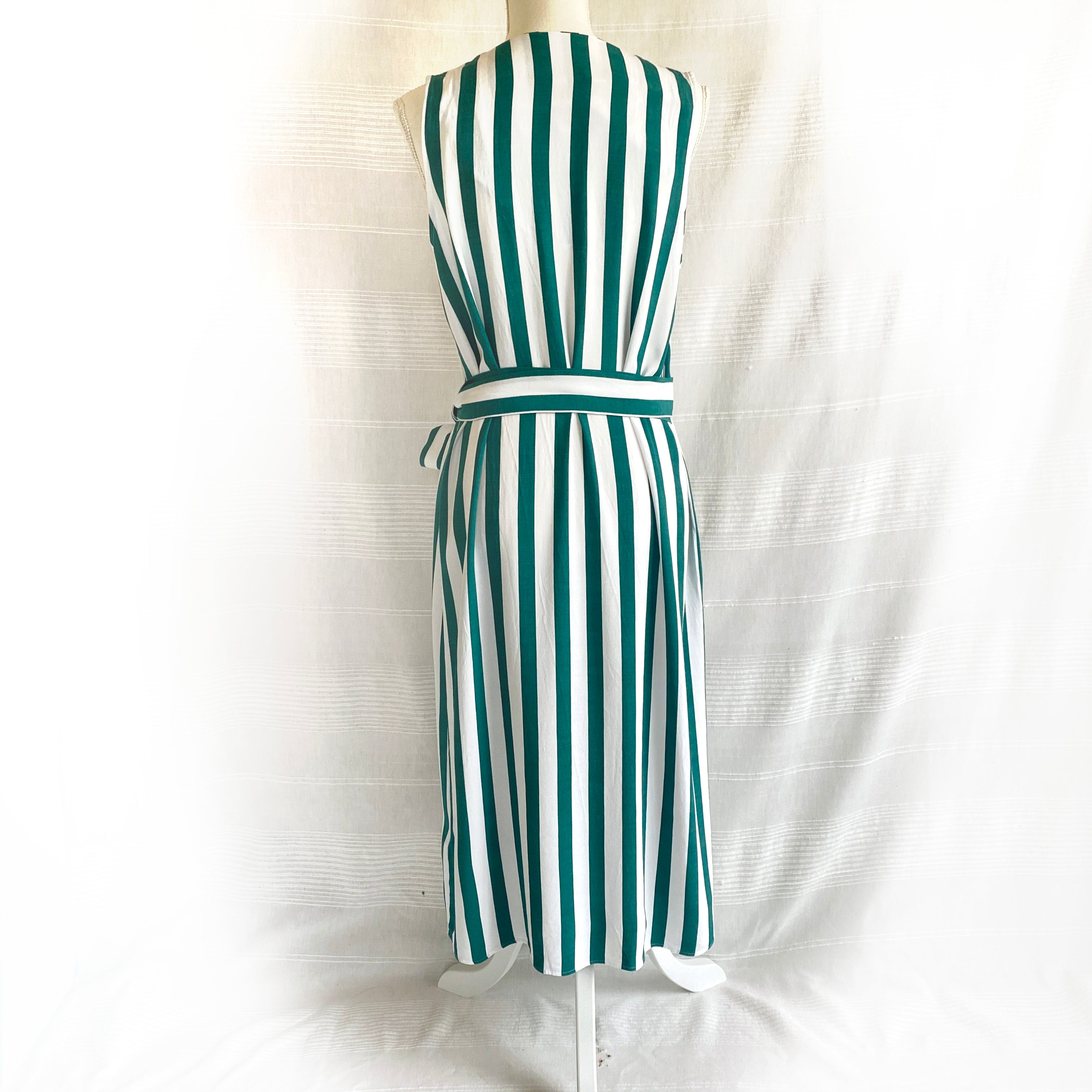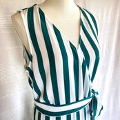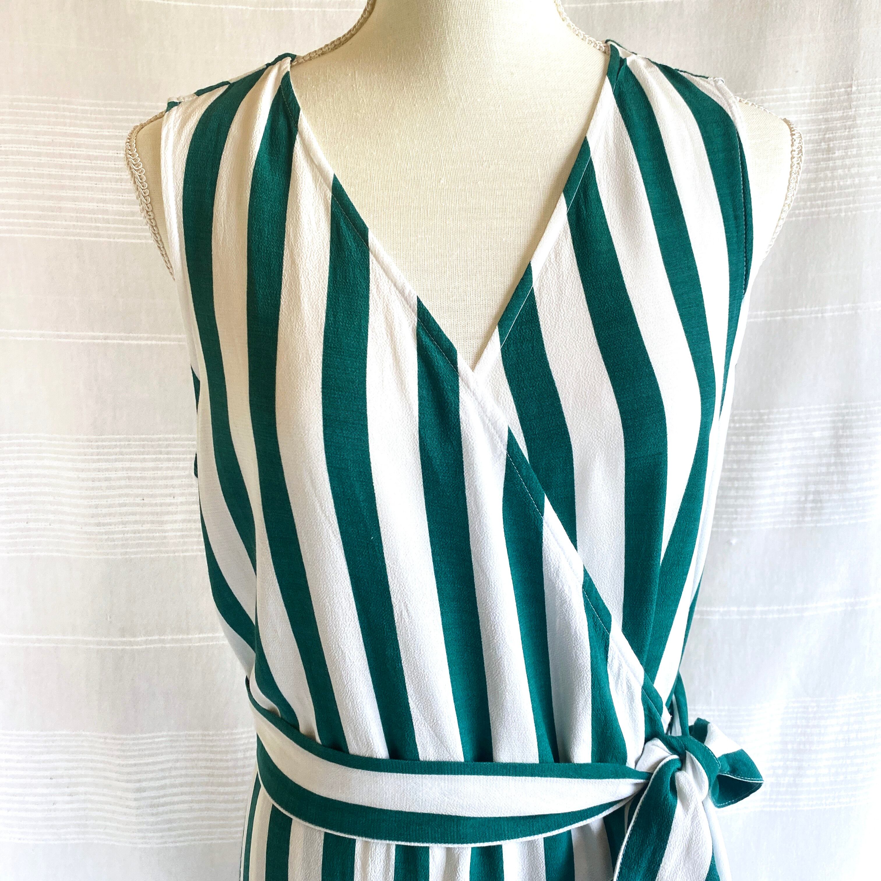 太いグリーンとホワイトの縦ストライプが目をひく、バカンスライクなラップドレス。