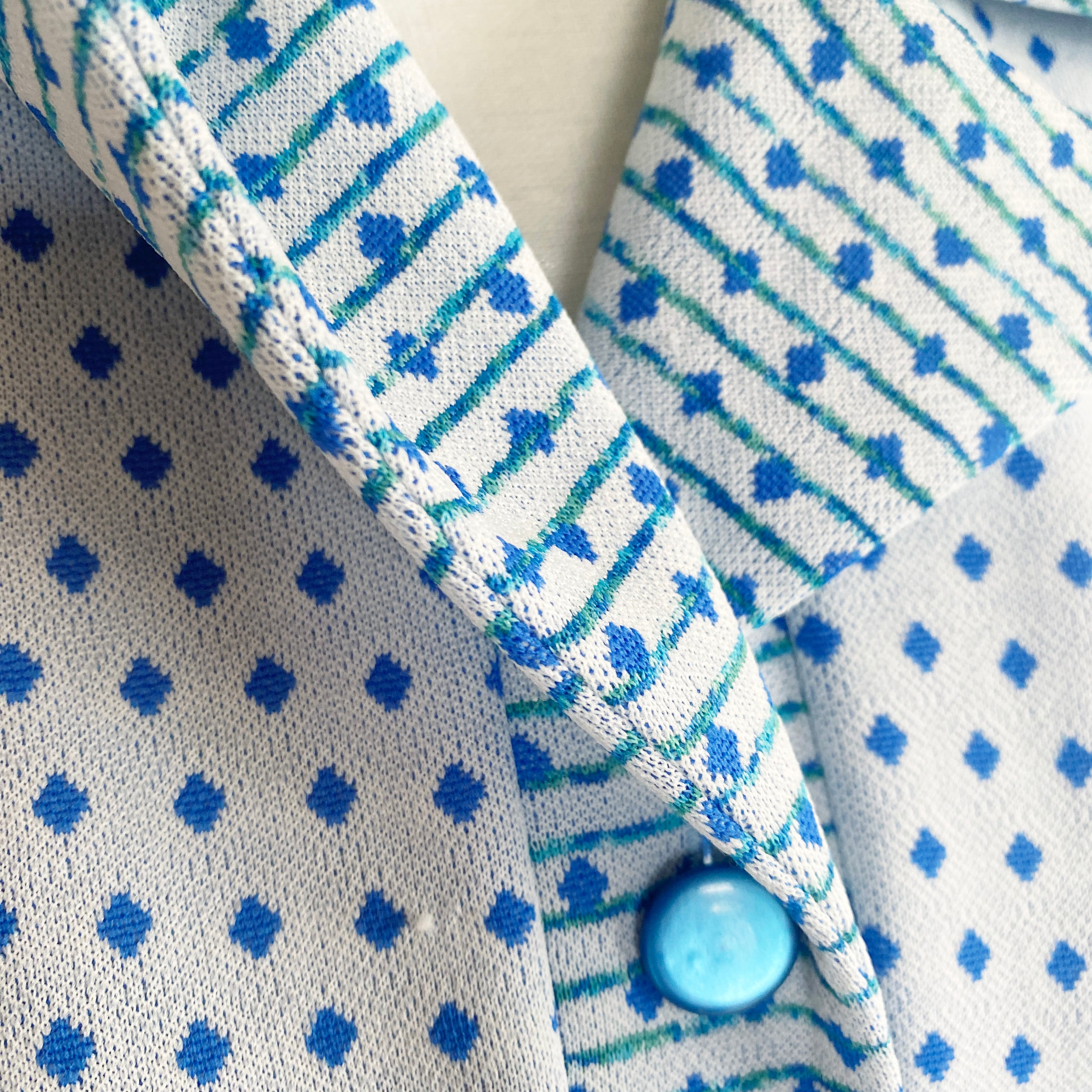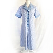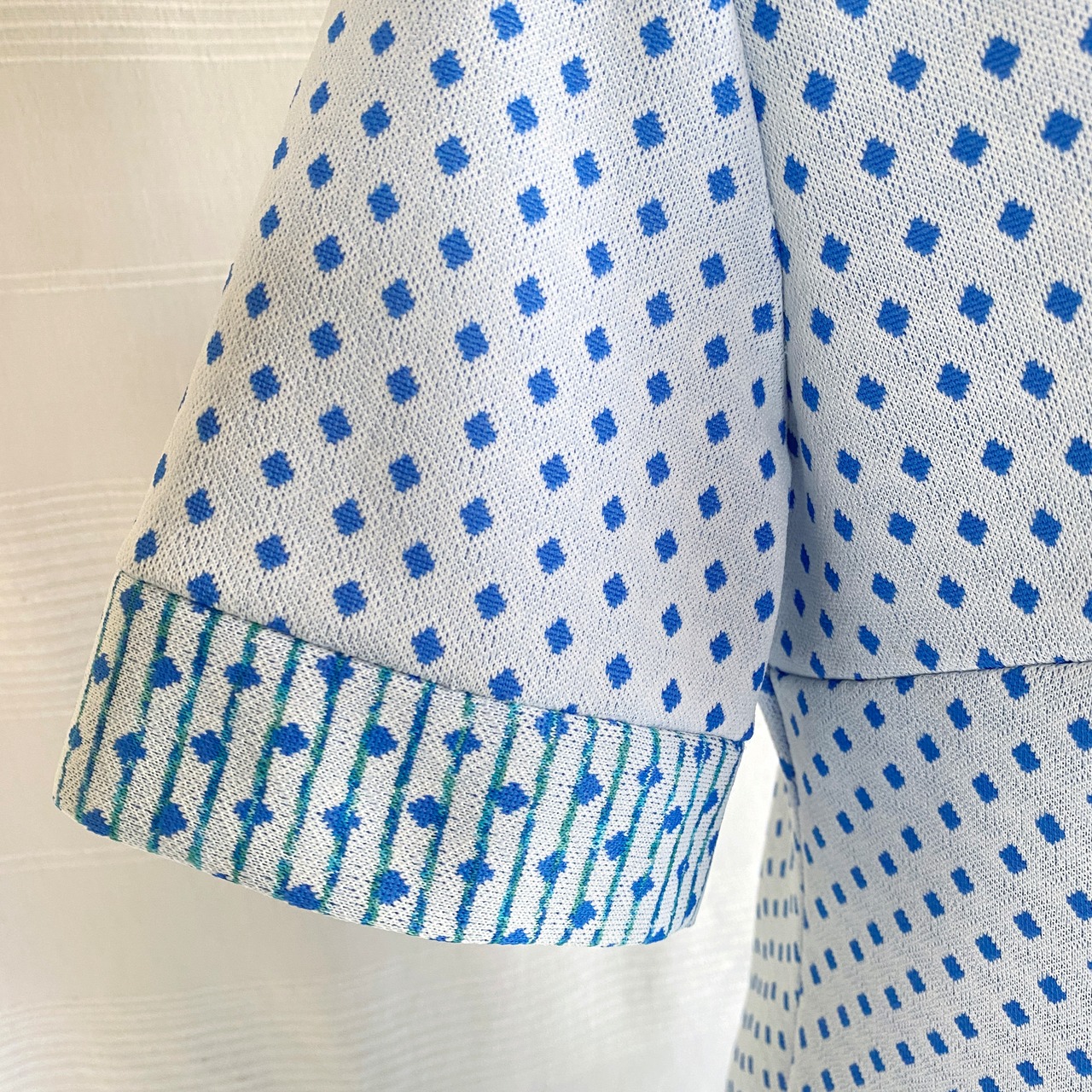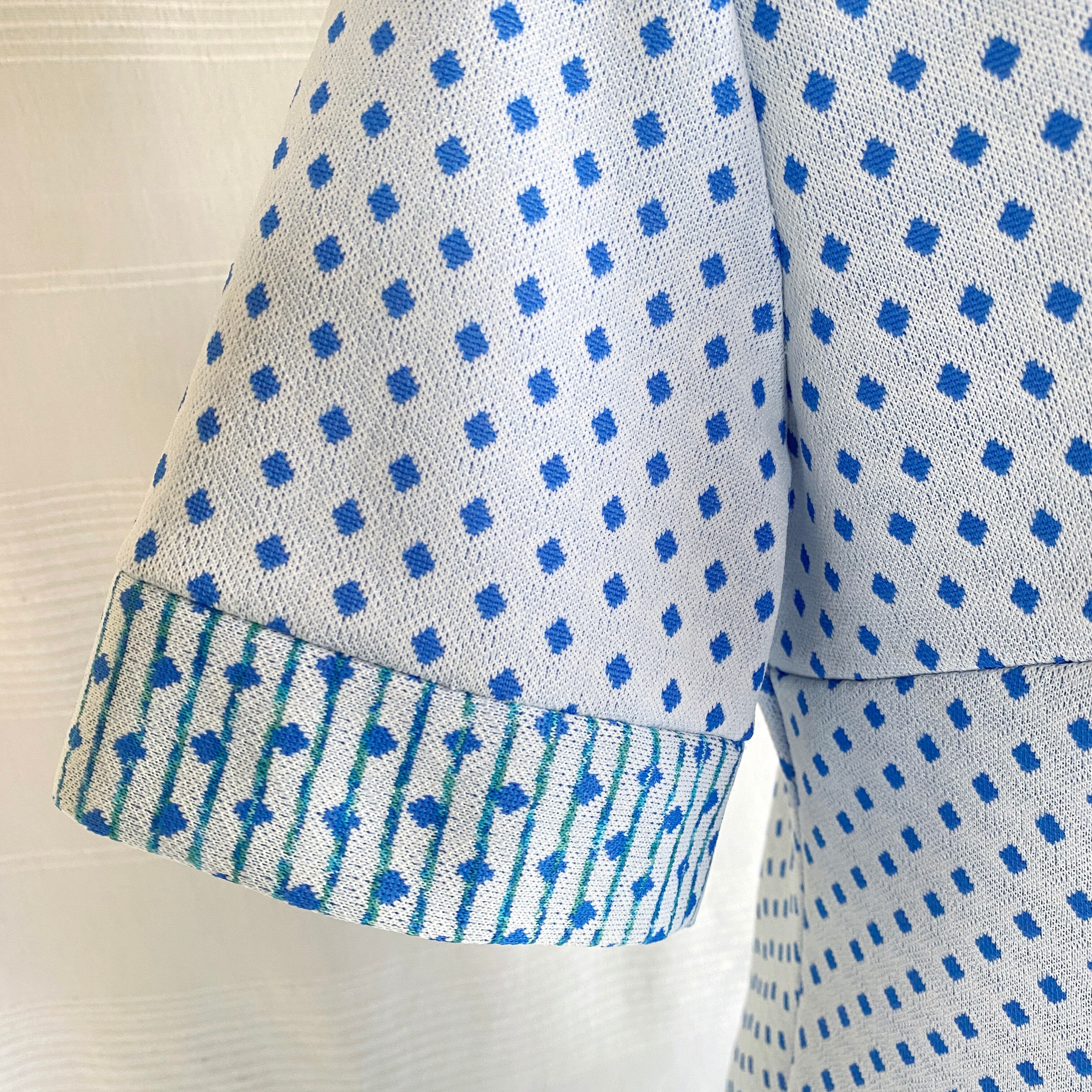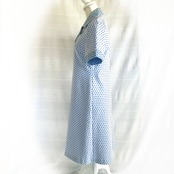 ぽってりとした生地が作る、襟の大きな制服のようなシルエットと、スクエアドットとストライプのコンビネーションがさわやかレトロなワンピース。