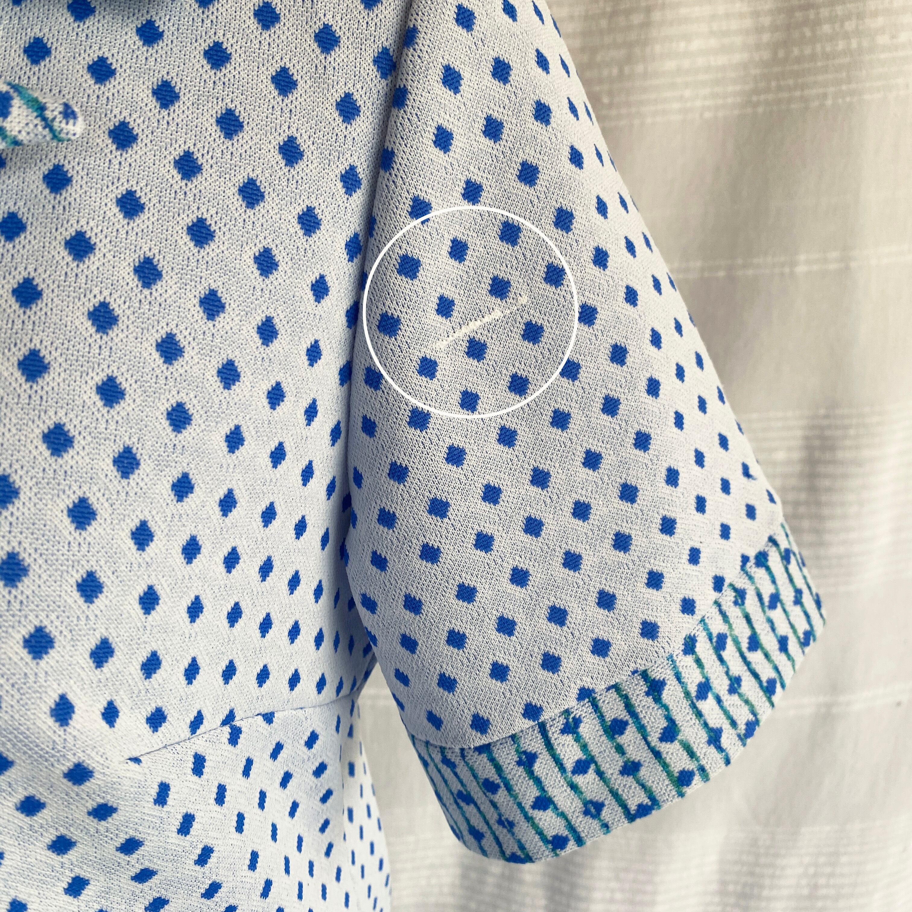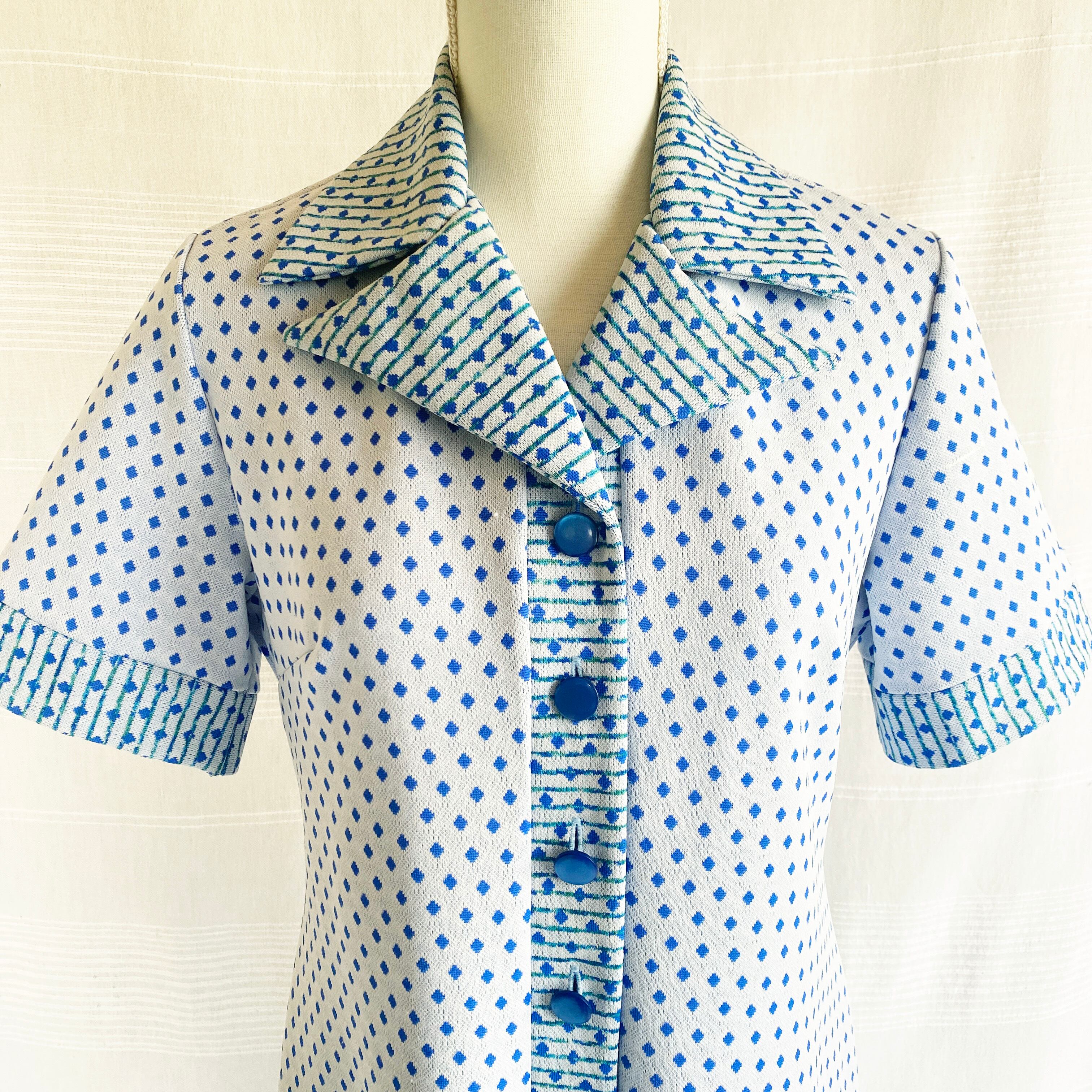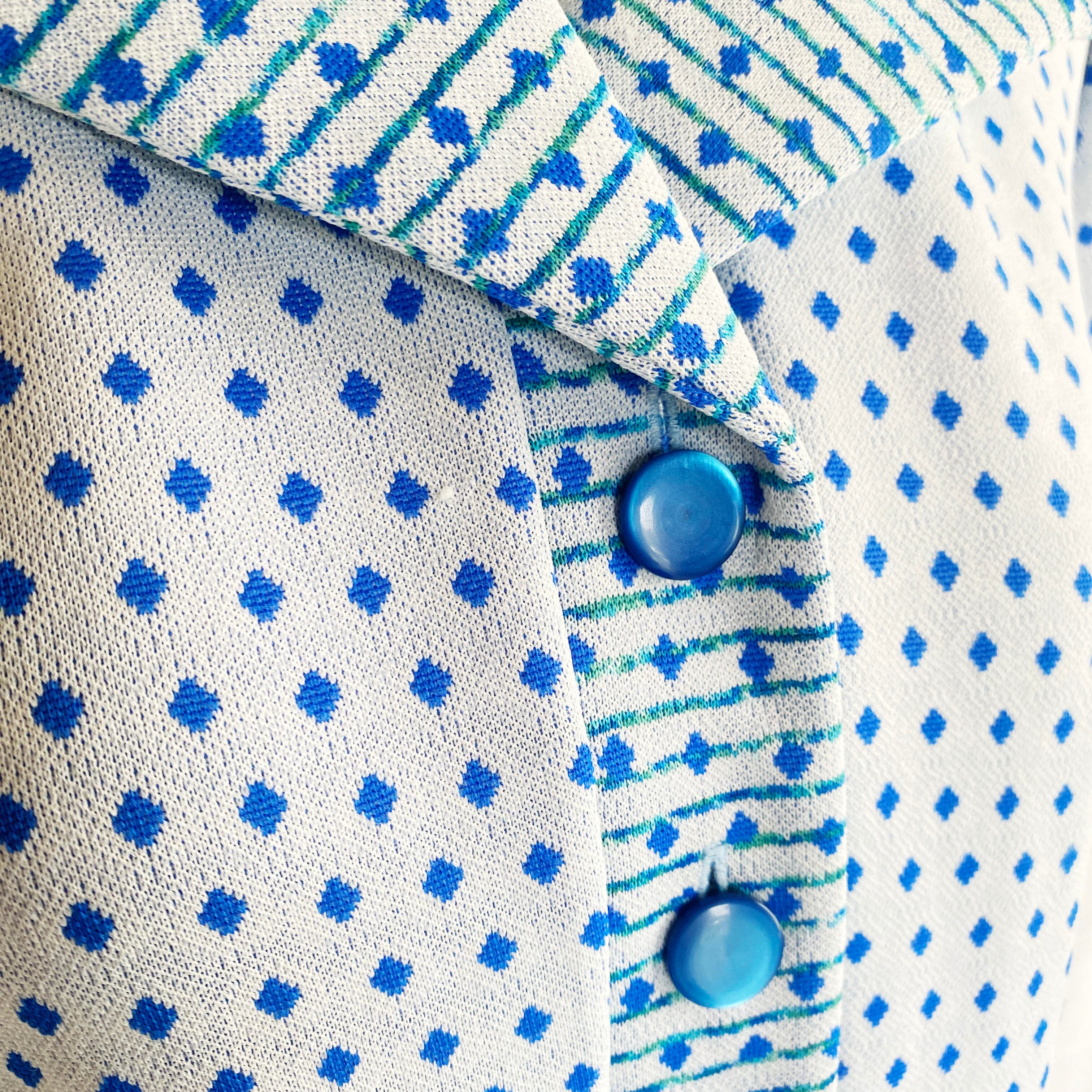 ぽってりとした生地が作る、襟の大きな制服のようなシルエットと、スクエアドットとストライプのコンビネーションがさわやかレトロなワンピース。