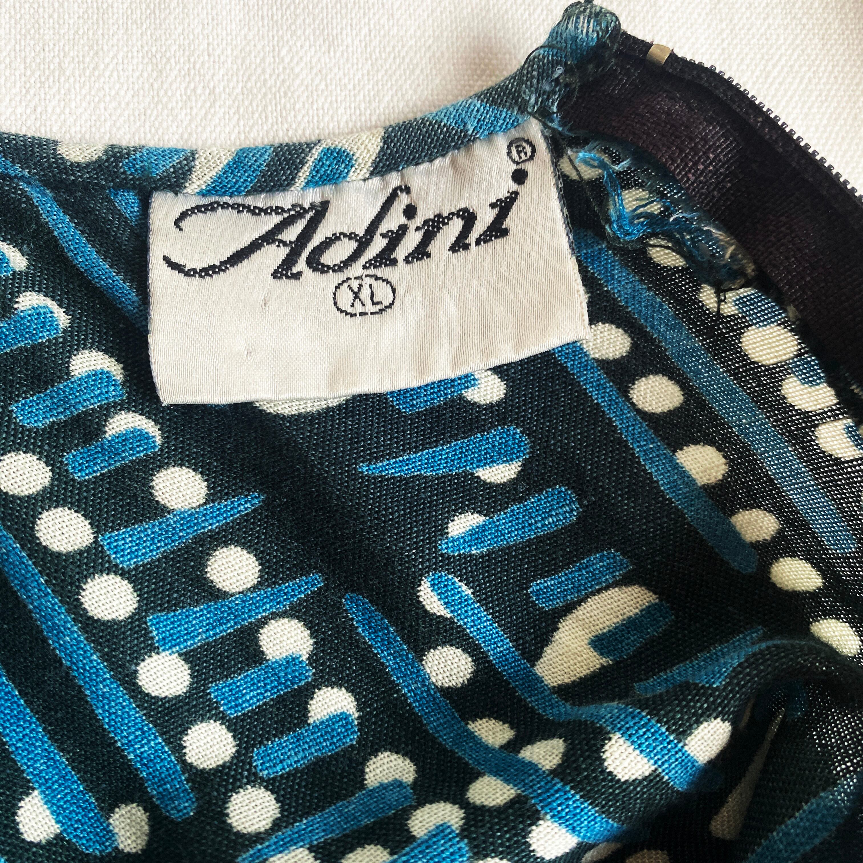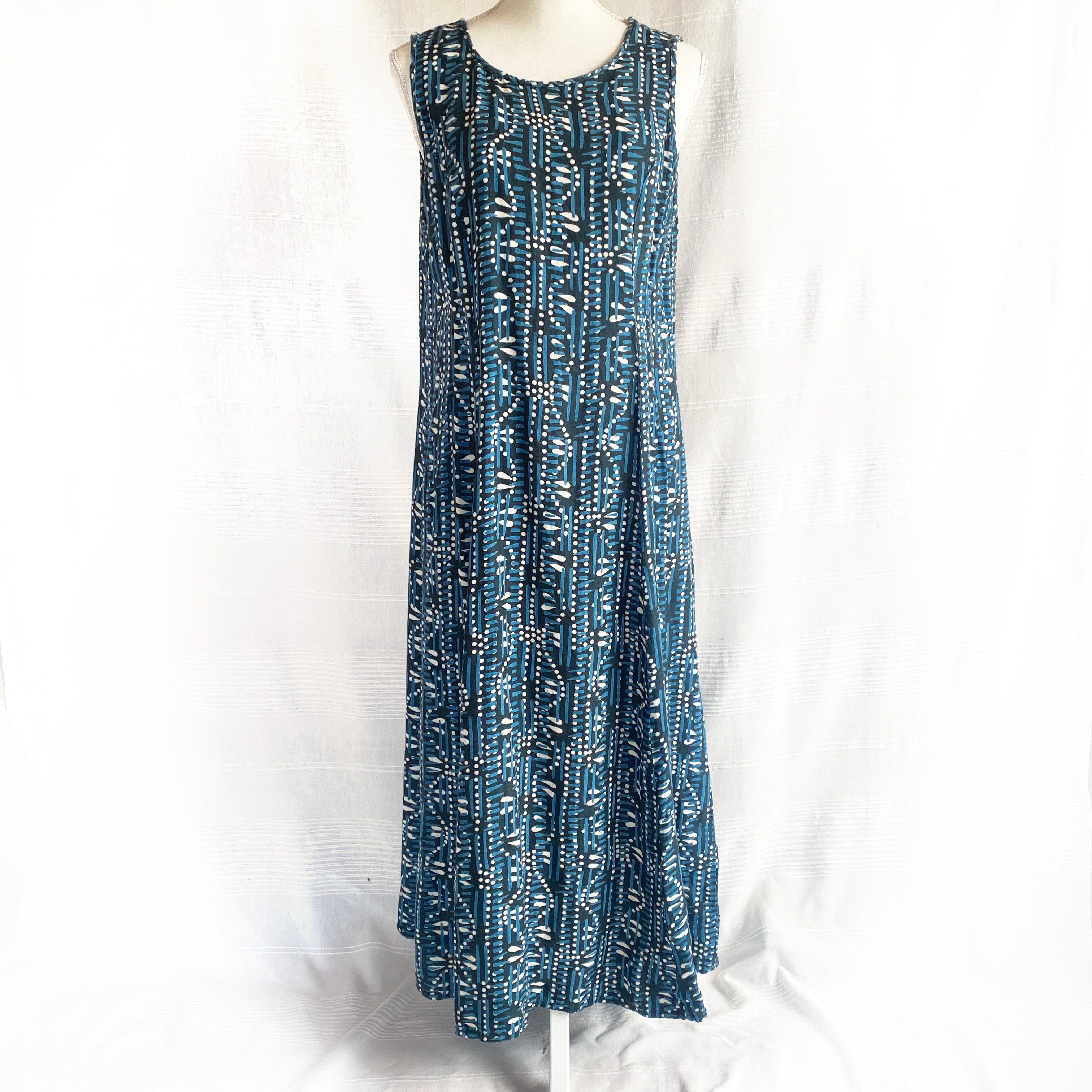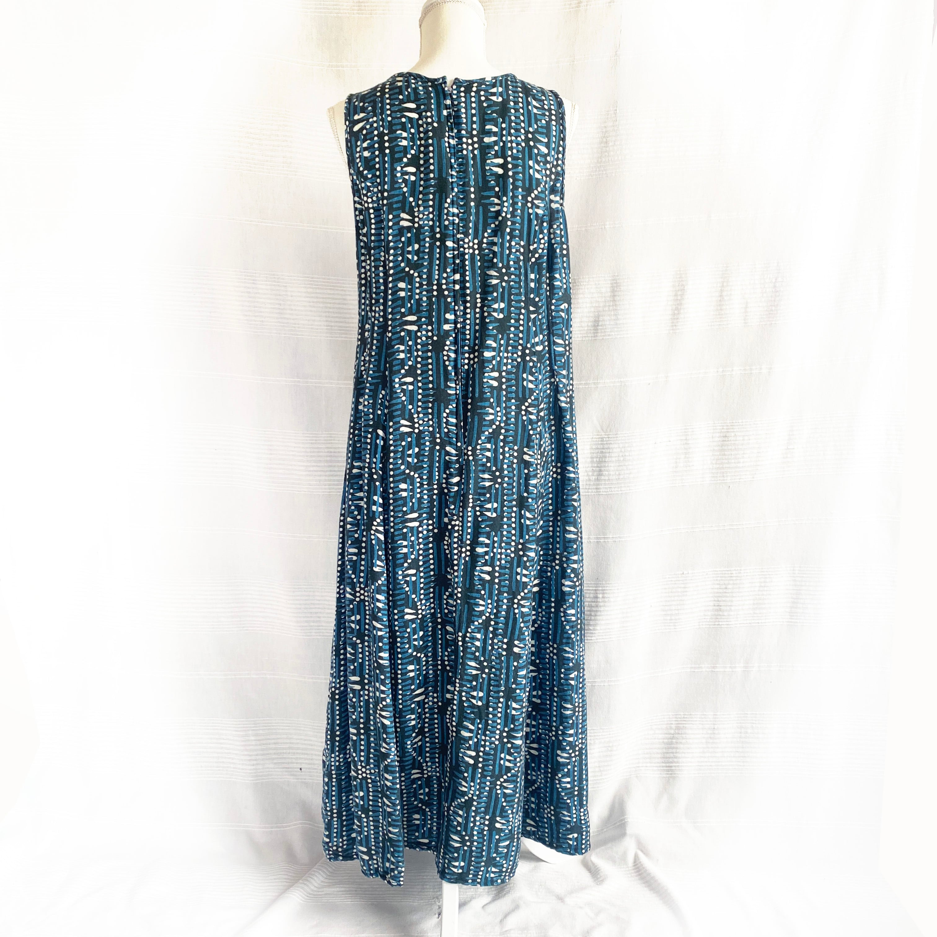 濃いグリーンにブルーと白の柄が染められたノースリーブワンピース。