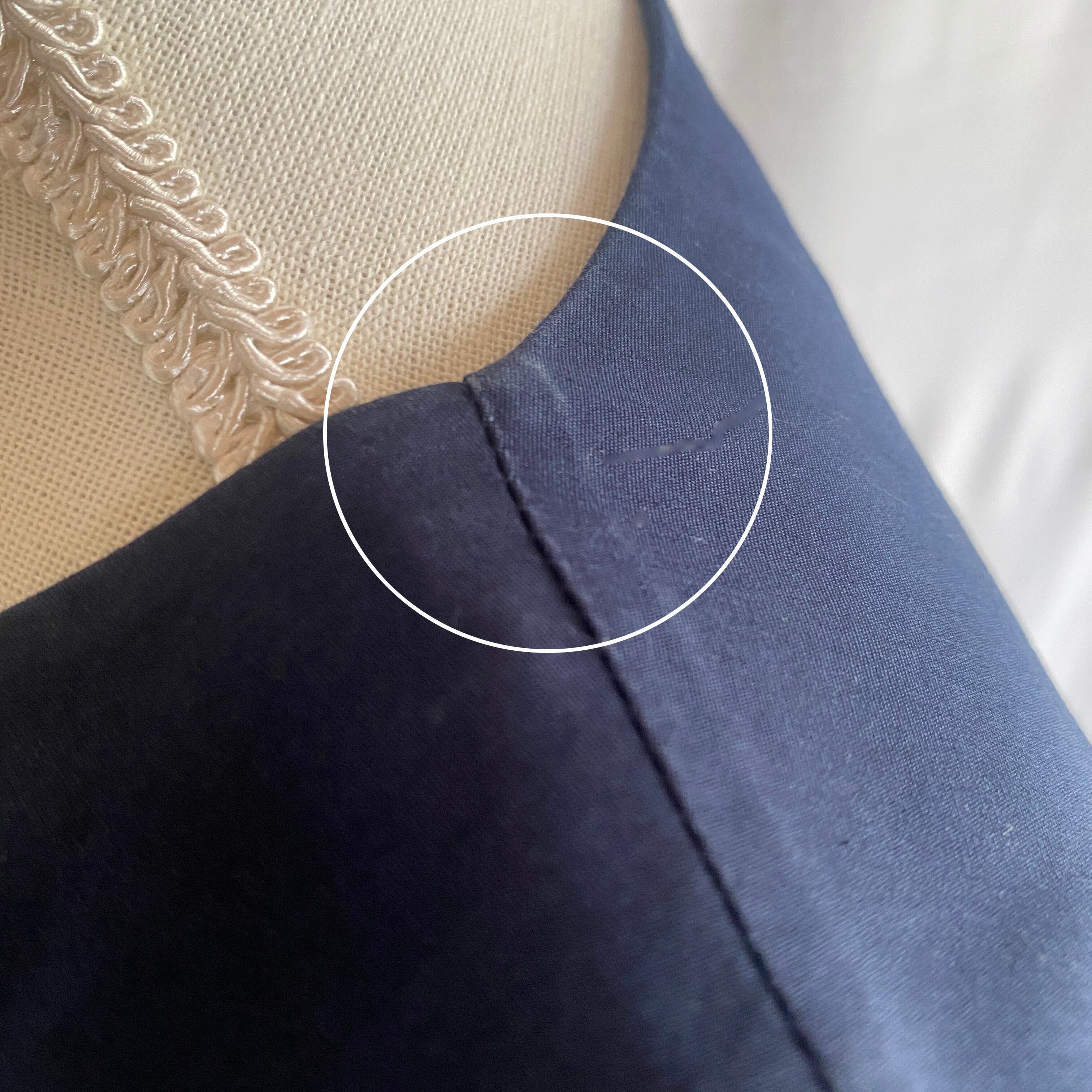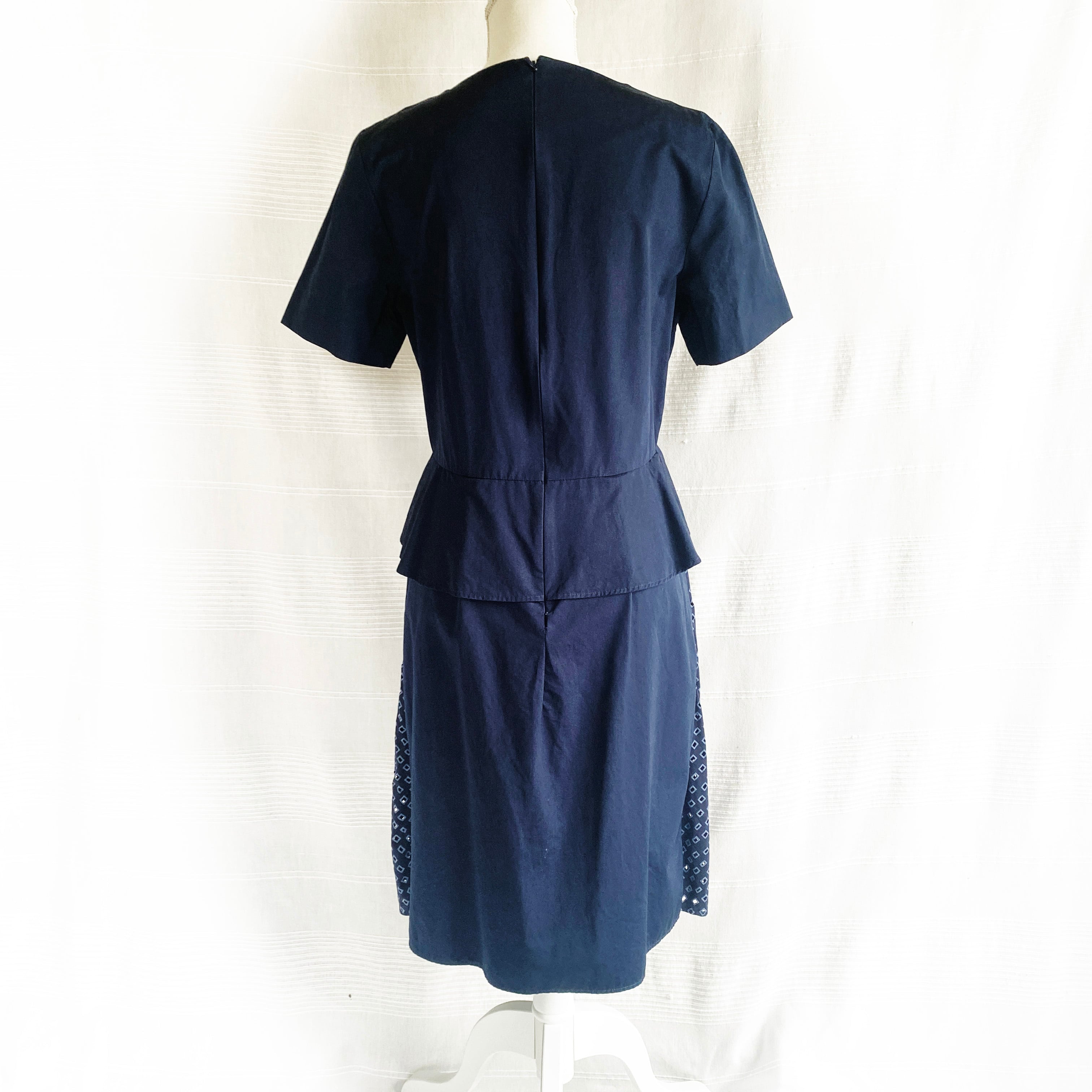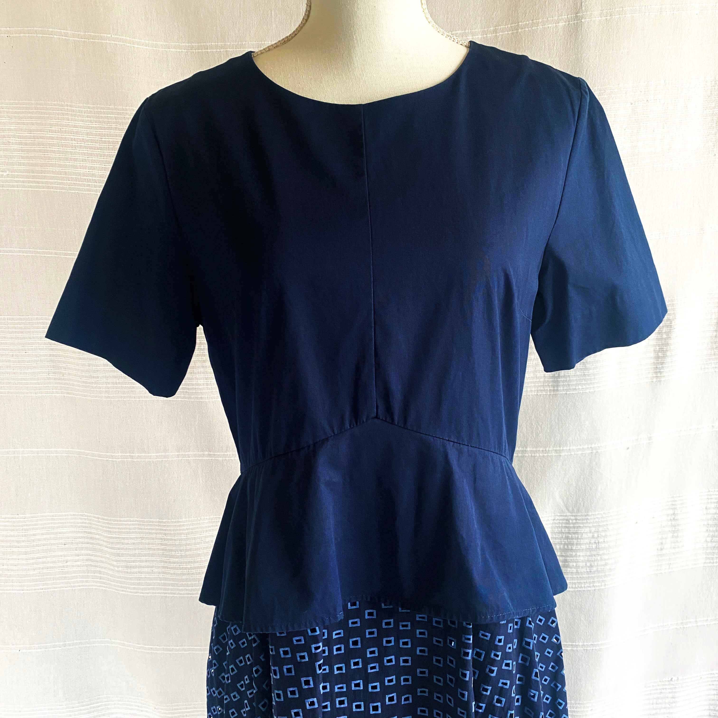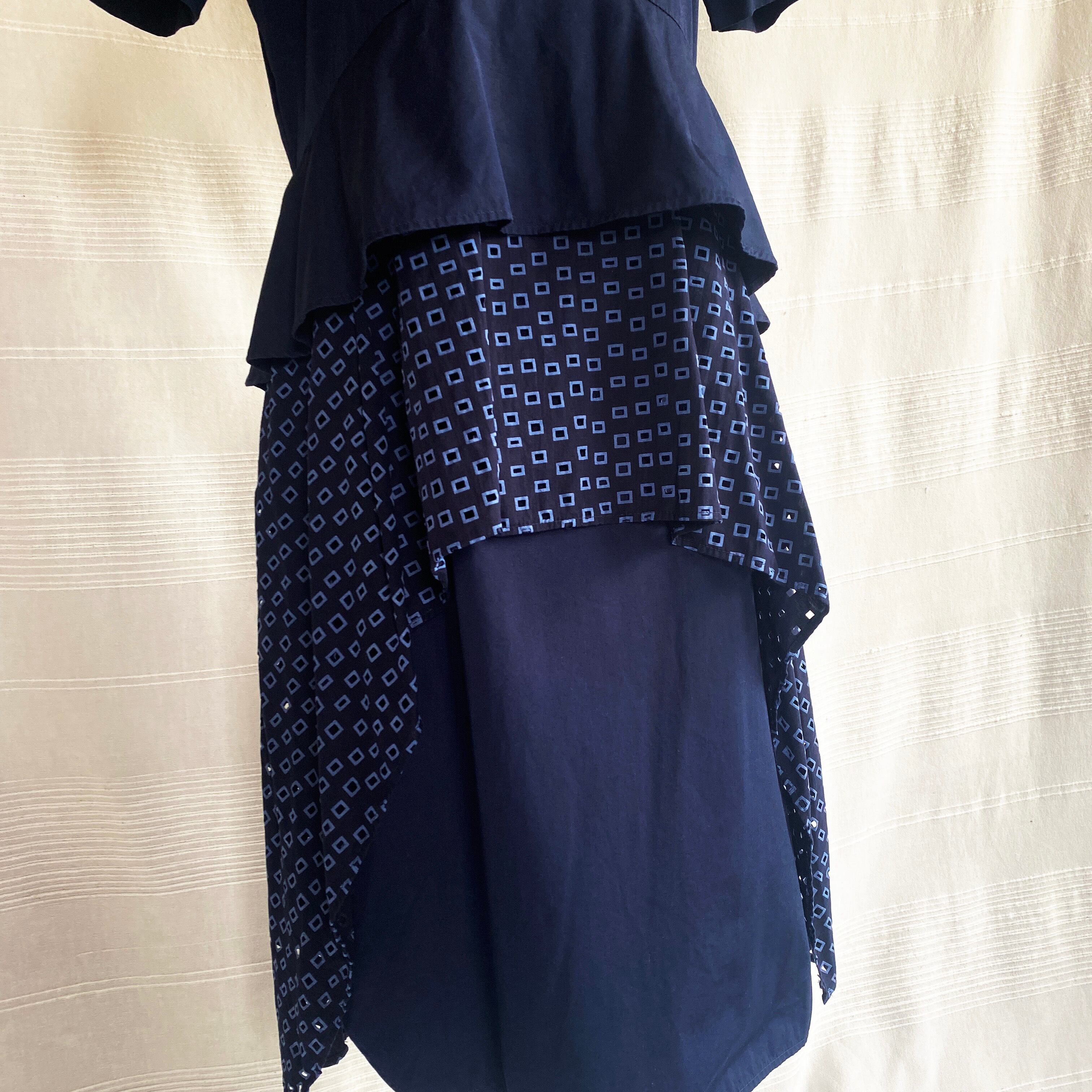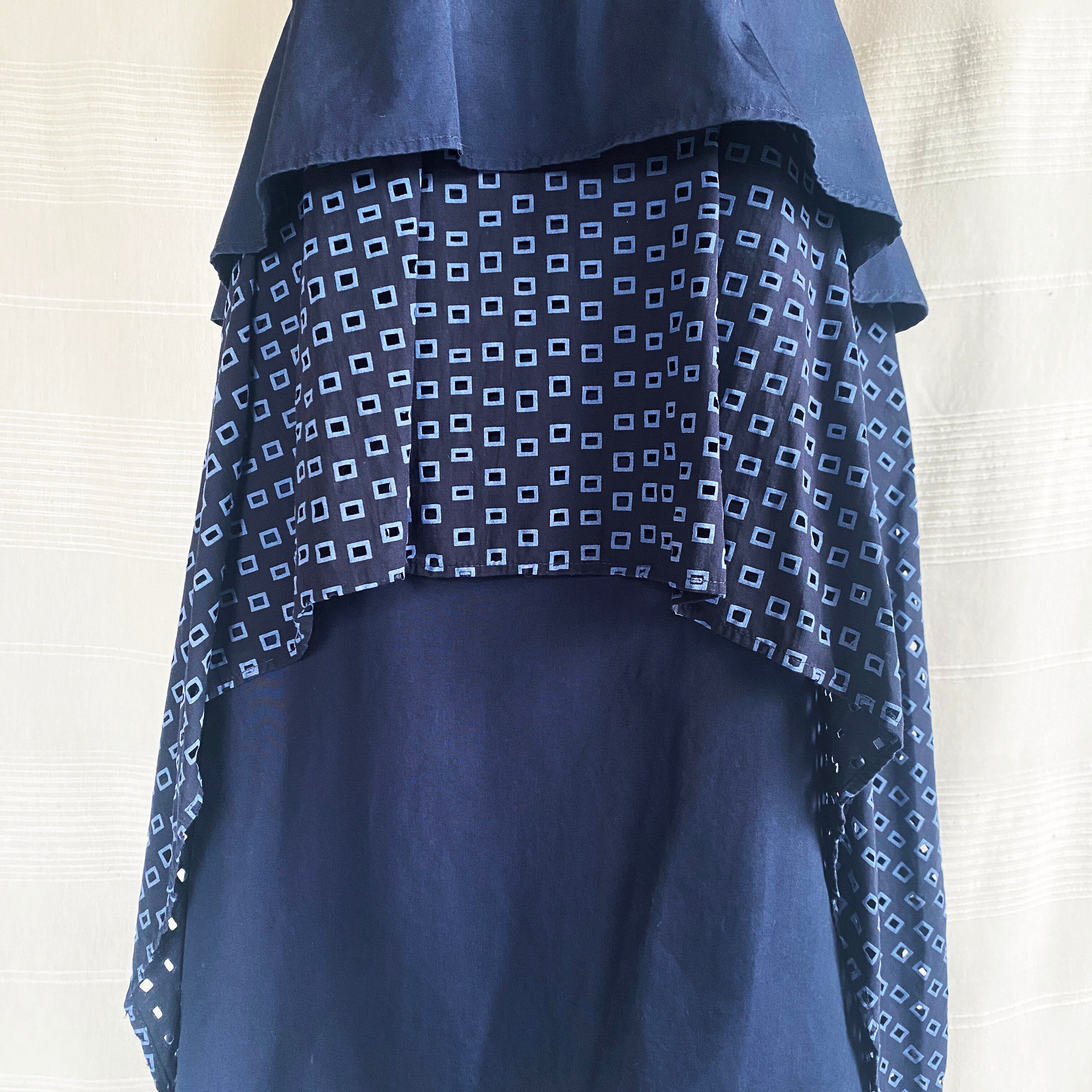 ウエスト切り替えのフレアーなレイヤードと、スクエアに抜かれた生地が、ネイビーのシックなシルエットにアクセントを添えるワンピース。