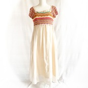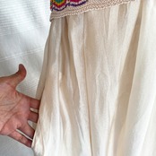 パールカラーのシャイニーなフレアスカートに、胸下までの短いニットがドッキングした、ボヘミアンな雰囲気たっぷりのワンピース。