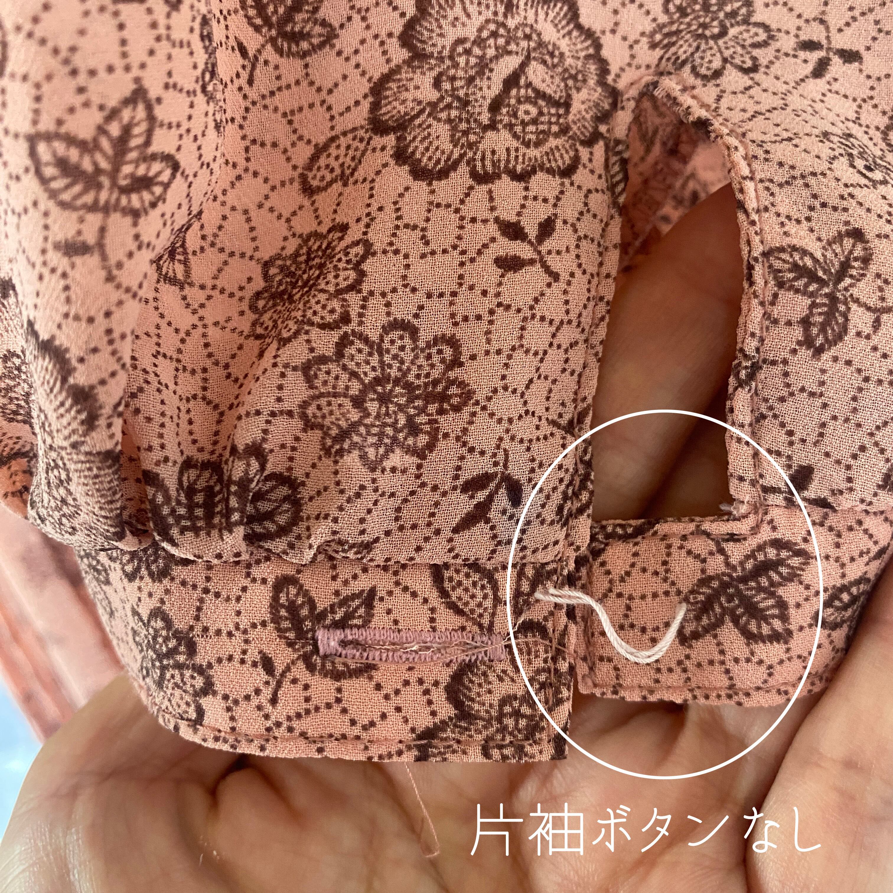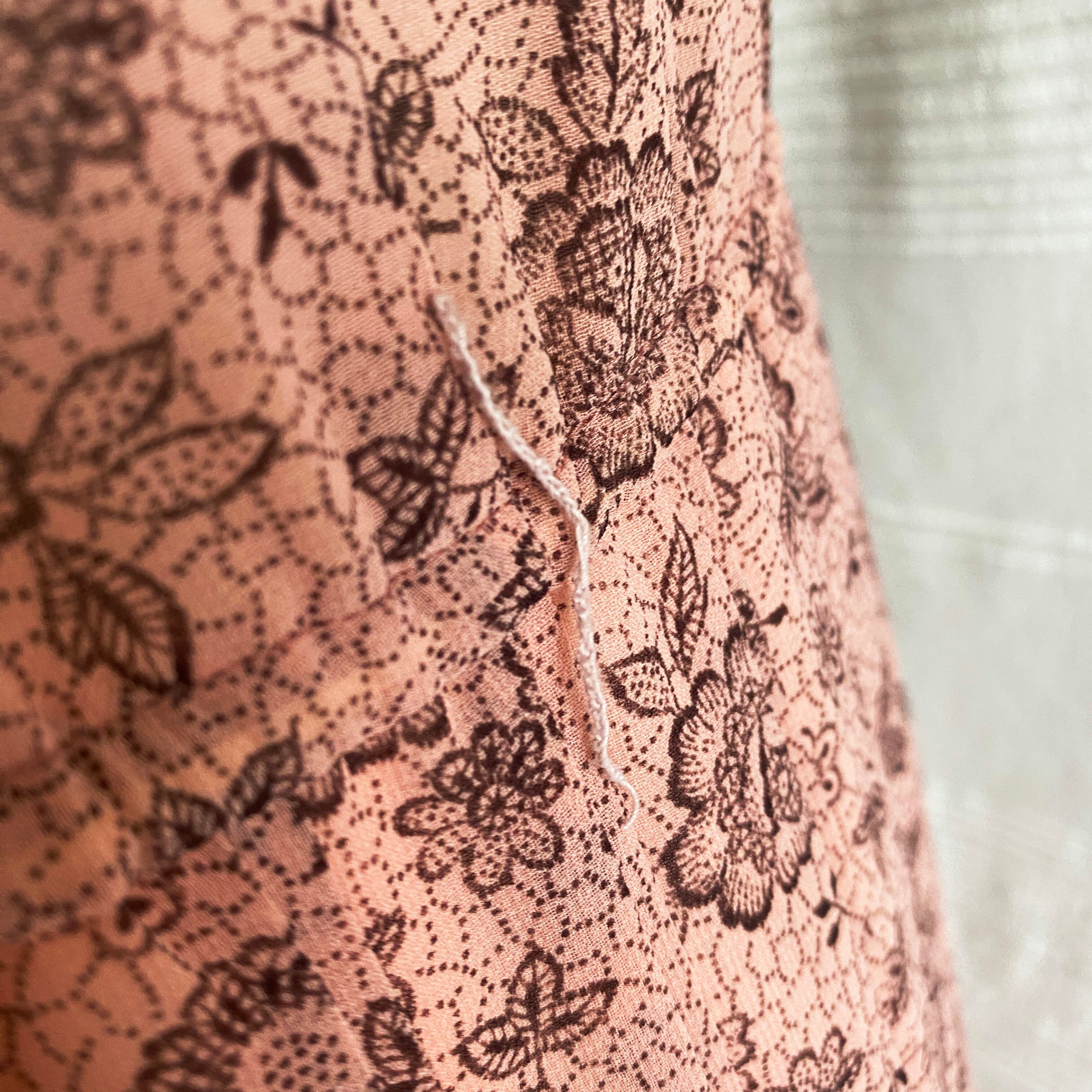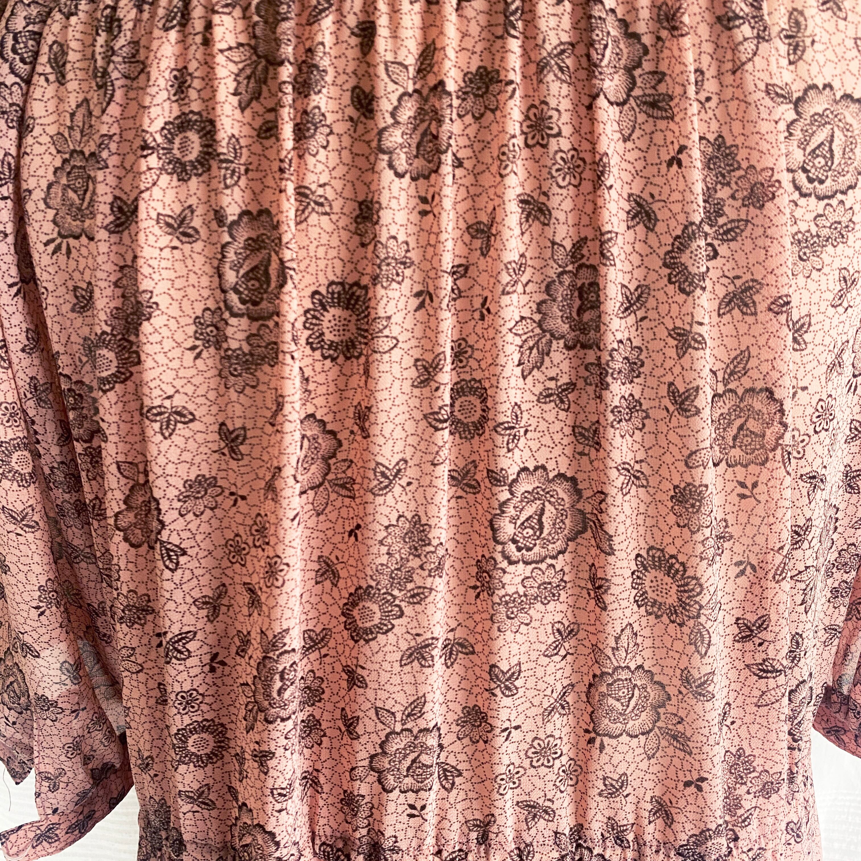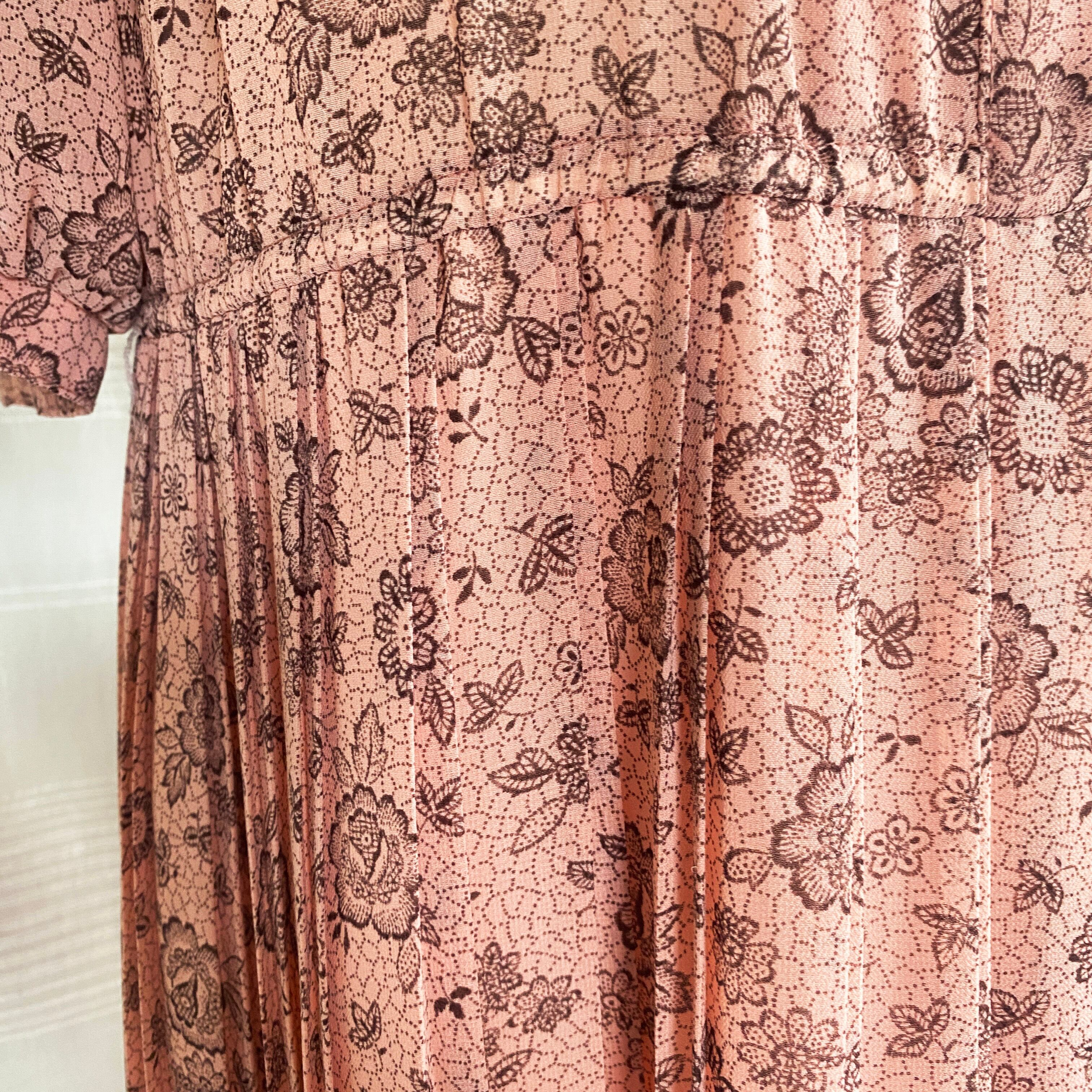 やわらかなピンク地にブラウンでプリントされた、レース模様のような花柄がラブリーなヴィンテージワンピース。