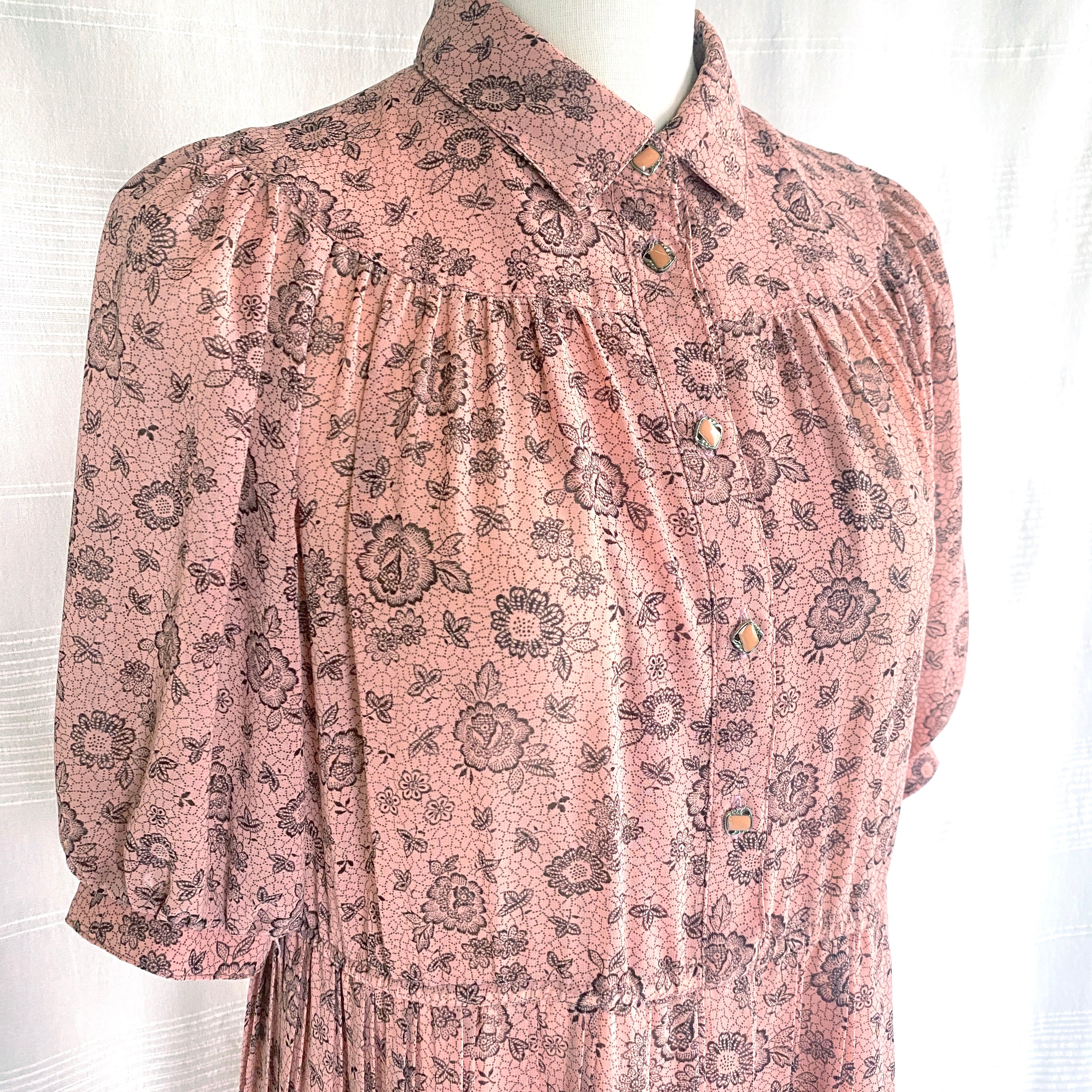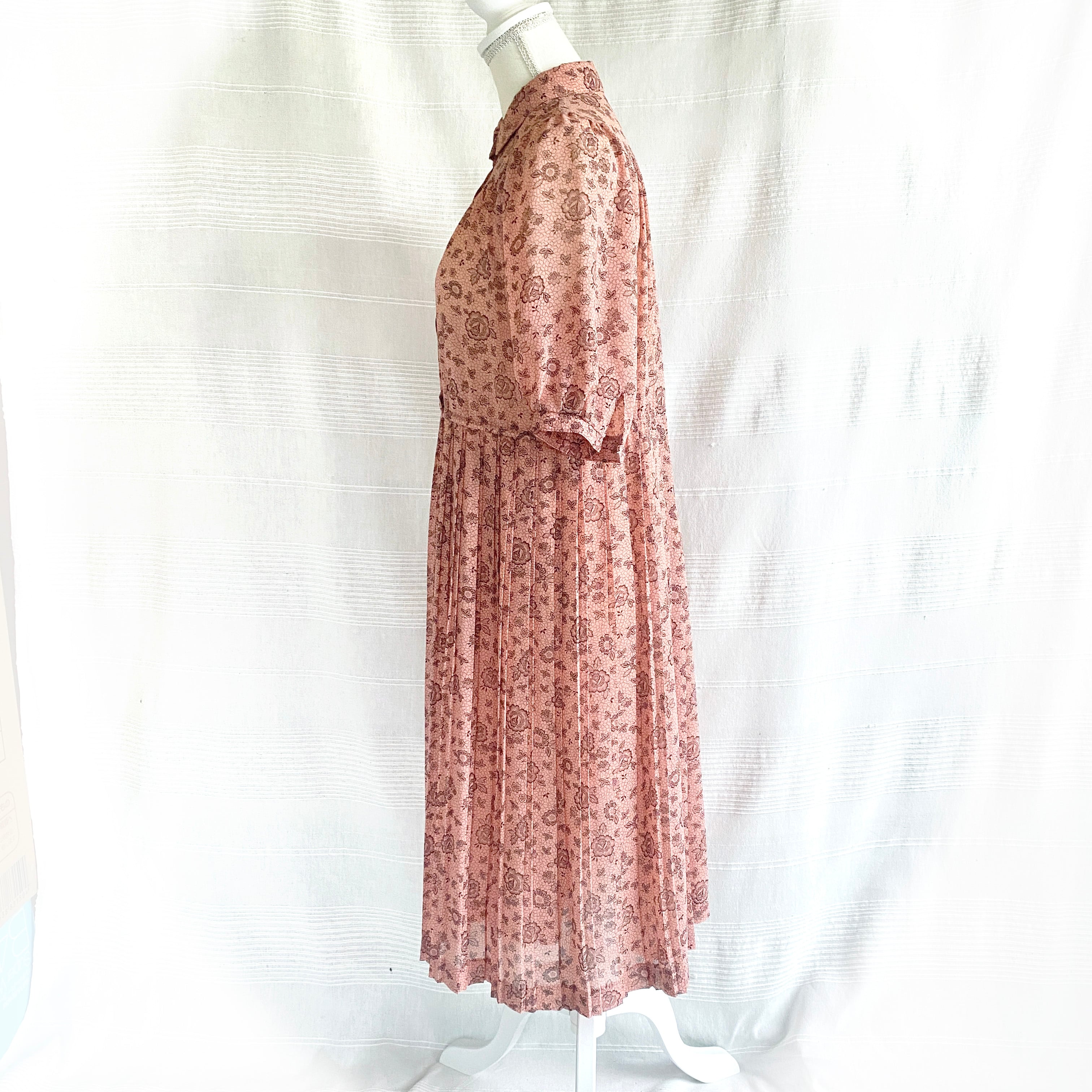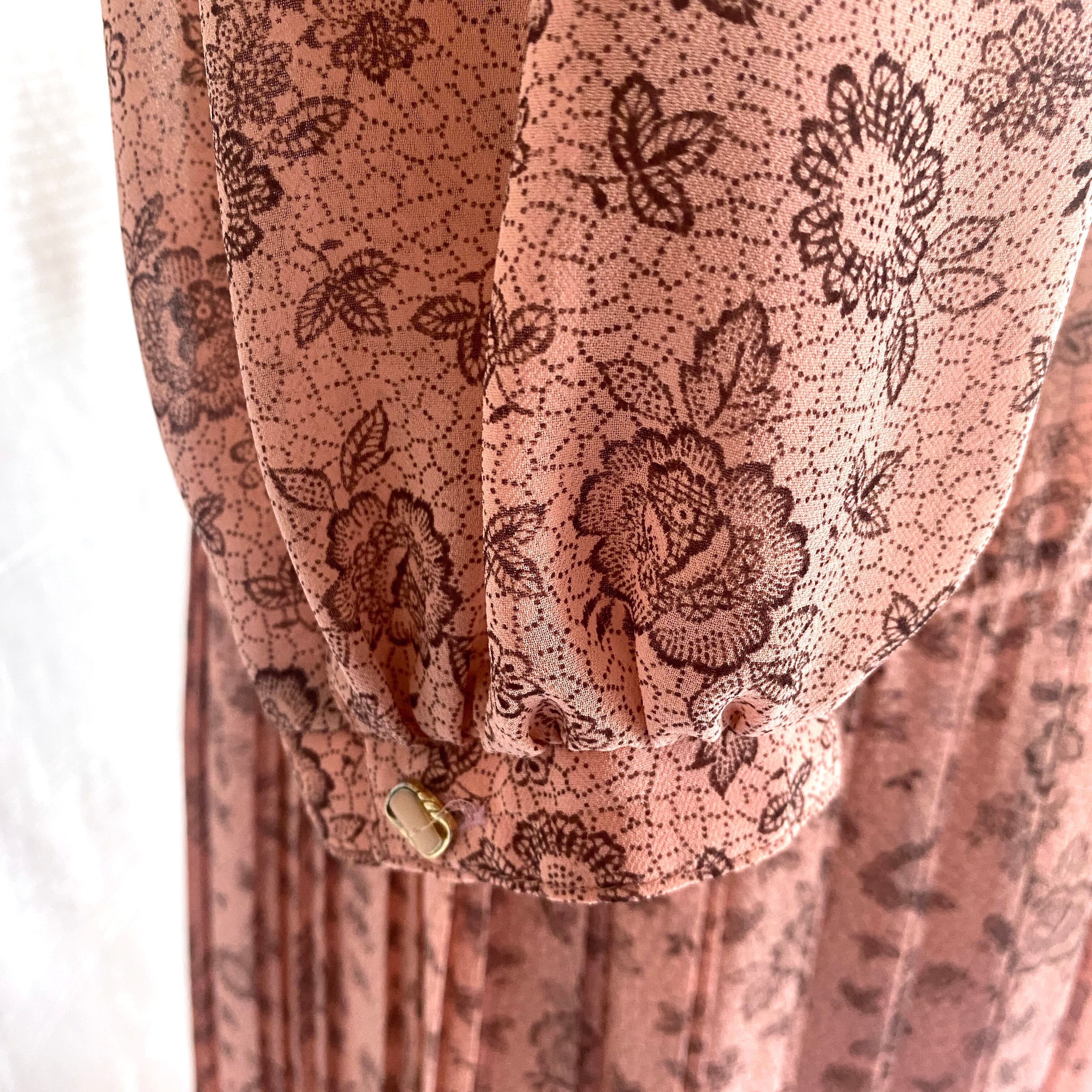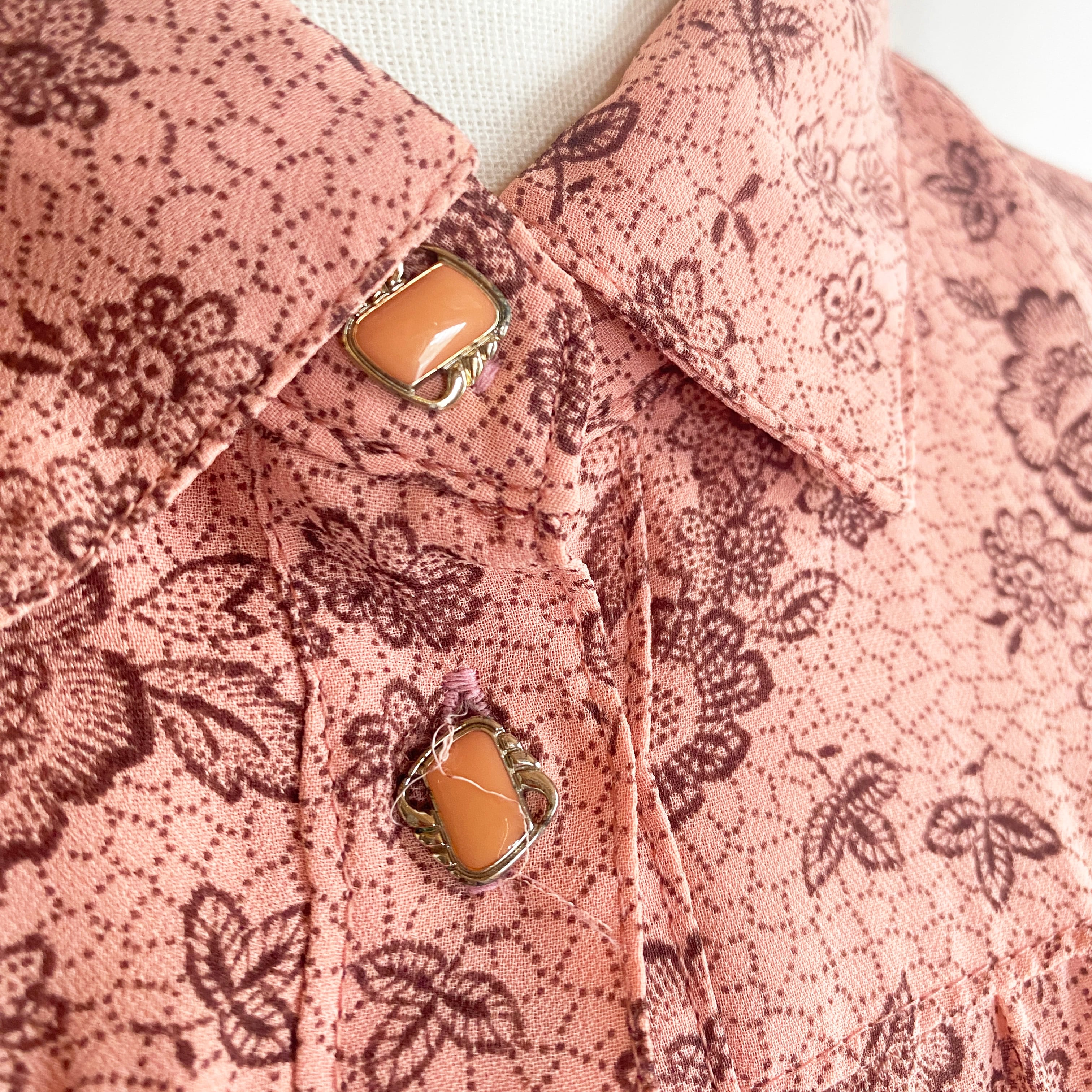 やわらかなピンク地にブラウンでプリントされた、レース模様のような花柄がラブリーなヴィンテージワンピース。