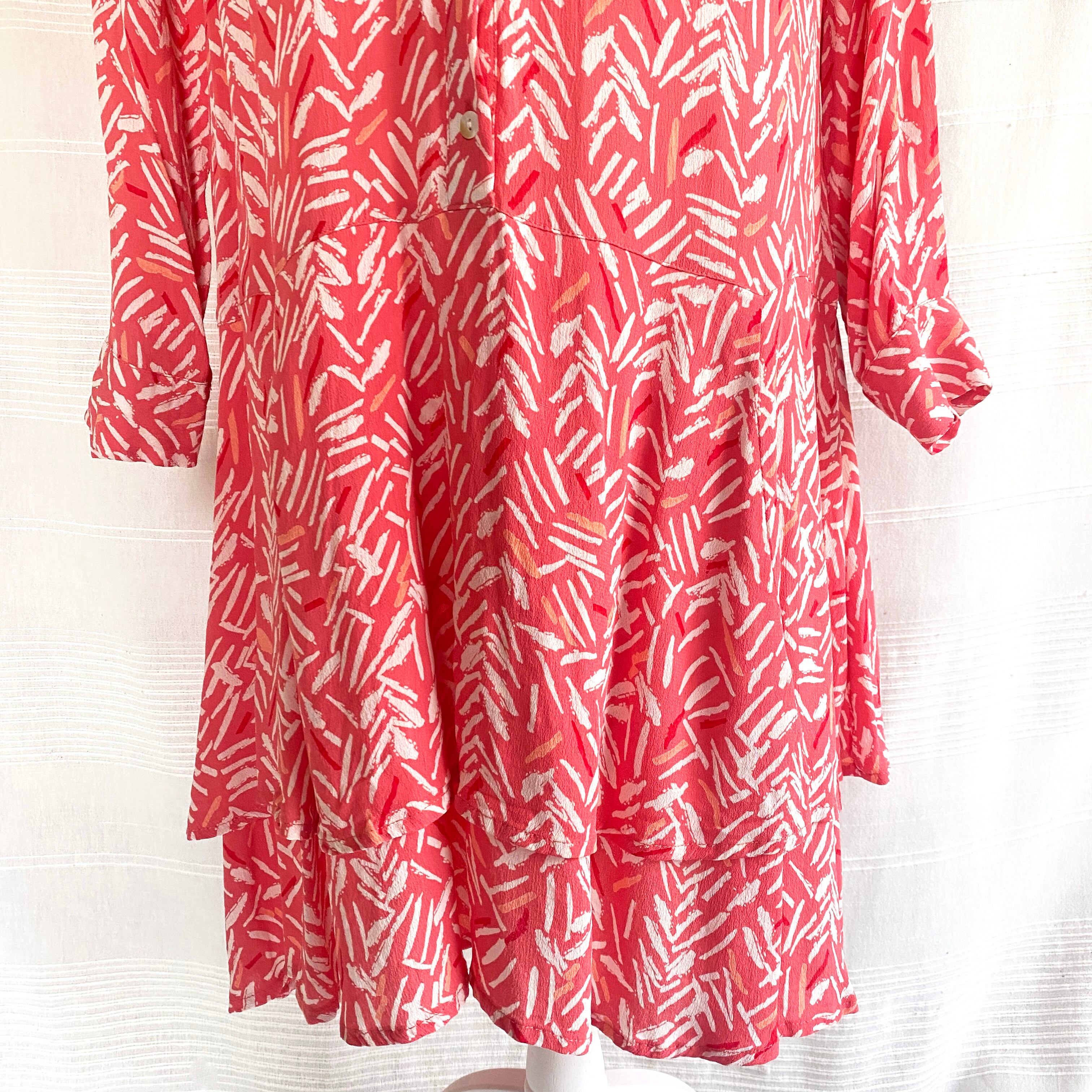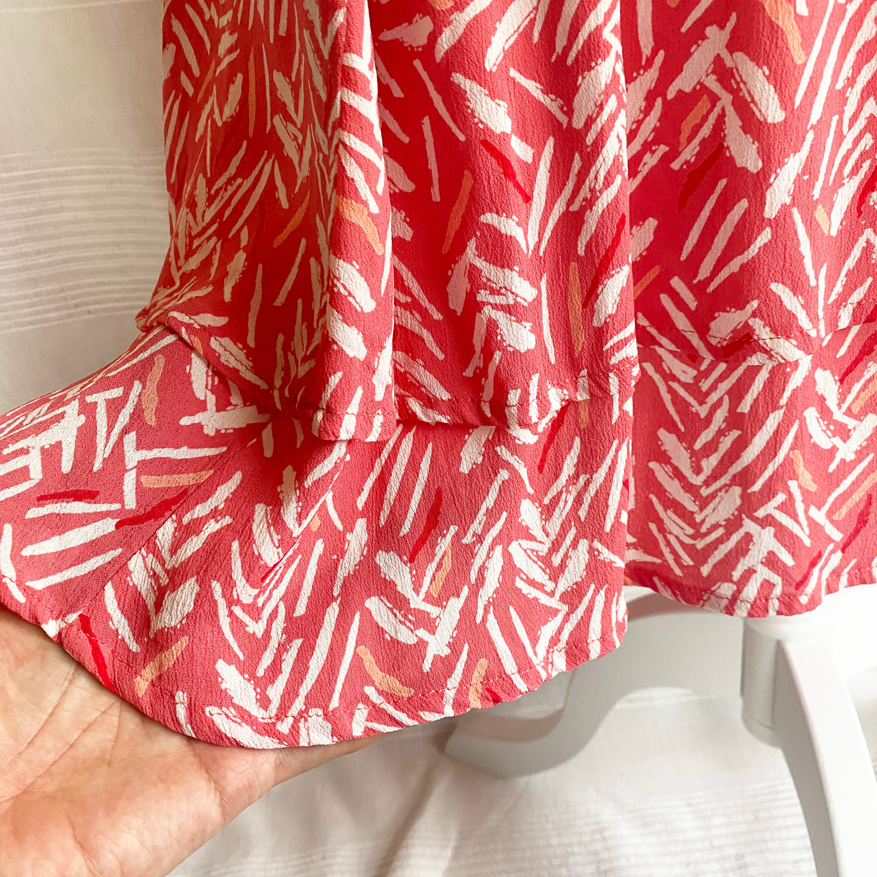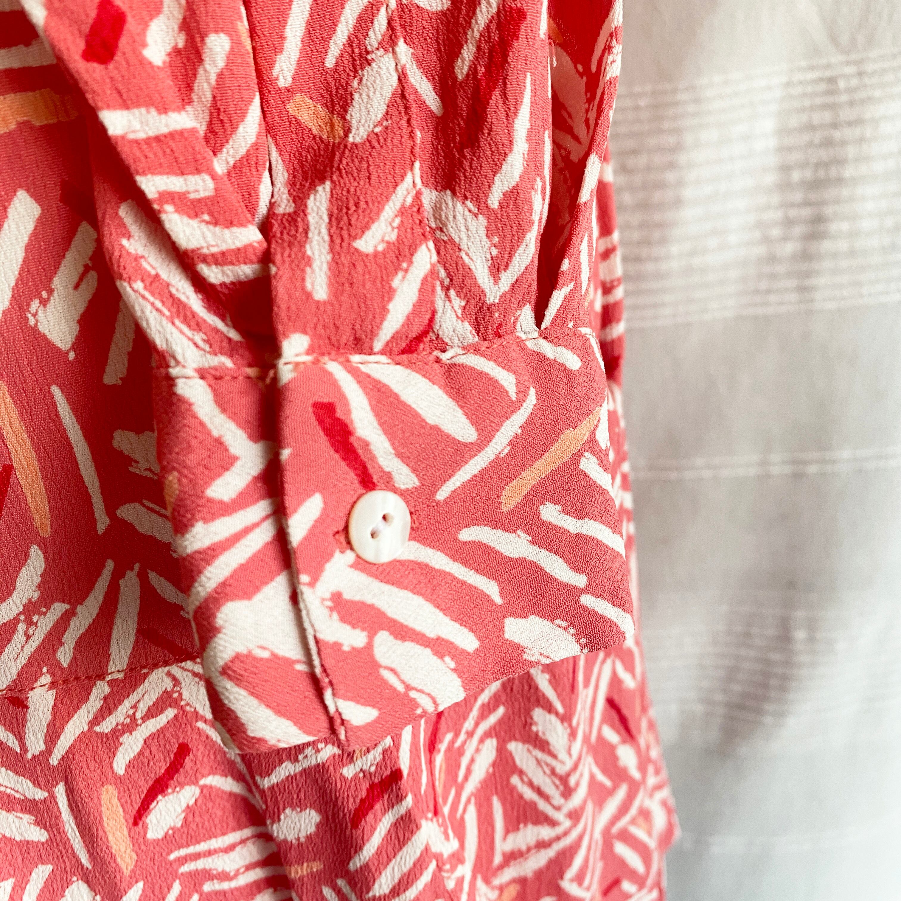 腰の低い位置からの切り替えのフレアのシルエットがかわいい、ピンクに白のプリントのワンピース。